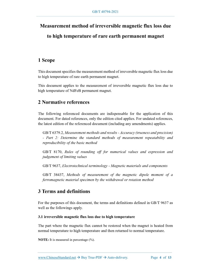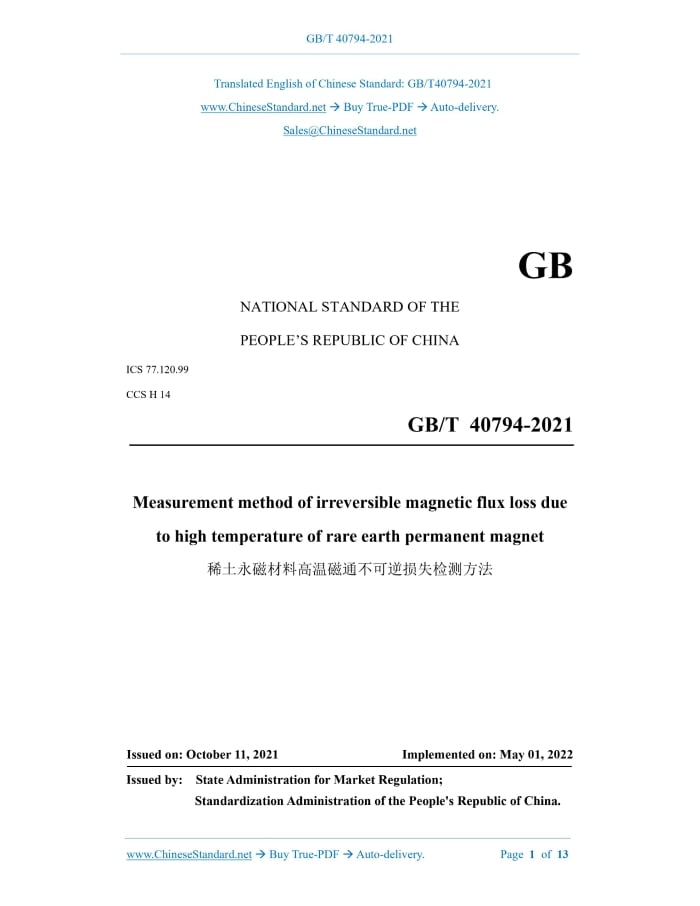 GB/T 40794-2021: Measurement method of irreversible magnetic flux loss due to high temperature of rare earth permanent magnet Delivery: 9 seconds. True-PDF full-copy in English & invoice will be downloaded + auto-delivered via email. See step-by-step procedure Status: Valid