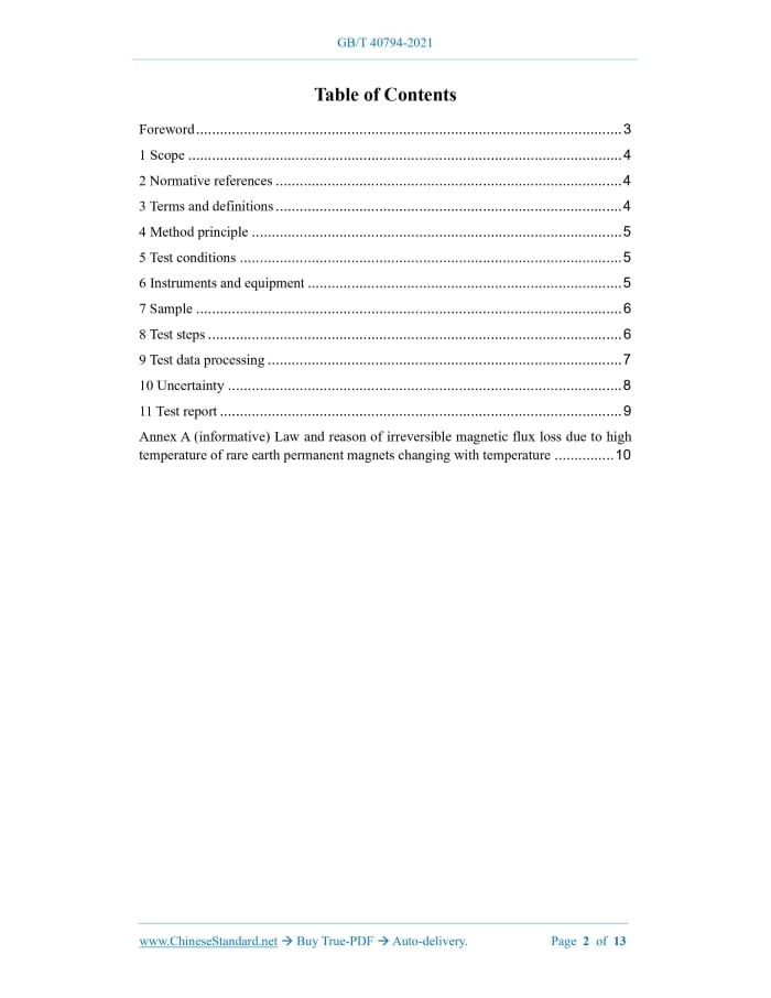 Similar standardsGB/T 40794-2021: Measurement method of irreversible magnetic flux loss due to high temperature of rare earth permanent magnet---This is an excerpt. Full copy of true-PDF in English version (including equations, symbols, images, flow-chart, tables, and figures etc.), auto-downloaded/delivered in 9 seconds, can be purchased online: https://www.ChineseStandard.net/PDF.aspx/GBT40794-2021 GB NATIONAL STANDARD OF THE PEOPLE’S REPUBLIC OF CHINA ICS 77.120.99 CCS H 14 Measurement method of irreversible magnetic flux loss due to high temperature of rare earth permanent magnet ISSUED ON: OCTOBER 11, 2021 IMPLEMENTED ON: MAY 01, 2022 Issued by: State Administration for Market Regulation; Standardization Administration of the People's Republic of China. Table of ContentsForeword ... 3 1 Scope ... 4 2 Normative references ... 4 3 Terms and definitions ... 4 4 Method principle ... 5 5 Test conditions ... 5 6 Instruments and equipment ... 5 7 Sample ... 6 8 Test steps ... 6 9 Test data processing ... 7 10 Uncertainty ... 8 11 Test report ... 9 Annex A (informative) Law and reason of irreversible magnetic flux loss due to high temperature of rare earth permanent magnets changing with temperature ... 10 Measurement method of irreversible magnetic flux loss due to high temperature of rare earth permanent magnet1 ScopeThis document specifies the measurement method of irreversible magnetic flux loss due to high temperature of rare earth permanent magnet. This document applies to the measurement of irreversible magnetic flux loss due to high temperature of NdFeB permanent magnet.2 Normative referencesThe following referenced documents are indispensable for the application of this document. For dated references, only the edition cited applies. For undated references, the latest edition of the referenced document (including any amendments) applies. GB/T 6379.2, Measurement methods and results - Accuracy (trueness and precision) - Part 2: Determine the standard methods of measurement repeatability and reproducibility of the basic method GB/T 8170, Rules of rounding off for numerical values and expression and judgement of limiting values GB/T 9637, Electrotechnical terminology - Magnetic materials and components GB/T 38437, Methods of measurement of the magnetic dipole moment of a ferromagnetic material specimen by the withdrawal or rotation method3 Terms and definitionsFor the purposes of this document, the terms and definitions defined in GB/T 9637 as well as the followings apply. 3.1 irreversible magnetic flux loss due to high temperature The part where the magnetic flux cannot be restored when the magnet is heated from normal temperature to high temperature and then returned to normal temperature. NOTE: It is measured in percentage (%). 3.2 load line The locus of the operating point of a permanent magnet forming part of a given magnetic circuit when the magnitude of its magnetization varies. NOTE: The operating point of a permanent magnet is a point on the demagnetization curve or return line of a permanent magnet forming part of a given magnetic circuit. Its coordinates are the working magnetic flux density and magnetic field strength. [Source: GB/T 9637-2001, 221-04-11] 3.3 high temperature aging The test that the permanent magnet is kept at a certain temperature in the high temperature test box for a period of time, and the high temperature environment is simulated to test the thermal stability.4 Method principleUse Helmholtz coils and fluxmeters, at the same room temperature, to measure the irreversible loss of magnetic flux (magnetic dipole moment) of a magnet with saturated magnetization before and after high temperature aging test. It is expressed in percent.5 Test conditions5.1 Normal temperature magnetic flux test: the ambient temperature is 23℃±3℃. 5.2 Optional temperatures for high temperature aging of NdFeB permanent magnets: 65°C, 85°C, 100°C, 120°C, 150°C, 180°C, 200°C, 250°C. If the customer has special needs, it shall be determined through negotiation between the two parties.6 Instruments and equipment6.1 Magnetic flux measurement device: mainly composed of a fluxmeter and a Helmholtz coil. The maximum display deviation of the fluxmeter shall be less than 1%. 6.2 High temperature test chamber: the inner wall and interlayer of the test chamber shall be made of non-ferromagnetic materials. The high temperature test chamber shall be able to adjust the heating rate and holding time. The maximum temperature deviation of the working space of the test chamber shall be less than 1°C. During the constant temperature period, the temperature fluctuation shall not exceed 1°C.7 Sample7.1 The samples are finished or machined semi-finished permanent magnets. 7.2 The sample shall be saturated and magnetized along the direction of easy magnetization.8 Test steps8.1 Initial flux test Place the sample at room temperature for no less than 2 h after magnetization and saturation. Make sure that the specimen temperature is consistent with room temperature. The sample is placed in the homogeneous space of the Helmholtz coil. The easy magnetization direction of the sample is parallel to the axis of the Helmholtz coil. Then measure the magnetic flux according to the provisions of GB/T 38437. Repeatedly measure each sample for 3 times. Take the average value of the displayed values of magnetic flux (magnetic dipole moment) as the measured value before the test. 8.2 High temperature aging test method and sample placement 8.2.1 Open-circuit mode The test sample needs to be placed in a non-ferromagnetic sample frame. During the test, avoid the sample close to the magnetic material. In order to avoid the mutual adsorption of the samples during the test operation, causing damage to the samples and injuring the test personnel, it is necessary to customize a special sample frame or a fixing scheme with the same effect. If the aluminum alloy plate is fixed with high- temperature-resistant adhe