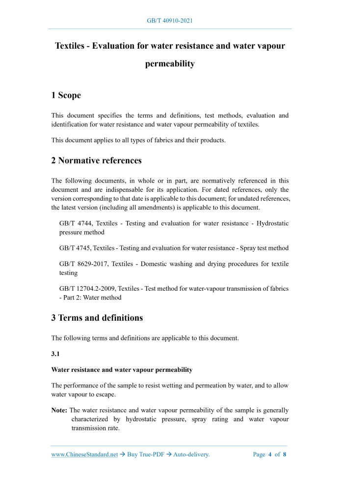 Similar standardsGB/T 40910-2021: Textiles - Evaluation for water resistance and water vapour permeability---This is an excerpt. Full copy of true-PDF in English version (including equations, symbols, images, flow-chart, tables, and figures etc.), auto-downloaded/delivered in 9 seconds, can be purchased online: https://www.ChineseStandard.net/PDF.aspx/GBT40910-2021GB NATIONAL STANDARD OF THE PEOPLE’S REPUBLIC OF CHINA ICS 59.080.30 CCS W 04 Textiles - Evaluation for water resistance and water vapour permeability ISSUED ON: OCTOBER 11, 2021 IMPLEMENTED ON: MAY 01, 2022 Issued by: State Administration for Market Regulation; Standardization Administration of the People’s Republic of China. Table of ContentsForeword ... 3 1 Scope ... 4 2 Normative references ... 4 3 Terms and definitions ... 4 4 Sampling and sample preparation ... 5 5 Test methods ... 5 6 Evaluation and identification ... 6 7 Test report ... 7 References ... 8 Textiles - Evaluation for water resistance and water vapour permeability1 ScopeThis document specifies the terms and definitions, test methods, evaluation and identification for water resistance and water vapour permeability of textiles. This document applies to all types of fabrics and their products.2 Normative referencesThe following documents, in whole or in part, are normatively referenced in this document and are indispensable for its application. For dated references, only the version corresponding to that date is applicable to this document; for undated references, the latest version (including all amendments) is applicable to this document. GB/T 4744, Textiles - Testing and evaluation for water resistance - Hydrostatic pressure method GB/T 4745, Textiles - Testing and evaluation for water resistance - Spray test method GB/T 8629-2017, Textiles - Domestic washing and drying procedures for textile testing GB/T 12704.2-2009, Textiles - Test method for water-vapour transmission of fabrics - Part 2: Water method3 Terms and definitionsThe following terms and definitions are applicable to this document. 3.1 Water resistance and water vapour permeability The performance of the sample to resist wetting and permeation by water, and to allow water vapour to escape. Note: The water resistance and water vapour permeability of the sample is generally characterized by hydrostatic pressure, spray rating and water vapour transmission rate. 3.2 Hydrostatic pressure The pressure per unit area of a sample when it is permeated by liquid water. 3.3 Spray rating The degree to which a fabric surface resists wetting by water. [Source: GB/T 4745-2012, 3.2] 3.4 Water vapour transmission rate WVT The mass of water vapour passing through the unit area of the sample vertically within the specified time, under the condition of keeping the specified temperature and humidity on both sides of the sample, in grams per square meter hour [g/(m2·h)] or grams per square meter 24 hours [g /(m2·24h)]. [Source: GB/T 12704.2-2009, 3.1]4 Sampling and sample preparation4.1 The method and quantity of sample collection shall be carried out according to the product standard. For fabrics, each full-width fabric of more than 1.5 m cut, during sampling, shall be more than 15 cm from the edge of the fabric, and more than 2 m from the edge shall be avoided; for products, it shall be at least 2 units. Note: The unit can be pieces, sets, strips, etc. 4.2 Cut representative samples -- which meet the test requirements of hydrostatic pressure, spray rating and water vapour transmission rate -- from the item. The samples shall avoid defects, stains and wrinkles that affect the test results. For products, samples for hydrostatic pressure shall be taken from different fabrics that meet the test requirements; samples for hydrostatic pressure at the seam shall be taken from the seam tape at the flat part.5 Test methods5.1 Hydrostatic pressure ......Source: Above contents are excerpted from the full-copy PDF -- translated/reviewed by: www.ChineseStandard.net / Wayne Zheng et al. Tips & Frequently Asked Questions:Question 1: How long will the true-PDF of English version of GB/T 40910-2021 be delivered?Answer: The full copy PDF of English version of GB/T 40910-2021 can be downloaded in 9 seconds, and it will also be emailed to you in 9 seconds (double mechanisms to ensure the delivery reliably), with PDF-invoice.Question 2: Can I share the purchased PDF of GB/T 40910-2021_English with my colleagues?Answer: Yes. The purchased PDF of GB/T 40910-2021_English will be deemed to be sold to your employer/organization who actually paid for it, including your colleagues and your employer's intranet.Question 3: Does the price include tax/VAT?Answer: Yes. Our tax invoice, downloaded/delivered in 9 seconds, includes all tax/VAT and complies with 100+ countries' tax regulations (tax exempted in 100+ countries) -- See Avoidance of Double Taxation Agreements (DTAs): List of DTAs signed between Singapore and 100+ countriesQuestion 4: Do you accept my currency other than USD?Answer: Yes. www.ChineseStandard.us -- GB/T 40910-2021 -- Click this link and select your country/currency to pay, the exact amount in your currency will be printed on the invoice. Full PDF will also be downloaded/emailed in 9 seconds.How to buy and download a true PDF of English version of GB/T 40910-2021?A step-by-step guide to download PDF of GB/T 40910-2021_EnglishStep 1: Visit website https://www.ChineseStandard.net (Pay in USD), or https://www.ChineseStandard.us (Pay in any currencies such as Euro, KRW, JPY, AUD).Step 2: Search keyword "GB/T 40910-2021". Step 3: Click "Add to Cart". If multiple PDFs are required, repeat steps 2 and 3 to add up to 12 PDFs to cart. Step 4: Select payment option (Via payment agents Stripe or PayPal). Step 5: Customize Tax Invoice -- Fill up your email etc. Step 6: Click "Checkout". Step 7: Make payment by credit card, PayPal, Google Pay etc. After the payment is completed and in 9 seconds, you will receive 2 emails attached with