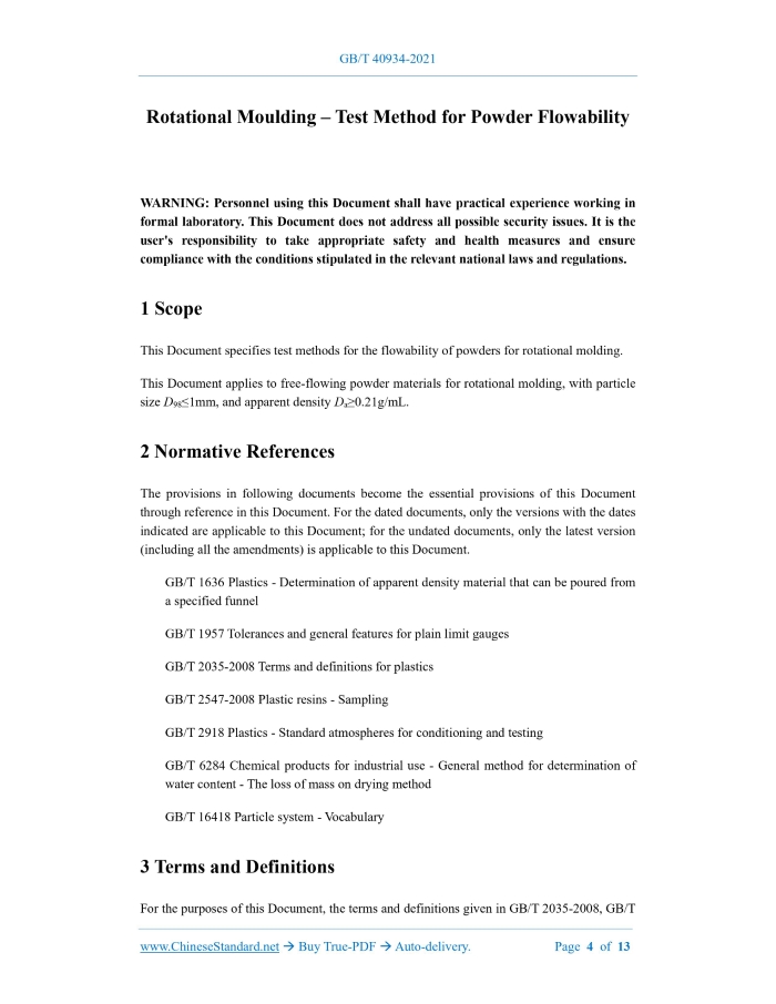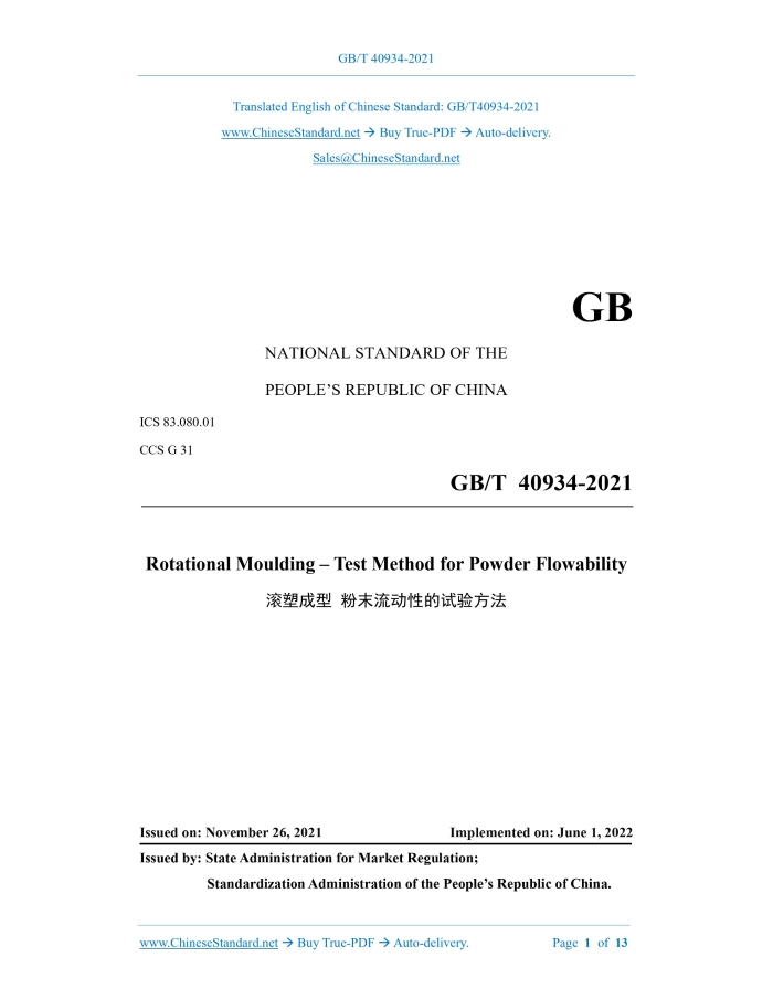 GB/T 40934-2021: Rotational moulding - Test method for powder flowability Delivery: 9 seconds. True-PDF full-copy in English & invoice will be downloaded + auto-delivered via email. See step-by-step procedure Status: Valid