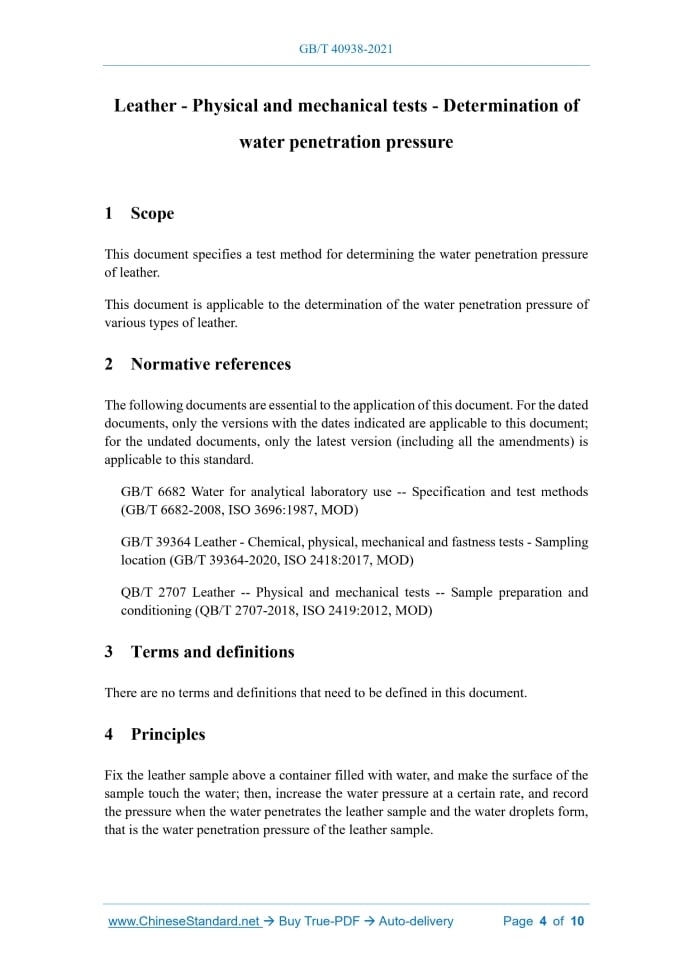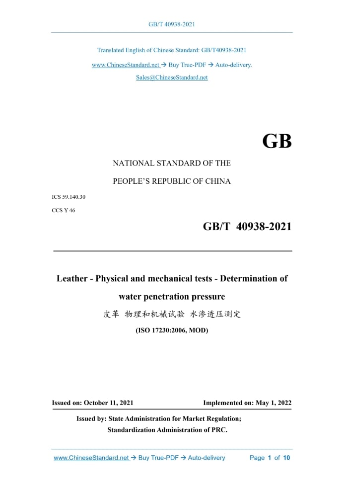 GB/T 40938-2021: Leather - Physical and mechanical tests - Determination of water penetration pressure Delivery: 9 seconds. True-PDF full-copy in English & invoice will be downloaded + auto-delivered via email. See step-by-step procedure Status: Valid