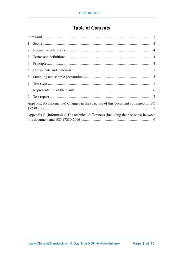 Similar standardsGB/T 40938-2021: Leather - Physical and mechanical tests - Determination of water penetration pressure---This is an excerpt. Full copy of true-PDF in English version (including equations, symbols, images, flow-chart, tables, and figures etc.), auto-downloaded/delivered in 9 seconds, can be purchased online: https://www.ChineseStandard.net/PDF.aspx/GBT40938-2021 NATIONAL STANDARD OF THE PEOPLE’S REPUBLIC OF CHINA ICS 59.140.30 CCS Y 46 Leather - Physical and mechanical tests - Determination of water penetration pressure (ISO 17230:2006, MOD) ISSUED ON: OCTOBER 11, 2021 IMPLEMENTED ON: MAY 1, 2022 Issued by: State Administration for Market Regulation; Standardization Administration of PRC. Table of ContentsForeword ... 3 1 Scope ... 4 2 Normative references ... 4 3 Terms and definitions ... 4 4 Principles ... 4 5 Instruments and materials ... 5 6 Sampling and sample preparation ... 5 7 Test steps ... 6 8 Representation of the result ... 6 9 Test report ... 7 Appendix A (Informative) Changes in the structure of this document compared to ISO 17230:2006 ... 8 Appendix B (Informative) The technical differences (including their reasons) between this document and ISO 17230:2006 ... 9 Leather - Physical and mechanical tests - Determination of water penetration pressure1 ScopeThis document specifies a test method for determining the water penetration pressure of leather. This document is applicable to the determination of the water penetration pressure of various types of leather.2 Normative referencesThe following documents are essential to the application of this document. For the dated documents, only the versions with the dates indicated are applicable to this document; for the undated documents, only the latest version (including all the amendments) is applicable to this standard. GB/T 6682 Water for analytical laboratory use -- Specification and test methods (GB/T 6682-2008, ISO 3696:1987, MOD) GB/T 39364 Leather - Chemical, physical, mechanical and fastness tests - Sampling location (GB/T 39364-2020, ISO 2418:2017, MOD) QB/T 2707 Leather -- Physical and mechanical tests -- Sample preparation and conditioning (QB/T 2707-2018, ISO 2419:2012, MOD)3 Terms and definitionsThere are no terms and definitions that need to be defined in this document.4 PrinciplesFix the leather sample above a container filled with water, and make the surface of the sample touch the water; then, increase the water pressure at a certain rate, and record the pressure when the water penetrates the leather sample and the water droplets form, that is the water penetration pressure of the leather sample. requirements for humidity. The sample does not need to be adjusted in the air. If required by the relevant parties, the test can also be carried out after the adjustment of the humidity; the adjustment shall be indicated in the test report.7 Test steps7.1 Fill the water cup (5.1) with distilled water or deionized water (5.5), do that at the specified temperature (see 6.3). 7.2 Put the leather sample on the water cup and make its surface (the exposed surface when it is used) touch the water; fix the sample with a hard wire mesh. Note: The hard wire mesh is used to prevent the swelling of the leather sample during the test. 7.3 Apply pressure to the water and make the pressure increase evenly at a rate of (3±0.3) kPa/min until the end of the test. 7.4 Observe the side of the leather sample that is not in direct contact with the water. When the water penetrates the leather sample to form the third drop of water, record the water pressure at this time, that is the water penetration pressure of the sample. Note 1: Take the formation of the third drop of water (not the first drop) as the end point, to avoid some larger capillaries on the sample affecting the results. Note 2: If the waterproof performance of the leather sample is poor, then after testing, the side of the sample that is not in direct contact with water will be wet, instead of the appearance of the discrete water droplets. At this time, the results are not reliable, and this method is not applicable. If the test result is < 2.5 kPa, then the test result is ineffective for comparing the water repellency between leather samples. Note 3: Do not consider the fine water droplets that no longer expand after penetrating the sample. Do not count the continuous water droplets that form at the same part of the sample. Note 4: During the test, if the sample bulges, or the water spurts due to the sample cracking, record the pressure value at this time, and explain in detail in the report. 7.5 When the water pressure increases to (65 ± 0.3) kPa, if the third drop of water does not form on the side of the sample that is not in direct contact with water, then the test ends.8 Representation of the result8.1 Record the water penetration pressure of the sample, it shall be accurate to 0.1 kPa. If in the normal test process, the water pressure increases to (65±0.3) kPa, and the third drop of water does not form on the side of the leather sample that is not in direct contact with water, then record the test result as “water penetration pressure >65 kPa”. 8.2 If the side of the sample that is not in direct contact with water becomes wet, it shall be specified in the test report; there is no need to record the water penetration pressure. Note: Sometimes, the water penetration pressure is expressed in millimeters of mercury (mmHg) or centimeters of mercury (cmHg). If these units are used in the test report, The conversion relationship between the three is 1 kPa=7.5 mmHg=0.75 cmHg.9 Test reportThe test report shall contain the following: a) The number of this document; b) The detailed information of the sample; if the sampling is inconsistent with GB/T 39364, explain the situation; c) The test temperature, (20±2) °C or (23±2) °C; d) The water penetration pressure of each sample, in kilopascals (kPa), millimeters of mercury (mmHg) or centimeters of mercury (cmH