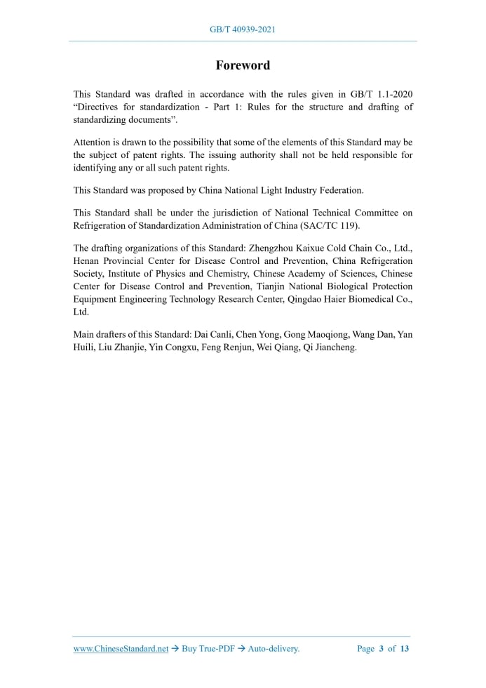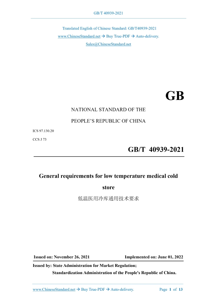 Similar standardsGB/T 40939-2021: General requirements for low temperature medical cold store---This is an excerpt. Full copy of true-PDF in English version (including equations, symbols, images, flow-chart, tables, and figures etc.), auto-downloaded/delivered in 9 seconds, can be purchased online: https://www.ChineseStandard.net/PDF.aspx/GBT40939-2021NATIONAL STANDARD OF THE PEOPLE’S REPUBLIC OF CHINA ICS 97.130.20 CCS J 73 General requirements for low temperature medical cold store ISSUED ON: NOVEMBER 26, 2021 IMPLEMENTED ON: JUNE 01, 2022 Issued by: State Administration for Market Regulation; Standardization Administration of the People's Republic of China. Table of ContentsForeword ... 3 1 Scope ... 4 2 Normative references ... 4 3 Terms and definitions... 4 4 Basic requirements ... 5 5 Environmental and hygiene requirements ... 7 6 Safety requirements ... 8 7 Component requirements ... 8 8 Assembly requirements ... 9 9 Tests ... 9ForewordThis Standard was drafted in accordance with the rules given in GB/T 1.1-2020 “Directives for standardization - Part 1: Rules for the structure and drafting of standardizing documents”. Attention is drawn to the possibility that some of the elements of this Standard may be the subject of patent rights. The issuing authority shall not be held responsible for identifying any or all such patent rights. This Standard was proposed by China National Light Industry Federation. This Standard shall be under the jurisdiction of National Technical Committee on Refrigeration of Standardization Administration of China (SAC/TC 119). The drafting organizations of this Standard: Zhengzhou Kaixue Cold Chain Co., Ltd., Henan Provincial Center for Disease Control and Prevention, China Refrigeration Society, Institute of Physics and Chemistry, Chinese Academy of Sciences, Chinese Center for Disease Control and Prevention, Tianjin National Biological Protection Equipment Engineering Technology Research Center, Qingdao Haier Biomedical Co., Ltd. Main drafters of this Standard: Dai Canli, Chen Yong, Gong Maoqiong, Wang Dan, Yan Huili, Liu Zhanjie, Yin Congxu, Feng Renjun, Wei Qiang, Qi Jiancheng. General requirements for low temperature medical cold store1 ScopeThis Standard specifies the basic requirements, environmental and hygiene requirements, safety requirements, component requirements, assembly requirements and test methods for low temperature medical cold store. The Standard is applicable to low temperature non-walk-in indoor prefabricated cold store for medical samples, biological agents, biological samples, of which the nominal volume is not more than 300m3, that is of mechanical refrigeration (hereinafter referred to as the low temperature medical cold store). The low temperature cold store for storing other special goods shall be implemented by reference.2 Normative referencesThe following referenced documents are indispensable for the application of this document. For dated references, only the edition cited applies. For undated references, the latest edition of the referenced document (including any amendments) applies. GB 3096, Environmental quality standard for noise GB/T 3785.1, Electroacoustics - Sound level meters - Part 1: Specifications GB/T 9237, Refrigerating systems and heat pumps - Safety and environmental requirements GB/T 18883, Indoor air quality standards JB/T 6527, The sandwich panel use for prefab cold store SBJ 14, Code for installation and acceptance of refrigerating system with HCFC, HFC refrigerant IEC 61010-1, Safety requirements for electrical equipment for measurement, control, and laboratory use - Part 1: General requirements3 Terms and definitionsFor the purposes of this document, the following terms and definitions apply. 3.1 low temperature medical cold store The non-walk-in indoor prefabricated cold store that the temperature range is -186℃~- 40℃, that is used for low temperature test or low temperature storage, preservation of medical samples, biological agents, biological samples and special materials. 3.2 biological sample Any substance obtained or derived from living organisms such as humans, animals, plants, microorganisms or non-animal/vegetable multicellular organisms such as brown algae and fungi. 3.3 non walk-in cold store The cold store that no personnel is allowed in daily operation. 3.4 cooling-down time Under the specified test conditions, the time required for the average temperature of each measurement point to reach the specified temperature when the low temperature medical cold store runs continuously under no-load condition.4 Basic requirements4.1 The low temperature medical cold store shall be manufactured and installed in accordance with this document and the drawings and technical documents of the professional designer. Special requirements shall be required in the contract or agreement. Supplementary provisions or explanations shall be made in the corresponding technical documents. 4.2 Environmental protection materials shall be adopted for the used envelope structure, thermal insulation materials and refrigeration system thermal insulation materials. 4.3 The low temperature medical cold store shall have independent double door lock storage door and equipment with double management function. 4.4 The low temperature medical cold store shall have a backup refrigeration device, so as to ensure that the storage temperature requirements are met under the condition of refrigeration system failure. 4.5 The low temperature medical cold store shall have all-weather, full-time remote monitoring and information alarm functions. It shall have control and rights management functions. 4.6 The storage temperature shall meet the requirements of Table 1. 4.12 The resolution of the pressure measuring device shall not be greater than 0.01MPa. The measurement error shall not be greater than 0.01MPa. 4.13 The temperature and pressure data of the refrigeration system shall have a display function. It shall be automated a