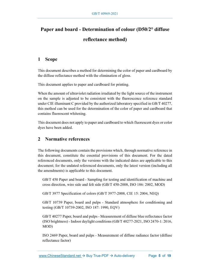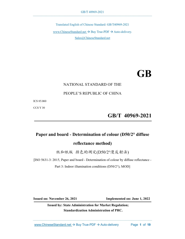 GB/T 40969-2021: Paper and board - Determination of colour (D50/2° diffuse reflectance method) Delivery: 9 seconds. True-PDF full-copy in English & invoice will be downloaded + auto-delivered via email. See step-by-step procedure Status: Valid