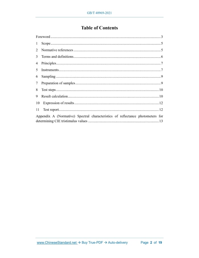 Similar standardsGB/T 40969-2021: Paper and board - Determination of colour (D50/2° diffuse reflectance method)---This is an excerpt. Full copy of true-PDF in English version (including equations, symbols, images, flow-chart, tables, and figures etc.), auto-downloaded/delivered in 9 seconds, can be purchased online: https://www.ChineseStandard.net/PDF.aspx/GBT40969-2021GB NATIONAL STANDARD OF THE PEOPLE’S REPUBLIC OF CHINA ICS 85.060 CCS Y 30 Paper and board - Determination of colour (D50/2° diffuse reflectance method) [ISO 5631-3: 2015, Paper and board - Determination of colour by diffuse reflectance - Part 3: Indoor illumination conditions (D50/2°), MOD] ISSUED ON: NOVEMBER 26, 2021 IMPLEMENTED ON: JUNE 1, 2022 Issued by: State Administration for Market Regulation; Standardization Administration of PRC. Table of ContentsForeword ... 3 1 Scope ... 5 2 Normative references ... 5 3 Terms and definitions ... 6 4 Principles ... 7 5 Instruments ... 7 6 Sampling ... 9 7 Preparation of samples ... 9 8 Test steps ... 10 9 Result calculation ... 10 10 Expression of results ... 12 11 Test report ... 12 Appendix A (Normative) Spectral characteristics of reflectance photometers for determining CIE tristimulus values ... 13 Paper and board - Determination of colour (D50/2° diffuse reflectance method)1 ScopeThis document describes a method for determining the color of paper and cardboard by the diffuse reflectance method with the elimination of gloss. This document applies to paper and cardboard for printing. When the amount of ultraviolet radiation irradiated by the light source of the instrument on the sample is adjusted to be consistent with the fluorescence reference standard under CIE illuminant C provided by the authorized laboratory specified in GB/T 40277, this method can be used for the determination of the color of paper and cardboard that contains fluorescent whitening. This document does not apply to paper and cardboard to which fluorescent dyes or color dyes have been added.2 Normative referencesThe following documents contain the provisions which, through normative reference in this document, constitute the essential provisions of this document. For the dated referenced documents, only the versions with the indicated dates are applicable to this document; for the undated referenced documents, only the latest version (including all the amendments) is applicable to this document. GB/T 450 Paper and board - Sampling for testing and identification of machine and cross direction, wire side and felt side (GB/T 450-2008, ISO 186: 2002, MOD) GB/T 3977 Specification of colors (GB/T 3977-2008, CIE 15: 2004, NEQ) GB/T 10739 Paper, board and pulps - Standard atmosphere for conditioning and testing (GB/T 10739-2002, ISO 187: 1990, EQV) GB/T 40277 Paper, board and pulps - Measurement of diffuse blue reflectance factor (ISO brightness) - Indoor daylight conditions (GB/T 40277-2021, ISO 2470-1: 2016, MOD) ISO 2469 Paper, board and pulps - Measurement of diffuse radiance factor (diffuse reflectance factor) of the sample. Note: The reflectance factor of a transparent specimen depends on the backing, not material properties. 3.5 X, Y, Z tristimulus values In a given trichromatic system, the amounts of three reference color stimuli that match the color of the stimulus under study. Note 1: In this document, the CIE illuminant D50 and CIE 1931 (2°) standard observer are used for defining the trichromatic system. Note 2: According to CIE convention, when the CIE 1931 (2°) standard observer is used, the obtained tristimulus values have no subscript [when the CIE 1964 (10°) standard observer is used, the obtained tristimulus values have the subscript 10]. 3.6 CIELAB colour space The approximately uniform three-dimensional colour space that is drawn by rectangular coordinates, and the magnitudes of L*, a*, and b* are specified by the formulas given in Chapter 9. Note: The value of L* represents the measured brightness of the sample, L*=0 corresponds to the sample that is black, and L*=100 corresponds to the sample that is a perfect diffuse reflection surface. The values of a* and b* represent the red-green and yellow-blue directions on the coordinates, respectively. Thus, +a* is a measure of the redness of the sample; -a* is a measure of the greenness of the sample; +b* is a measure of the yellowness of the sample; -b* is a measure of the blueness of the sample. If both a* and b* are 0, the sample is gray.4 PrinciplesUnder the specified ultraviolet irradiation conditions, a tristimulus filter-type reflection photometer or an abridged spectrophotometer is used to analyze the reflected light on the sample, and the color coordinates under the condition of D50/2° are calculated.5 Instruments5.1 Reflection photometer 5.1.1 General rules The geometric, spectral, and photometric characteristics of the reflection photometer shall comply with the provisions of ISO 2469, and it shall be calibrated according to ISO 2469. As described in GB/T 40277, when samples containing fluorescent brighteners are tested, the reflectance photometer shall be equipped with a radiation source with adjustable UV content. The UV conditions shall be adjusted to be consistent with the CIE illuminant C with the use of a reference standard. 5.1.2 Filter-type reflectance photometer For a filter-type reflectance photometer, the overall response given by the combination of filters and the instrument’s optical characteristics is equivalent to the CIE tristimulus values X, Y, and Z of the sample under the conditions of CIE illuminant D50 and CIE 1931 standard colorimetric system. When a filter-type reflectance photometer is used, the UV content irradiated on the sample shall be consistent with that of the CIE illuminant C. 5.1.3 Abridged spectrophotometer When the samples are tested under CIE illuminant D50 with an abridged spectrophotometer, one of the functions allows the CIE tristimulus values X, Y, and Z of the tested sample under the 