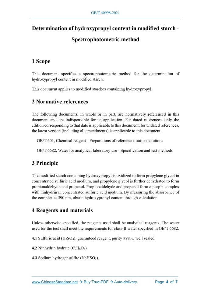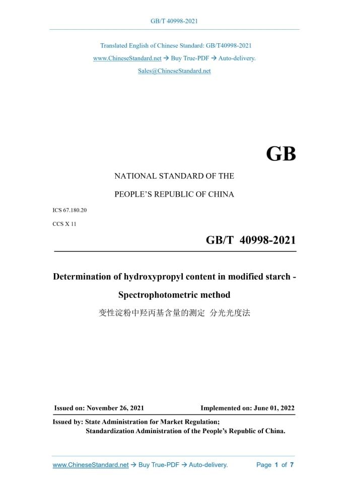 GB/T 40998-2021: Determination of hydroxypropyl content in modified starch - Spectrophotometric method Delivery: 9 seconds. True-PDF full-copy in English & invoice will be downloaded + auto-delivered via email. See step-by-step procedure Status: Valid