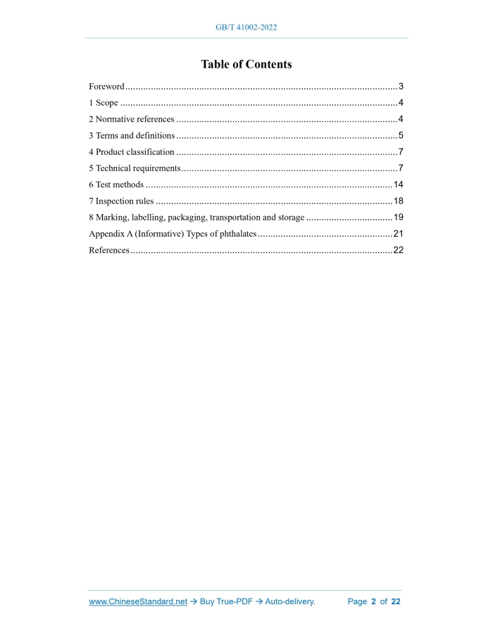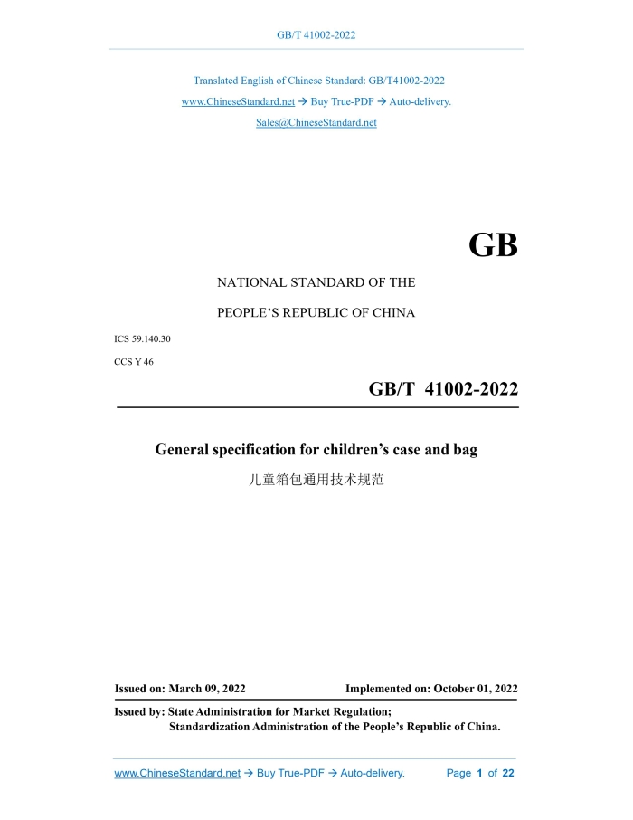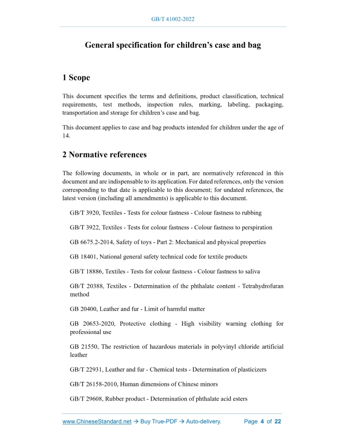 Similar standardsGB/T 41002-2022: General specification for children’s case and bag---This is an excerpt. Full copy of true-PDF in English version (including equations, symbols, images, flow-chart, tables, and figures etc.), auto-downloaded/delivered in 9 seconds, can be purchased online: https://www.ChineseStandard.net/PDF.aspx/GBT41002-2022GB NATIONAL STANDARD OF THE PEOPLE’S REPUBLIC OF CHINA ICS 59.140.30 CCS Y 46 General specification for children’s case and bag ISSUED ON: MARCH 09, 2022 IMPLEMENTED ON: OCTOBER 01, 2022 Issued by: State Administration for Market Regulation; Standardization Administration of the People’s Republic of China. Table of ContentsForeword ... 3 1 Scope ... 4 2 Normative references ... 4 3 Terms and definitions ... 5 4 Product classification ... 7 5 Technical requirements ... 7 6 Test methods ... 14 7 Inspection rules ... 18 8 Marking, labelling, packaging, transportation and storage ... 19 Appendix A (Informative) Types of phthalates ... 21 References ... 22 General specification for children’s case and bag1 ScopeThis document specifies the terms and definitions, product classification, technical requirements, test methods, inspection rules, marking, labeling, packaging, transportation and storage for children’s case and bag. This document applies to case and bag products intended for children under the age of 14.2 Normative referencesThe following documents, in whole or in part, are normatively referenced in this document and are indispensable to its application. For dated references, only the version corresponding to that date is applicable to this document; for undated references, the latest version (including all amendments) is applicable to this document. GB/T 3920, Textiles - Tests for colour fastness - Colour fastness to rubbing GB/T 3922, Textiles - Tests for colour fastness - Colour fastness to perspiration GB 6675.2-2014, Safety of toys - Part 2: Mechanical and physical properties GB 18401, National general safety technical code for textile products GB/T 18886, Textiles - Tests for colour fastness - Colour fastness to saliva GB/T 20388, Textiles - Determination of the phthalate content - Tetrahydrofuran method GB 20400, Leather and fur - Limit of harmful matter GB 20653-2020, Protective clothing - High visibility warning clothing for professional use GB 21550, The restriction of hazardous materials in polyvinyl chloride artificial leather GB/T 22931, Leather and fur - Chemical tests - Determination of plasticizers GB/T 26158-2010, Human dimensions of Chinese minors GB/T 29608, Rubber product - Determination of phthalate acid esters Parts or components that are intended to be disassembled without tools without destroying the case and bag. [Source: GB 6675.1-2014, 3.18, modified] 3.3 Hazardous sharp edge Accessible edges that are likely to cause unreasonable harm to a child during normal use or reasonably foreseeable abuse. [Source: GB 6675.2-2014, 3.24, modified] 3.4 Hazardous sharp point Accessible points that are likely to cause unreasonable harm to a child during normal use or reasonably foreseeable abuse. [Source: GB 6675.2-2014, 3.25, modified] 3.5 Pulling rope Ropes, drawstrings, etc. – made of various textile or non-textile materials, of a certain length – designed for adults to pull children to prevent children from getting lost. 3.6 Reasonably foreseeable abuse Case and bag are used under conditions not recommended by the supplier, or for purposes not recommended by the supplier, which, however, may happen; this is caused by the combination of the case and bag and the normal behavior of children, or only by the normal behavior of children. Examples: beating, biting, repeatedly opening and closing case and bag, etc. [Source: GB 6675.2-2014, 3.42, modified] 3.7 Pompom A ball combed and formed from long or multiple strands of fiber or cords winding the center. [Source: GB 6675.2-2014, 3.36] 3.8 Reflective fabrics Textiles – combined by reflective material with textile base material – which have strong retroreflective performance under the light source. [Source: GB/T 28468-2012, 3.2]4 Product classificationAccording to the age of the target users, it is divided into the following three classes: -- Class I: case and bag for infants and children aged 36 months or below; -- Class II: case and bag for children aged from 36 months (included) to 6 years; -- Class III: case and bag for children aged from 6 years (included) to 14 years.5 Technical requirements5.1 General 5.1.1 Pattern or LOGO The pattern or LOGO design on the case and bag shall help guide children to establish correct values and outlook on life, and create a good educational atmosphere. 5.1.2 Ergonomics (backpack) The design of children’s backpacks should take the user characteristics and the use situation into consideration, to achieve the goals of safety, health, efficiency and comfort. The main ergonomic design principles include the following. -- Human-machine geometric adaptability: The overall appearance of the backpack, and the structural dimensions of the shoulder straps and related accessories shall match the body dimensions of Chinese children of the corresponding age group (GB/T 26158-2010), and should be designed accordingly and adjustably for children of different ages and different school ages, so as to match the body structure of different children. -- Mechanical load suitability: The designed load-bearing capacity of the backpack and the control force of the control components shall not exceed the children’s strength limit; the design of the backpack’s structural size, strap position layout, material hardness and cushioning should take into account the children’s pressure comfort of the waist, back, shoulders, etc. under the carrying state. -- Effect on body balance: Maintain carrying stability under static and dynamic states, as well as special usage scenarios. -- Ease of use: The user interface for opening, locking, adjusting, information 