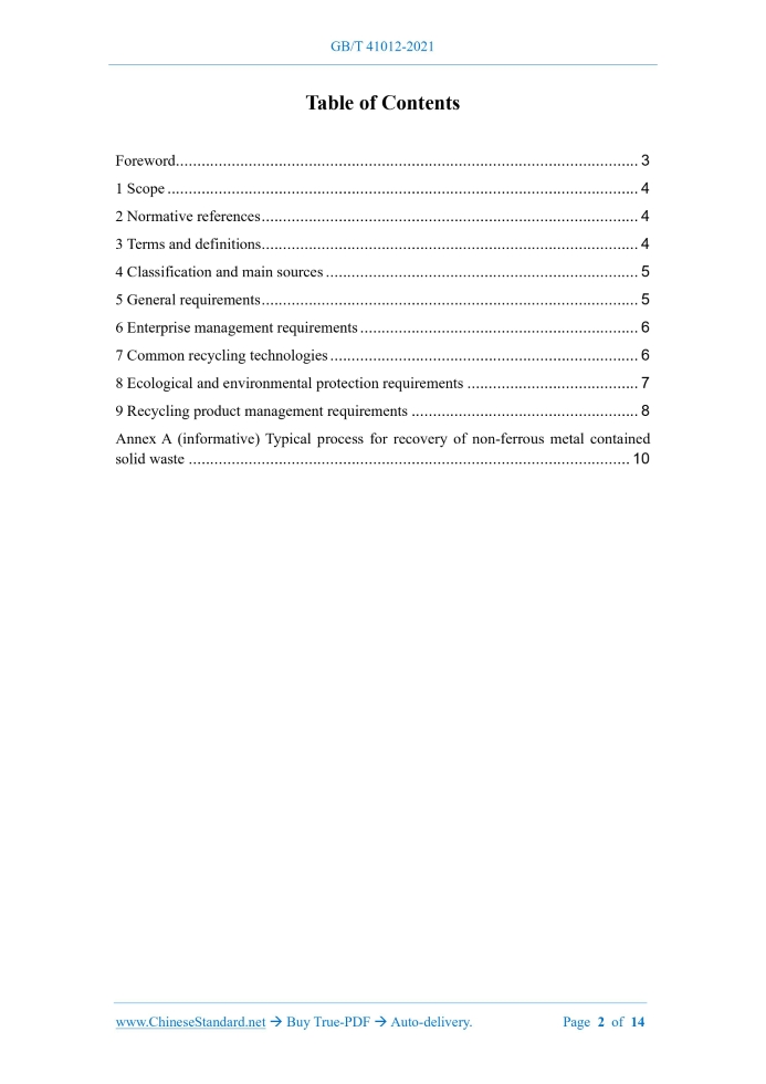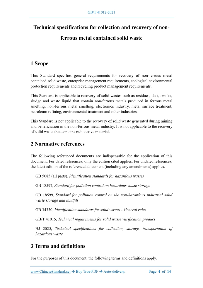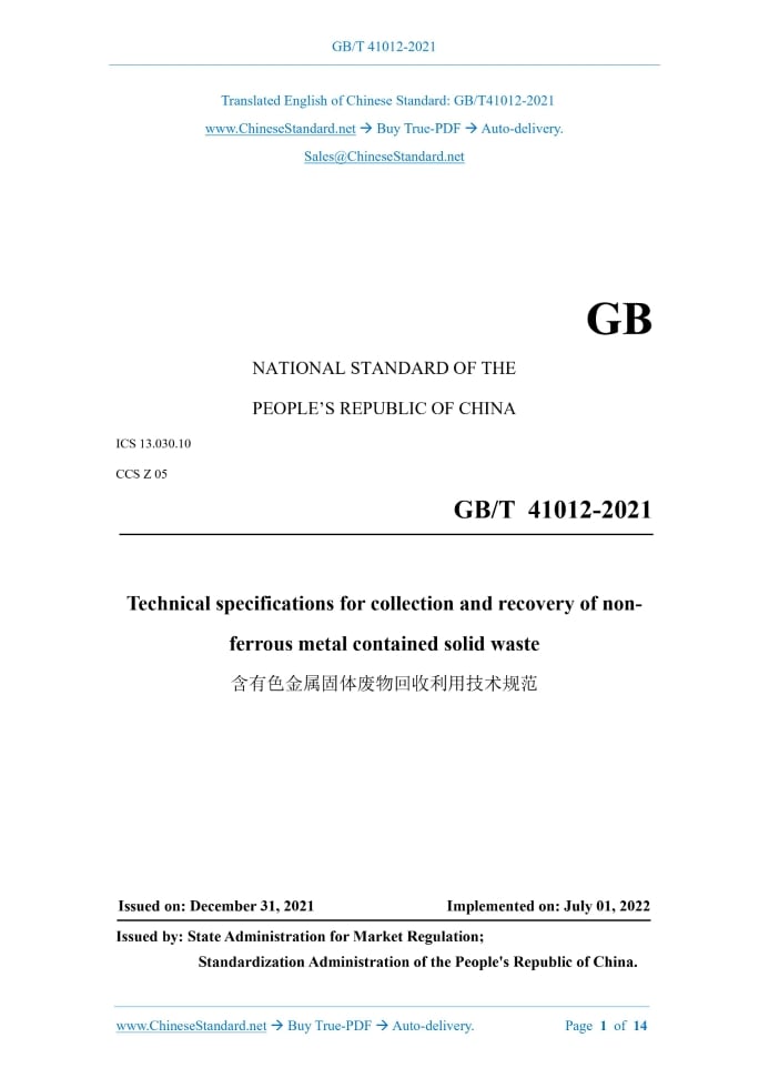 Similar standardsGB/T 41012-2021: Technical specifications for collection and recovery of non-ferrous metal contained solid waste---This is an excerpt. Full copy of true-PDF in English version (including equations, symbols, images, flow-chart, tables, and figures etc.), auto-downloaded/delivered in 9 seconds, can be purchased online: https://www.ChineseStandard.net/PDF.aspx/GBT41012-2021 NATIONAL STANDARD OF THE PEOPLE’S REPUBLIC OF CHINA ICS 13.030.10 CCS Z 05 Technical specifications for collection and recovery of non- ferrous metal contained solid waste ISSUED ON: DECEMBER 31, 2021 IMPLEMENTED ON: JULY 01, 2022 Issued by: State Administration for Market Regulation; Standardization Administration of the People's Republic of China. Table of ContentsForeword ... 3 1 Scope ... 4 2 Normative references ... 4 3 Terms and definitions... 4 4 Classification and main sources ... 5 5 General requirements ... 5 6 Enterprise management requirements ... 6 7 Common recycling technologies ... 6 8 Ecological and environmental protection requirements ... 7 9 Recycling product management requirements ... 8 Annex A (informative) Typical process for recovery of non-ferrous metal contained solid waste ... 10 Technical specifications for collection and recovery of non- ferrous metal contained solid waste1 ScopeThis Standard specifies general requirements for recovery of non-ferrous metal contained solid waste, enterprise management requirements, ecological environmental protection requirements and recycling product management requirements. This Standard is applicable to recovery of solid wastes such as residues, dust, smoke, sludge and waste liquid that contain non-ferrous metals produced in ferrous metal smelting, non-ferrous metal smelting, electronics industry, metal surface treatment, petroleum refining, environmental treatment and other industries. This Standard is not applicable to the recovery of solid waste generated during mining and beneficiation in the non-ferrous metal industry. It is not applicable to the recovery of solid waste that contains radioactive material.2 Normative referencesThe following referenced documents are indispensable for the application of this document. For dated references, only the edition cited applies. For undated references, the latest edition of the referenced document (including any amendments) applies. GB 5085 (all parts), Identification standards for hazardous wastes GB 18597, Standard for pollution control on hazardous waste storage GB 18599, Standard for pollution control on the non-hazardous industrial solid waste storage and landfill GB 34330, Identification standards for solid wastes - General rules GB/T 41015, Technical requirements for solid waste vitrification product HJ 2025, Technical specifications for collection, storage, transportation of hazardous waste3 Terms and definitionsFor the purposes of this document, the following terms and definitions apply. technology. Adopt comprehensive utilization and environmental protection technologies encouraged and recommended by the state. Timely measure and monitor environment and energy. Timely detect and eliminate adverse effects on the environment. 5.4 During transportation and storage of semi-solid and liquid non-ferrous metal contained solid wastes, they shall be loaded into special barrels, tanks and other containers or tank trucks. The storage and transportation of non-ferrous metal contained solid waste shall comply with the requirements of GB 18597, HJ 2025 and other standards.6 Enterprise management requirementsEnterprises that recycle non-ferrous metal contained solid waste shall meet the following basic requirements: a) It belongs to the enterprise legal person qualification established in accordance with the law and has the business scope of comprehensive utilization of non- ferrous metal solid waste. b) Management personnel, professional technicians, skilled workers and other personnel suitable for the scale of the organization and the type of comprehensive utilization of non-ferrous metal solid waste shall be deployed. Relevant staff and management personnel shall master the provisions of relevant national policies, regulations, and standards. c) There shall be a fixed place and necessary recycling, storage, processing and environmental protection and safety facilities and equipment, which meet the requirements of national or local environmental protection and safety protection related standards and specifications. d) There shall be a sound management system or management system for personnel management, production management, quality management, safety emergency management and environmental management. e) The amount of solid waste to be treated shall be compatible with the recycling capacity and pollution prevention and control capacity.7 Common recycling technologies7.1 Physical processing It is a treatment method, that is according to the basic physical properties of non-ferrous metal contained solid waste, changes the morphology of solid waste by physical methods without destroying the composition of solid waste, including compaction, crushing, screening, sorting, dehydration, evaporation, extraction, adsorption and other methods. Before recovery, the necessary initial treatment of non-ferrous metal contained solid waste can be carried out, mainly including crushing, sorting and other processes. For non-ferrous metal contained sludge and semi-solid waste residues, mechanical dehydration can be carried out by means of pressure filtration or drying and dehydration can be carried out using equipment such as thermal ovens and steam drying ovens. 7.2 Chemical treatment It is a treatment method, that is according to the basic chemical properties of non- ferrous metal contained solid waste, undergoes chemical transformation to obtain valuable metals or metal compounds and other substances, including redox, electrolysis, electrowinning, extraction, separation, leaching and other hydrometallurgical met