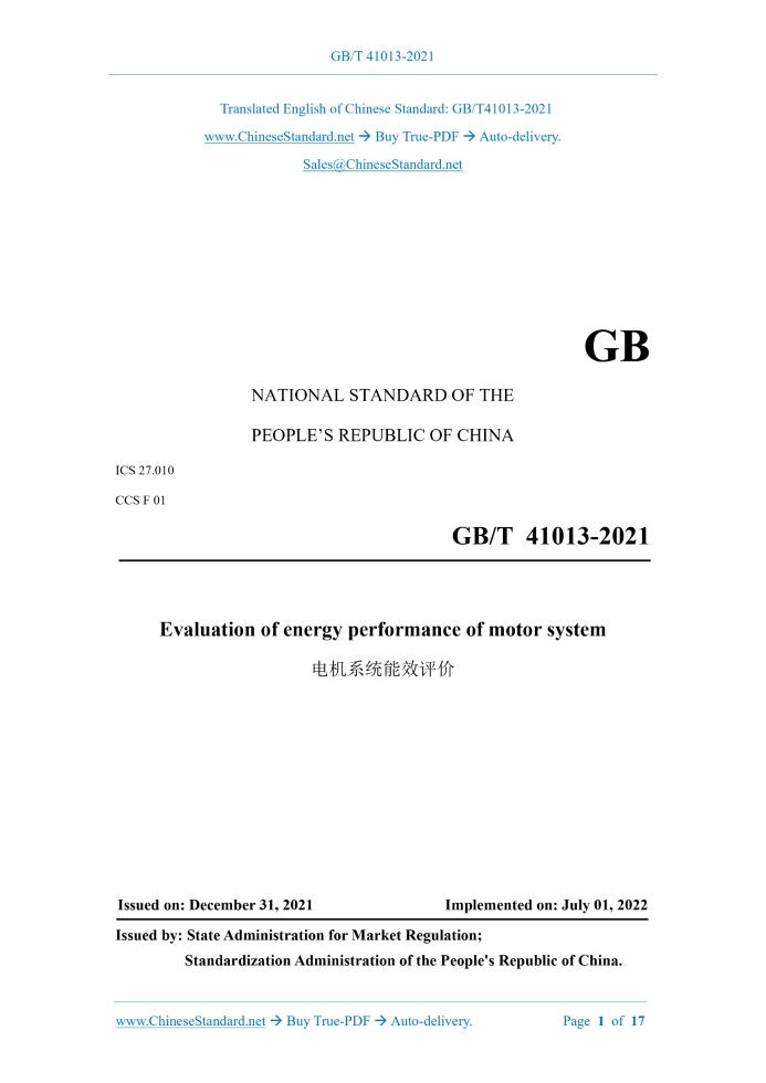 GB/T 41013-2021: Evaluation of energy performance of motor system Delivery: 9 seconds. True-PDF full-copy in English & invoice will be downloaded + auto-delivered via email. See step-by-step procedure Status: Valid