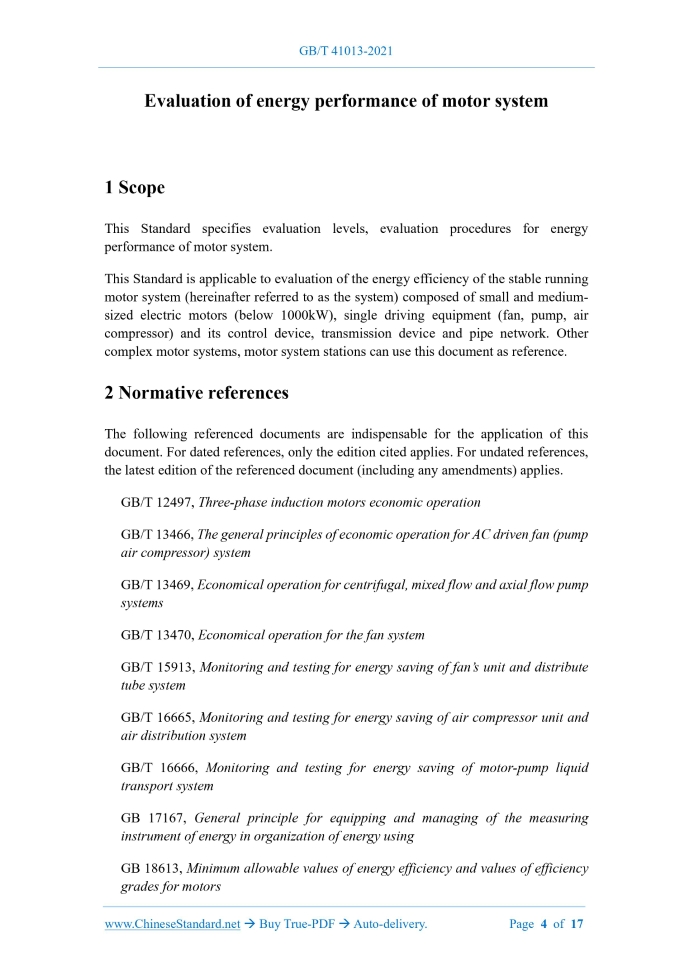 Similar standardsGB/T 41013-2021: Evaluation of energy performance of motor system---This is an excerpt. Full copy of true-PDF in English version (including equations, symbols, images, flow-chart, tables, and figures etc.), auto-downloaded/delivered in 9 seconds, can be purchased online: https://www.ChineseStandard.net/PDF.aspx/GBT41013-2021NATIONAL STANDARD OF THE PEOPLE’S REPUBLIC OF CHINA ICS 27.010 CCS F 01 Evaluation of energy performance of motor system ISSUED ON: DECEMBER 31, 2021 IMPLEMENTED ON: JULY 01, 2022 Issued by: State Administration for Market Regulation; Standardization Administration of the People's Republic of China. Table of ContentsForeword ... 3 1 Scope ... 4 2 Normative references ... 4 3 Terms and definitions... 6 4 Energy efficiency level ... 6 5 Evaluation procedures... 6 Annex A (normative) Comprehensive scoring index system and scoring method for energy efficiency of motor system ... 9 Bibliography... 17 Evaluation of energy performance of motor system1 ScopeThis Standard specifies evaluation levels, evaluation procedures for energy performance of motor system. This Standard is applicable to evaluation of the energy efficiency of the stable running motor system (hereinafter referred to as the system) composed of small and medium- sized electric motors (below 1000kW), single driving equipment (fan, pump, air compressor) and its control device, transmission device and pipe network. Other complex motor systems, motor system stations can use this document as reference.2 Normative referencesThe following referenced documents are indispensable for the application of this document. For dated references, only the edition cited applies. For undated references, the latest edition of the referenced document (including any amendments) applies. GB/T 12497, Three-phase induction motors economic operation GB/T 13466, The general principles of economic operation for AC driven fan (pump air compressor) system GB/T 13469, Economical operation for centrifugal, mixed flow and axial flow pump systems GB/T 13470, Economical operation for the fan system GB/T 15913, Monitoring and testing for energy saving of fan’s unit and distribute tube system GB/T 16665, Monitoring and testing for energy saving of air compressor unit and air distribution system GB/T 16666, Monitoring and testing for energy saving of motor-pump liquid transport system GB 17167, General principle for equipping and managing of the measuring instrument of energy in organization of energy using GB 18613, Minimum allowable values of energy efficiency and values of efficiency grades for motors GB 19153, Minimum allowable values of energy efficiency and energy efficiency grades for displacement air compressors GB 19761, Minimum allowable values of energy efficiency and energy efficiency grades for fan GB 19762, The minimum allowable values of energy efficiency and evaluating values of energy conservation of centrifugal pump for fresh water GB/T 21056, Specification for adjustable speed drive systems of electricity conservation with VF for fans and pumps GB/T 26921, The guide of design optimization for motor systems (fans, pumps, air compressors) GB/T 27883, Economical operation for displacement air compressor system GB 28381, Minimum allowable values of energy efficiency and evaluating values of energy conservation for centrifugal blower GB/T 29314, Specification for the Reconstruction of Motor System for Energy- saving GB 30253, Minimum Allowable Values of Energy Efficiency and Energy Efficiency Grades for Permanent Magnet Synchronous Motors GB 30254, Minimum Allowable Values of Energy Efficiency and the Energy Efficiency Grades for Cage Three-phase High Voltage Induction Motor GB/T 30256, Technical Requirements of Measurement and Verification of Energy Savings, Pumped Liquid Delivery System GB/T 30257, Technical Requirements of Measurement and Verification of Energy Savings, Fan System GB 32029, Minimum allowable values of energy efficiency and energy efficiency grades for small-size submersible motor-pumps GB 32030, Minimum allowable values of energy efficiency and energy efficiency grades for submersible pumps for deep well GB 32031, Minimum allowable values of energy efficiency and energy efficiency grades for waste submersible motor-pumps GB 32284, Minimum allowable values of energy efficiency and energy efficiency grades for petrochemical centrifugal pumps c) Relevant test, evaluation and verification reports; d) Operating procedures, operation records, maintenance records and other technical data; e) Personnel qualification certificates, training records; f) Energy-saving retrofit certification documents and others. 5.4 Evaluation implementation 5.4.1 The operator or management party of the motor system shall ensure that the operation of the system complies with the requirements of laws, regulations and mandatory standards such as safety, energy saving and environmental protection. 5.4.2 The evaluation agency or personnel shall evaluate the energy efficiency of the motor system according to the scoring index system and scoring method given in Annex A and give quantitative results. 5.4.3 The evaluation agency or personnel shall give scores by consulting and checking design documents, statistical reports, original records, declaration documents, analysis/test reports, relevant third-party certification certificates and other supporting materials. Relevant evaluation information can also be collected through discussions, field investigations, sample surveys, and field tests. Each scoring result shall be supported by documented information. The score for the scoring item without corroborating materials is 0. 5.4.4 The evaluation agency or personnel can give suggestions on energy-saving measures in terms of system optimization and transformation, strengthening management based on the scoring results. 5.5 Preparation of evaluation report The content of the evaluation report shall include: a) A brief description of 
