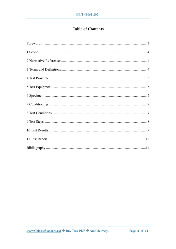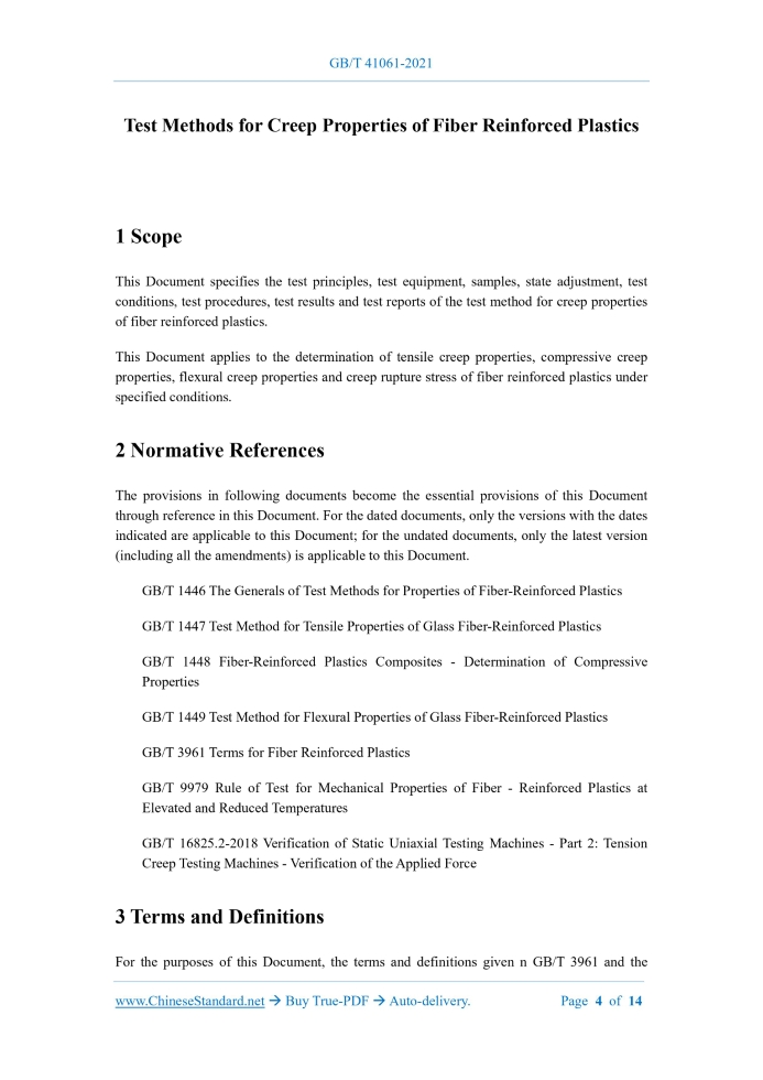 Similar standardsGB/T 41061-2021: Test methods for creep properties of fiber reinforced plastics---This is an excerpt. Full copy of true-PDF in English version (including equations, symbols, images, flow-chart, tables, and figures etc.), auto-downloaded/delivered in 9 seconds, can be purchased online: https://www.ChineseStandard.net/PDF.aspx/GBT41061-2021NATIONAL STANDARD OF THE PEOPLE’S REPUBLIC OF CHINA ICS 83.120 CCS Q 23 Test Methods for Creep Properties of Fiber Reinforced Plastics ISSUED ON: DECEMBER 31, 2021 IMPLEMENTED ON: JULY 01, 2022 Issued by: State Administration for Market Regulation; Standardization Administration of the People’s Republic of China. Table of ContentsForeword ... 3 1 Scope ... 4 2 Normative References ... 4 3 Terms and Definitions ... 4 4 Test Principle ... 5 5 Test Equipment ... 6 6 Specimen ... 7 7 Conditioning ... 7 8 Test Conditions ... 7 9 Test Steps ... 8 10 Test Results ... 9 11 Test Report ... 12 Bibliography ... 14 Test Methods for Creep Properties of Fiber Reinforced Plastics1 ScopeThis Document specifies the test principles, test equipment, samples, state adjustment, test conditions, test procedures, test results and test reports of the test method for creep properties of fiber reinforced plastics. This Document applies to the determination of tensile creep properties, compressive creep properties, flexural creep properties and creep rupture stress of fiber reinforced plastics under specified conditions.2 Normative ReferencesThe provisions in following documents become the essential provisions of this Document through reference in this Document. For the dated documents, only the versions with the dates indicated are applicable to this Document; for the undated documents, only the latest version (including all the amendments) is applicable to this Document. GB/T 1446 The Generals of Test Methods for Properties of Fiber-Reinforced Plastics GB/T 1447 Test Method for Tensile Properties of Glass Fiber-Reinforced Plastics GB/T 1448 Fiber-Reinforced Plastics Composites - Determination of Compressive Properties GB/T 1449 Test Method for Flexural Properties of Glass Fiber-Reinforced Plastics GB/T 3961 Terms for Fiber Reinforced Plastics GB/T 9979 Rule of Test for Mechanical Properties of Fiber - Reinforced Plastics at Elevated and Reduced Temperatures GB/T 16825.2-2018 Verification of Static Uniaxial Testing Machines - Part 2: Tension Creep Testing Machines - Verification of the Applied Force3 Terms and DefinitionsFor the purposes of this Document, the terms and definitions given n GB/T 3961 and the5 Test Equipment5.1 Loading system 5.1.1 The electronic testing machine shall comply with the provisions of the Class-1 testing machine in GB/T 16825.2-2018, the relative error of the load shall not exceed ±1%, and the repeatability error shall not exceed 1%. 5.1.2 The relative error of the load provided by the weight test device shall not exceed ±1%. 5.1.3 The loading system shall have a buffer device, and shall be kept away from external vibration and shock during installation. 5.1.4 The loading system shall ensure that the load can be applied smoothly without instantaneous overload, and the applied load shall be within ±1% of the required load. 5.1.5 During the test, the loading device shall be able to provide a constant load. In the creep rupture test, measures shall be taken to prevent the vibration generated when the specimen ruptures from being transmitted to the adjacent loading system. 5.2 Clamp 5.2.1 The tensile creep test fixture should ensure that the loading axis is consistent with the longitudinal axis of the sample as much as possible. It is recommended to use a fixture that can center and fix the sample before loading. 5.2.2 The compressive creep test fixture shall comply with the provisions of GB/T 1448. 5.2.3 The bending creep test fixture shall comply with the provisions of GB/T 1449. 5.3 Deformation measuring device 5.3.1 The deformation measuring device consists of a device capable of measuring the elongation, compression or deflection of the specimen under load. This device shall not influence the specimen through mechanical effects (deformation, indentation, etc.), physical effects (heating the specimen, etc.) and chemical effects on the sample. 5.3.2 The accuracy of the deformation measuring device is 0.001mm. 5.3.3 The deformation measuring device shall be fixed and shall not slip. 5.4 Dimension measuring tool The accuracy is 0.01mm. 5.5 Time measuring device The accuracy is 1min. 5.6 Automatic temperature control device The error shall not exceed ±2°C.6 Specimen6.1 Shape and size of specimen 6.1.1 The specimen for tensile creep test shall comply with provisions of GB/T 1447. 6.1.2 The specimen for compression creep test shall comply with the provisions of GB/T 1448. 6.1.3 The specimen for bending creep test shall comply with the provisions of GB/T 1449. 6.2 Number of specimens 6.2.1 The number of valid specimens at each test temperature and each stress level shall at least meet the following requirements: --- 2 pieces for no less than 4 stress levels; --- 3 pieces if there are less than 4 stress levels. 6.2.2 When testing creep rupture, test at least 2 specimens at each test temperature and each stress level. 6.2.3 When it is known that the size of the material shall change significantly under the influence of temperature, a comparison sample shall be added. At least 3 comparison specimens are tested at each test temperature.7 ConditioningExcept for special provisions, the conditioning of the sample shall be according to the provisions of GB/T 1446.8 Test Conditions8.1 Test temperature The choice of the test temperature depends on the purpose of the test, and is selected with reference to the following provisions. temperature and initial stress. 9.6 According to the provisions of GB/T 9979, preserve the heat of specimen. After the heat preservation, it shall be quickly and smoothly loaded to the test load, and the loading proce