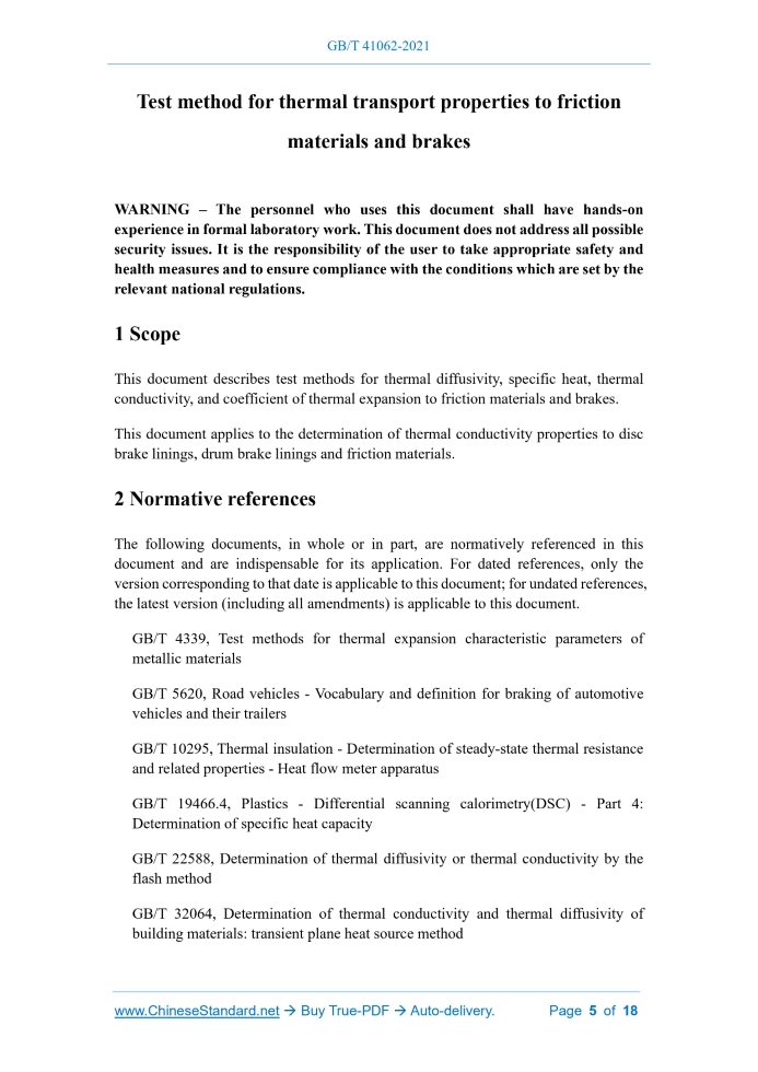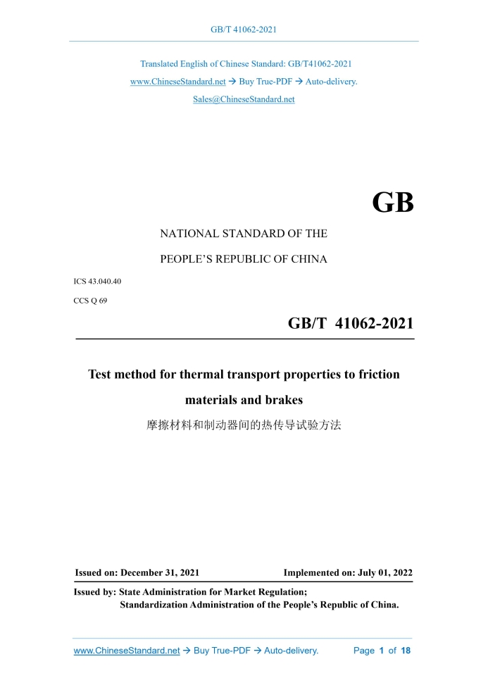 GB/T 41062-2021: Test method for thermal transport properties to friction materials and brakes Delivery: 9 seconds. True-PDF full-copy in English & invoice will be downloaded + auto-delivered via email. See step-by-step procedure Status: Valid