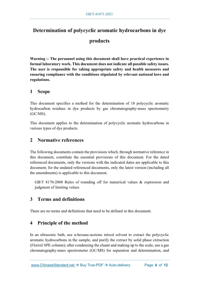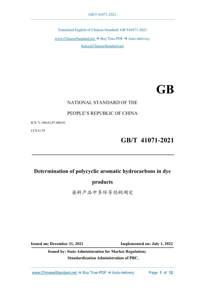 GB/T 41071-2021: Determination of polycyclic aromatic hydrocarbons in dye products Delivery: 9 seconds. True-PDF full-copy in English & invoice will be downloaded + auto-delivered via email. See step-by-step procedure Status: Valid