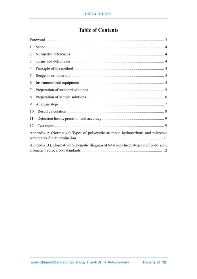 Similar standardsGB/T 41071-2021: Determination of polycyclic aromatic hydrocarbons in dye products---This is an excerpt. Full copy of true-PDF in English version (including equations, symbols, images, flow-chart, tables, and figures etc.), auto-downloaded/delivered in 9 seconds, can be purchased online: https://www.ChineseStandard.net/PDF.aspx/GBT41071-2021NATIONAL STANDARD OF THE PEOPLE’S REPUBLIC OF CHINA ICS 71.100.01;87.060.01 CCS G 55 Determination of polycyclic aromatic hydrocarbons in dye products ISSUED ON: DECEMBER 31, 2021 IMPLEMENTED ON: JULY 1, 2022 Issued by: State Administration for Market Regulation; Standardization Administration of PRC. Table of ContentsForeword ... 3 1 Scope ... 4 2 Normative references ... 4 3 Terms and definitions ... 4 4 Principle of the method ... 4 5 Reagents or materials ... 5 6 Instruments and equipment ... 5 7 Preparation of standard solutions ... 5 8 Preparation of sample solutions ... 6 9 Analysis steps ... 7 10 Result calculation ... 8 11 Detection limits, precision and accuracy ... 9 12 Test report... 9 Appendix A (Normative) Types of polycyclic aromatic hydrocarbons and reference parameters for determination ... 11 Appendix B (Informative) Schematic diagram of total ion chromatogram of polycyclic aromatic hydrocarbon standards ... 12 Determination of polycyclic aromatic hydrocarbons in dye products Warning -- The personnel using this document shall have practical experience in formal laboratory work. This document does not indicate all possible safety issues. The user is responsible for taking appropriate safety and health measures and ensuring compliance with the conditions stipulated by relevant national laws and regulations.1 ScopeThis document specifies a method for the determination of 18 polycyclic aromatic hydrocarbon residues in dye products by gas chromatography-mass spectrometry (GC/MS). This document applies to the determination of polycyclic aromatic hydrocarbons in various types of dye products.2 Normative referencesThe following documents contain the provisions which, through normative reference in this document, constitute the essential provisions of this document. For the dated referenced documents, only the versions with the indicated dates are applicable to this document; for the undated referenced documents, only the latest version (including all the amendments) is applicable to this document. GB/T 8170-2008 Rules of rounding off for numerical values & expression and judgment of limiting values3 Terms and definitionsThere are no terms and definitions that need to be defined in this document.4 Principle of the methodIn an ultrasonic bath, use n-hexane-acetone mixed solvent to extract the polycyclic aromatic hydrocarbons in the sample, and purify the extract by solid phase extraction (Florisil SPE column); after condensing the eluant and making up to the scale, use a gas chromatography-mass spectrometer (GC/MS) for separation and determination, and adopt peak area external standard method for quantification.5 Reagents or materials5.1 The types of standard polycyclic aromatic hydrocarbons and the reference parameters for determination shall comply with the provisions of Appendix A. 5.2 Dichloromethane, chromatographically pure. 5.3 n-hexane, chromatographically pure. 5.4 Acetone, chromatographically pure. 5.5 n-hexane-acetone mixed solvent: The volume ratio of n-hexane and acetone is 1:1. 5.6 n-hexane-dichloromethane mixed solvent: The volume ratio of n-hexane and dichloromethane is 8:2. 5.7 Florisil column (SPE column): 1000 mg, 6 mL.6 Instruments and equipment6.1 Gas chromatography-mass spectrometer (GC/MS): with EI source. 6.2 Chromatographic column: 50% phenylmethyl polysiloxane solid phase, such as DB-17MS, 30 m×0.25 mm×0.25 μm, or equivalent. 6.3 Analytical balance: The accuracy shall be 0.01 mg. 6.4 Ultrasonic generator. 6.5 Extractor: a tube with a stopper, 10 mL. 6.6 Centrifuge: 4000 r/min. 6.7 Nitrogen-blowing concentrator. 6.8 Solid phase extraction device.7 Preparation of standard solutions7.1 Polycyclic aromatic hydrocarbon single standard stock solutions Respectively weigh 10 mg of the standard substances listed in Appendix A, and the weights shall be accurate to 0.01 mg; dissolve with n-hexane and dilute to the mark in collect the supernatant of the extract. If the sample is completely dissolved, the ultrasonic extraction step can be omitted. Analyze it later with instruments. 8.2 Concentrating and solvent replacement Adopt the nitrogen blowing concentrating method, and the temperature of the nitrogen blowing concentrator shall be set to 30 °C; concentrate the extract (8.1) to 1 mL~2 mL with a small flow rate of nitrogen, wash the wall of the concentrating tube with about 5 mL~10 mL of n-hexane, and then concentrate the liquid to about 1 mL. Purify it later. 8.3 Purification Fix the Florisil column on the solid-phase extraction device, rinse and purify the column with 4 mL of acetone, and then add 4 mL of n-hexane. After the column is filled, close the control valve and soak for 5 min; then, slowly open the control valve, and close the control valve before the filler is exposed to air. Transfer the concentrated solution (8.2) to the column, wash the concentrating tube several times with about 2 mL of n-hexane in total, and transfer all the washing liquor to the column. Slowly open the control valve and collect the effluent. Before the adsorbent is exposed to air, add about 8 mL of n- hexane-dichloromethane mixed solvent (5.6) for elution, and collect all the eluent. 8.4 Concentrating and making the volume up to mark The purified eluent shall be concentrated by nitrogen blowing, made up to 1.0 mL with n-hexane, mixed well, and transferred to a sample bottle for analysis later. 8.5 Preparation of blank samples Prepare blank samples following the same procedures as for sample solution preparation.9 Analysis steps9.1 Chromatographic analysis conditions Since the test results depend on the instrument used, i
