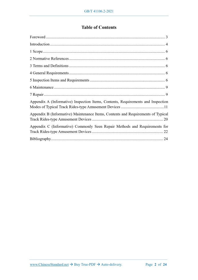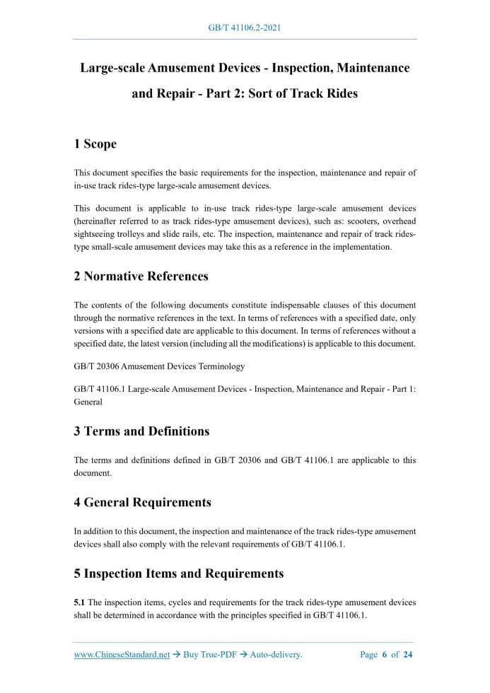 Similar standardsGB/T 41106.2-2021: Large-scale amusement devices - Inspection, maintenance and repair - Part 2: Sort of track rides---This is an excerpt. Full copy of true-PDF in English version (including equations, symbols, images, flow-chart, tables, and figures etc.), auto-downloaded/delivered in 9 seconds, can be purchased online: https://www.ChineseStandard.net/PDF.aspx/GBT41106.2-2021 NATIONAL STANDARD OF THE PEOPLE’S REPUBLIC OF CHINA ICS 97.200.40 CCS Y 57 Large-scale Amusement Devices - Inspection, Maintenance and Repair - Part 2: Sort of Track Rides ISSUED ON: DECEMBER 31, 2021 IMPLEMENTED ON: JULY 1, 2022 Issued by: State Administration for Market Regulation; Standardization Administration of the People’s Republic of China. Table of ContentsForeword ... 3 Introduction ... 4 1 Scope ... 6 2 Normative References ... 6 3 Terms and Definitions ... 6 4 General Requirements ... 6 5 Inspection Items and Requirements ... 6 6 Maintenance ... 9 7 Repair ... 9 Appendix A (Informative) Inspection Items, Contents, Requirements and Inspection Modes of Typical Track Rides-type Amusement Devices ... 11 Appendix B (Informative) Maintenance Items, Contents and Requirements of Typical Track Rides-type Amusement Devices ... 20 Appendix C (Informative) Commonly Seen Repair Methods and Requirements for Track Rides-type Amusement Devices ... 22 Bibliography ... 24 Large-scale Amusement Devices - Inspection, Maintenance and Repair - Part 2: Sort of Track Rides1 ScopeThis document specifies the basic requirements for the inspection, maintenance and repair of in-use track rides-type large-scale amusement devices. This document is applicable to in-use track rides-type large-scale amusement devices (hereinafter referred to as track rides-type amusement devices), such as: scooters, overhead sightseeing trolleys and slide rails, etc. The inspection, maintenance and repair of track rides- type small-scale amusement devices may take this as a reference in the implementation.2 Normative ReferencesThe contents of the following documents constitute indispensable clauses of this document through the normative references in the text. In terms of references with a specified date, only versions with a specified date are applicable to this document. In terms of references without a specified date, the latest version (including all the modifications) is applicable to this document. GB/T 20306 Amusement Devices Terminology GB/T 41106.1 Large-scale Amusement Devices - Inspection, Maintenance and Repair - Part 1: General3 Terms and DefinitionsThe terms and definitions defined in GB/T 20306 and GB/T 41106.1 are applicable to this document.4 General RequirementsIn addition to this document, the inspection and maintenance of the track rides-type amusement devices shall also comply with the relevant requirements of GB/T 41106.1.5 Inspection Items and Requirements5.1 The inspection items, cycles and requirements for the track rides-type amusement devices shall be determined in accordance with the principles specified in GB/T 41106.1. bolts; d) Supporting structure: inspect the deformation, corrosion and welds of the steel structure, and interference with the environment, etc.; e) Lifting system: inspect the condition of friction wheels, wire ropes, chains, gears and counterweights, etc.; f) Drive (transmission) system: inspect the motors, reducers, open gears, belts, chains, pin gear drives, drive wheels and connecting bolts for temperature rise, abnormal noise, wear, fastening and working conditions; g) Hydraulic pneumatic system: inspect the functional conditions of the hydraulic system, hydraulic pump stations, hydraulic pipelines, valve groups, motor leakage, abnormal noise and working conditions, as well as air compressors, pressure reducing valves, air path and joint leakage, and temperature rise, etc.; h) Electrical and control system: inspect the condition of power supply, power transmission and distribution equipment, wires and cables; the system’s compliance with the requirements in grounding and insulation; the condition and working conditions of machine rooms, control cabinets, electrical components, control panels, sensors, leakage protection devices, UPS power supplies, batteries and lightning protection devices, etc.; i) Safety protection devices: inspect the condition and working conditions of braking devices, anti-reversing devices, anti-collision devices, buffer devices, position limits, speed limits and door locking devices, etc.; j) Protection system: inspect the protection measures, such as: platform safety isolation measures, guiding beacons, safety distance and anti-skid measures; the condition of safety fences and protective nets; k) Backup power: inspect the condition and working conditions of emergency power supply and backup power units; l) Auxiliary equipment and facilities: inspect the condition and working conditions of emergency evacuation passages, high-altitude platforms, maintenance platforms and lighting, etc., as well as aviation warning lights, anemometers, alarm bells, fire protection equipment, audio systems, video surveillance systems, and emergency rescue equipment; m) Associated equipment and facilities: inspect the condition and working conditions of other associated equipment and facilities, such as: special effects, packaging and performances, etc.; n) Other related special equipment: inspect the compliance of other special equipment, such as: pressure containers, gas cylinders, elevators and hoisting machinery, with the national regulatory requirements; o) Foundation: inspect the fastening of anchor bolts, foundation settlement, corrosion and deformation, etc.; p) Guidelines and safety warning signs: inspect the condition of guidelines and safety warning signs. 5.4 The inspection items, contents, requirements and inspection modes of typical track rides- type amusement devices are shown in Appendix A.6 Maintenance6.1 The main maintenance items of the track rides-type amuse