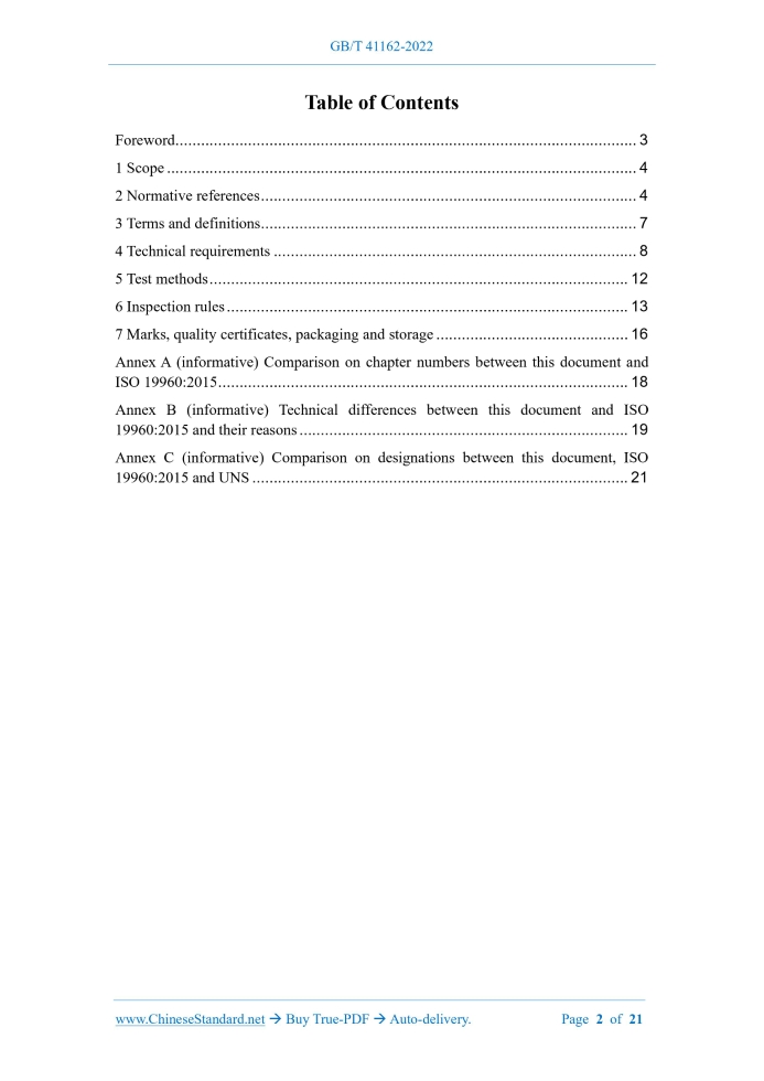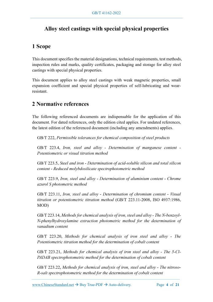 Similar standardsGB/T 41162-2022: Alloy steel castings with special physical properties---This is an excerpt. Full copy of true-PDF in English version (including equations, symbols, images, flow-chart, tables, and figures etc.), auto-downloaded/delivered in 9 seconds, can be purchased online: https://www.ChineseStandard.net/PDF.aspx/GBT41162-2022NATIONAL STANDARD OF THE PEOPLE’S REPUBLIC OF CHINA ICS 77.140.80 CCS J 31 Alloy steel castings with special physical properties (ISO 19960:2015, Cast steels and alloys with special physical properties, MOD) ISSUED ON: MARCH 09, 2022 IMPLEMENTED ON: OCTOBER 01, 2022 Issued by: State Administration for Market Regulation; Standardization Administration of the People's Republic of China. Table of ContentsForeword ... 3 1 Scope ... 4 2 Normative references ... 4 3 Terms and definitions... 7 4 Technical requirements ... 8 5 Test methods ... 12 6 Inspection rules ... 13 7 Marks, quality certificates, packaging and storage ... 16 Annex A (informative) Comparison on chapter numbers between this document and ISO 19960:2015 ... 18 Annex B (informative) Technical differences between this document and ISO 19960:2015 and their reasons ... 19 Annex C (informative) Comparison on designations between this document, ISO 19960:2015 and UNS ... 21 Alloy steel castings with special physical properties1 ScopeThis document specifies the material designations, technical requirements, test methods, inspection rules and marks, quality certificates, packaging and storage for alloy steel castings with special physical properties. This document applies to alloy steel castings with weak magnetic properties, small expansion coefficient and special physical properties of self-lubricating and wear- resistant.2 Normative referencesThe following referenced documents are indispensable for the application of this document. For dated references, only the edition cited applies. For undated references, the latest edition of the referenced document (including any amendments) applies. GB/T 222, Permissible tolerances for chemical composition of steel products GB/T 223.4, Iron, steel and alloy - Determination of manganese content - Potentiometric or visual titration method GB/T 223.5, Steel and iron - Determination of acid-soluble silicon and total silicon content - Reduced molybdosilicate spectrophotometric method GB/T 223.9, Iron, steel and alloy - Determination of aluminium content - Chrome azurol S photometric method GB/T 223.11, Iron, steel and alloy - Determination of chromium content - Visual titration or potentiometric titration method (GB/T 223.11-2008, ISO 4937:1986, MOD) GB/T 223.14, Methods for chemical analysis of iron, steel and alloy - The N-benzoyl- N-phenylhydroxylamine extraction photometric method for the determination of vanadium content GB/T 223.20, Methods for chemical analysis of iron steel and alloy - The Potentiometric titration method for the determination of cobalt content GB/T 223.21, Methods for chemical analysis of iron steel and alloy - The 5-Cl- PADAB spectrophotometric method for the determination of cobalt content GB/T 223.22, Methods for chemical analysis of iron, steel and alloy - The nitroso- R-salt spectrophotometric method for the determination of cobalt content The tensile test shall be carried out in accordance with the provisions of GB/T 228.1 and GB/T 2975. 5.3 Impact test The impact absorption energy test is carried out according to the provisions of GB/T 229 and GB/T 2975. 5.4 Magnetic permeability test The magnetic permeability test is carried out according to the provisions of GB/T 35690. 5.5 Coefficient of linear expansion test The coefficient of linear expansion test is carried out according to the provisions of GB/T 4339. 5.6 Surface quality 5.6.1 The surface quality of castings should be checked visually. 5.6.2 The surface roughness shall be carried out according to the provisions of GB/T 6060.1 and GB/T 15056. 5.7 Internal quality 5.7.1 Penetration test is carried out in accordance with the provisions of GB/T 9443. 5.7.2 Ultrasonic testing is carried out in accordance with the provisions of GB/T 7233.1 and GB/T 7233.2. 5.7.3 Radiographic testing shall be carried out in accordance with the provisions of GB/T 5677. 5.8 Geometry, dimensional tolerances and weight tolerances 5.8.1 The geometrical shape and dimensional tolerance of castings should be checked by selecting inspection tools, gauge blocks, templates or scribing lines with corresponding precision. Dimensional tolerances shall be implemented in accordance with the provisions of GB/T 6414. 5.8.2 The weight tolerance shall be implemented in accordance with the provisions of GB/T 11351.6 Inspection rules6.1 Batching Divide inspection lots in one of the following ways. a) Batch by heat: Castings of the same designation, poured in the same heat and heat- treated in the same heat constitute an inspection batch. b) Batch by quantity or weight: Under the condition of stable smelting or manufacturing process, a certain number or weight of castings of the same designation, which are cast in multiple heats or in the same casting process and subjected to the same heat treatment process for multiple heats, constitute an inspection batch. c) Batch by piece: For some with special casting process requirements, one or several pieces constitute an inspection batch. 6.2 Chemical composition analysis 6.2.1 The chemical composition shall be inspected one by one according to the smelting heat. Analytical samples shall be taken at least 6mm below the surface of the test block or casting. 6.2.2 When pouring a casting in multiple packs, the analysis results of each pack should meet the technical requirements of the selected designation. 6.3 Mechanical properties 6.3.1 The specimens for mechanical properties shall be taken from the attached casting test block of the casting or the single casting test block of the same smelting heat. They are heat treated in the same furnace as the castings they represent