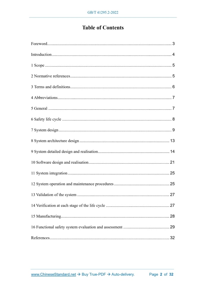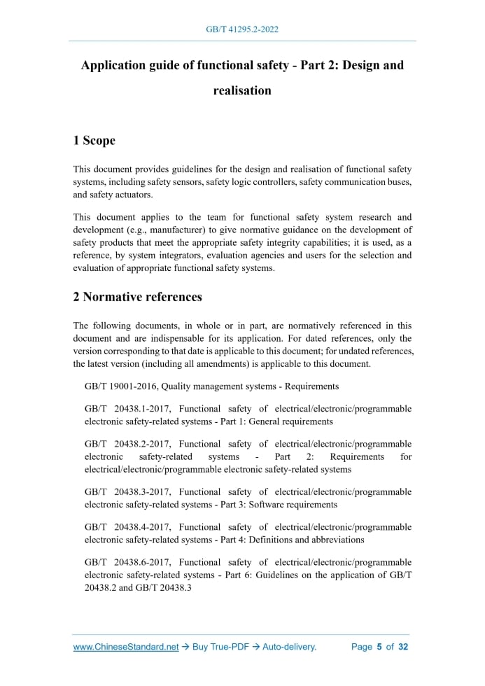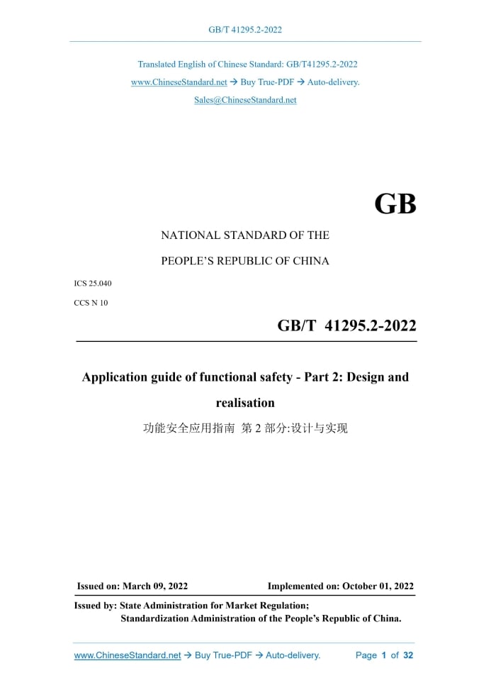 Similar standardsGB/T 41295.2-2022: Application guide of functional safety - Part 2: Design and realisation---This is an excerpt. Full copy of true-PDF in English version (including equations, symbols, images, flow-chart, tables, and figures etc.), auto-downloaded/delivered in 9 seconds, can be purchased online: https://www.ChineseStandard.net/PDF.aspx/GBT41295.2-2022NATIONAL STANDARD OF THE PEOPLE’S REPUBLIC OF CHINA ICS 25.040 CCS N 10 Application guide of functional safety - Part 2: Design and realisation ISSUED ON: MARCH 09, 2022 IMPLEMENTED ON: OCTOBER 01, 2022 Issued by: State Administration for Market Regulation; Standardization Administration of the People’s Republic of China. Table of ContentsForeword ... 3 Introduction ... 4 1 Scope ... 5 2 Normative references ... 5 3 Terms and definitions... 6 4 Abbreviations ... 7 5 General ... 7 6 Safety life cycle ... 8 7 System design ... 9 8 System architecture design ... 13 9 System detailed design and realisation ... 14 10 Software design and realisation ... 21 11 System integration ... 25 12 System operation and maintenance procedures ... 25 13 Validation of the system ... 27 14 Verification at each stage of the life cycle ... 27 15 Manufacturing ... 28 16 Functional safety system evaluation and assessment ... 29 References ... 32 Application guide of functional safety - Part 2: Design and realisation1 ScopeThis document provides guidelines for the design and realisation of functional safety systems, including safety sensors, safety logic controllers, safety communication buses, and safety actuators. This document applies to the team for functional safety system research and development (e.g., manufacturer) to give normative guidance on the development of safety products that meet the appropriate safety integrity capabilities; it is used, as a reference, by system integrators, evaluation agencies and users for the selection and evaluation of appropriate functional safety systems.2 Normative referencesThe following documents, in whole or in part, are normatively referenced in this document and are indispensable for its application. For dated references, only the version corresponding to that date is applicable to this document; for undated references, the latest version (including all amendments) is applicable to this document. GB/T 19001-2016, Quality management systems - Requirements GB/T 20438.1-2017, Functional safety of electrical/electronic/programmable electronic safety-related systems - Part 1: General requirements GB/T 20438.2-2017, Functional safety of electrical/electronic/programmable electronic safety-related systems - Part 2: Requirements for electrical/electronic/programmable electronic safety-related systems GB/T 20438.3-2017, Functional safety of electrical/electronic/programmable electronic safety-related systems - Part 3: Software requirements GB/T 20438.4-2017, Functional safety of electrical/electronic/programmable electronic safety-related systems - Part 4: Definitions and abbreviations GB/T 20438.6-2017, Functional safety of electrical/electronic/programmable electronic safety-related systems - Part 6: Guidelines on the application of GB/T 20438.2 and GB/T 20438.3 GB/T 34040-2017, Industrial communication networks - Functional safety fieldbus profiles - General rules and profile definitions GB/T 41295.3, Application guide of functional safety - Part 3: Testing and verification IEC 61508-3-1, Functional safety of electrical/electronic/programmable electronic safety-related systems - Part 3-1: Software requirements - Reuse of pre-existing software elements to implement all or part of a safety function3 Terms and definitionsTerms and definitions determined by GB/T 20438.4-2017, and the following ones are applicable to this document. 3.1 functional safety system A system that performs safety-related functions, has functional safety-related characteristics, and satisfies a specific Safety Integrity Level (SIL). Note: The system here is a broad concept, including different levels, such as safety components, safety equipment or safety control systems. In an actual industrial process, the functional safety system may be a transmitter, a relay, a safety programmable controller or a safety instrumented system. [Source: GB/T 41295.1-2022, 3.6] 3.2 team for functional safety system research and development The liability subject for the design and development of functional safety systems. Note: Including functional safety system hardware developers, software developers, verification testers, functional safety managers, etc. 3.3 functional safety system manufacture team The main body responsible for the production and manufacture of functional safety systems, which may include assemblers, testers, managers, and processing personnel in the manufacturing process of functional safety systems. requirements of relevant functional safety basic standards such as GB/T 20438.2-2017 and GB/T 20438.3-2017. In order to ensure that the expected SIL goals and requirements are actually achieved, this document gives relevant application guidelines. Note: In some fields, there are functional safety standards for specific fields; the functional safety standards in these fields inherit the overall architecture and core concepts of GB/T 20438.2-2017 and GB/T 20438.3-2017; therefore, when meeting the functional safety requirements in these fields, the relevant content of this document may be referred to. 5.2 Functional safety systems should also meet specific requirements for basic safety (such as electrical safety), environmental adaptability, and reliability/stability in their product standards, which are prerequisites for achieving the corresponding safety integrity. 5.3 The production and manufacturing process of the functional safety system needs to take into account the provisions in Chapter 15 or the functional safety standards in related fields.6 Safety life cycle6.1 General principles 6.1.1 The team for functional safety system resear