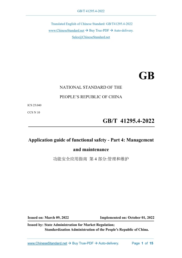 GB/T 41295.4-2022: Application guide of functional safety - Part 4: Management and maintenance Delivery: 9 seconds. True-PDF full-copy in English & invoice will be downloaded + auto-delivered via email. See step-by-step procedure Status: Valid