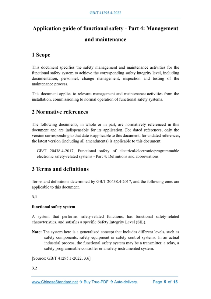 Similar standardsGB/T 41295.4-2022: Application guide of functional safety - Part 4: Management and maintenance---This is an excerpt. Full copy of true-PDF in English version (including equations, symbols, images, flow-chart, tables, and figures etc.), auto-downloaded/delivered in 9 seconds, can be purchased online: https://www.ChineseStandard.net/PDF.aspx/GBT41295.4-2022NATIONAL STANDARD OF THE PEOPLE’S REPUBLIC OF CHINA ICS 25.040 CCS N 10 Application guide of functional safety - Part 4: Management and maintenance ISSUED ON: MARCH 09, 2022 IMPLEMENTED ON: OCTOBER 01, 2022 Issued by: State Administration for Market Regulation; Standardization Administration of the People’s Republic of China. Table of ContentsForeword ... 3 Introduction ... 4 1 Scope ... 5 2 Normative references ... 5 3 Terms and definitions... 5 4 Abbreviations ... 6 5 General ... 6 6 Documentation ... 7 7 Personnel ... 7 8 Change management and configuration management ... 8 9 Safety management of operation and maintenance process ... 8 References ... 15 Application guide of functional safety - Part 4: Management and maintenance1 ScopeThis document specifies the safety management and maintenance activities for the functional safety system to achieve the corresponding safety integrity level, including documentation, personnel, change management, inspection and testing of the maintenance process. This document applies to relevant management and maintenance activities from the installation, commissioning to normal operation of functional safety systems.2 Normative referencesThe following documents, in whole or in part, are normatively referenced in this document and are indispensable for its application. For dated references, only the version corresponding to that date is applicable to this document; for undated references, the latest version (including all amendments) is applicable to this document. GB/T 20438.4-2017, Functional safety of electrical/electronic/programmable electronic safety-related systems - Part 4: Definitions and abbreviations3 Terms and definitionsTerms and definitions determined by GB/T 20438.4-2017, and the following ones are applicable to this document. 3.1 functional safety system A system that performs safety-related functions, has functional safety-related characteristics, and satisfies a specific Safety Integrity Level (SIL). Note: The system here is a generalized concept that includes different levels, such as safety components, safety equipment or safety control systems. In an actual industrial process, the functional safety system may be a transmitter, a relay, a safety programmable controller or a safety instrumented system. [Source: GB/T 41295.1-2022, 3.6] 3.2 team for functional safety system research and development The liability subject for the design and development of functional safety systems. Note: Including functional safety system hardware developers, software developers, verification testers, safety managers, etc. [Source: GB/T 41295.2-2022, 3.2] 3.3 team for functional safety system maintenance The liability subject for the maintenance of functional safety systems. Note: Including inspection and testing personnel, change management personnel, daily inspection personnel, and accessories replacement personnel for the functional safety system. 3.4 offline test Testing activities carried out when the controlled equipment is in a safe state.4 AbbreviationsThe following abbreviations apply to this document. HAZOP: Hazard and Operability HMI: Human Machine Interface LOPA: Layer Of Protection Analysis PFDavg: Average Probability of Dangerous Failure on Demand PFH: Average Frequency of Dangerous Failure Per Hour SIL: Safety Integrity Level SRS: Safety Requirement Specification5 General5.1 Organizations engaged in the installation, commissioning and formal operation of functional safety systems need to consider establishing a functional safety management 7.3 Clearly define the scope, responsibilities, required competencies (i.e., training, technical knowledge, experience and qualifications) and limitations of each person engaged in safety activities. 7.4 Consideration should be given to regulations and limitations on the competence of personnel to perform specific functional safety activities, including: -- All personnel have received functional safety training from professional institutions and are qualified to be engaged in functional safety activities; -- The team leader has experience in relevant projects and has an in-depth understanding of functional safety standards and technologies; -- All personnel are regular trained to keep abreast of the latest functional safety standards and technological advances. 7.5 An appropriate communication mechanism should be established between personnel in different positions.8 Change management and configuration management8.1 Appropriate configuration management and change control procedures shall be ensured. 8.2 Build a configuration item that meets the requirements of a specific project. The configuration item should cover all software and hardware entities and documents that may affect the safety integrity level. 8.3 It shall be ensured that the required safety integrity in the event of a change is continuously met. This includes performing an impact analysis and developing an appropriate test plan for the change. 8.4 It shall be ensured that an appropriate change approval mechanism exists and that unauthorized changes are not implemented. 8.5 The configuration management system shall ensure that the configuration status and version of all configuration items are identified. 8.6 A standardized system should be used to ensure that all items under the configuration can be individually identified.9 Safety management of operation and maintenance process9.1 General The core goal of functional safety maintenance and management is to ensure that the SIL capability required by the functional safety system during field operation is not reduced. The r