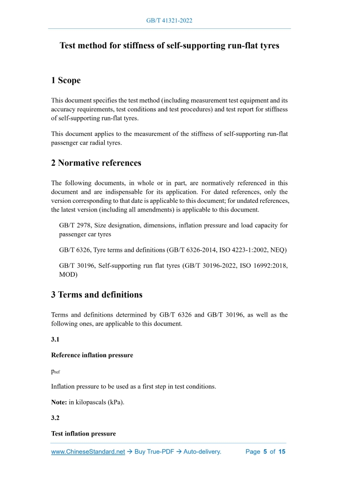 Similar standardsGB/T 41321-2022: Test method for stiffness of self-supporting run-flat tyres---This is an excerpt. Full copy of true-PDF in English version (including equations, symbols, images, flow-chart, tables, and figures etc.), auto-downloaded/delivered in 9 seconds, can be purchased online: https://www.ChineseStandard.net/PDF.aspx/GBT41321-2022NATIONAL STANDARD OF THE PEOPLE’S REPUBLIC OF CHINA ICS 83.160.10 CCS G 41 Test method for stiffness of self-supporting run-flat tyres (ISO 19940:2017, Tyre stiffness index testing procedure for passenger car extended mobility and run flat tyres, MOD) ISSUED ON: MARCH 09, 2022 IMPLEMENTED ON: OCTOBER 01, 2022 Issued by: State Administration for Market Regulation; Standardization Administration of the People’s Republic of China. Table of ContentsForeword ... 3 1 Scope ... 5 2 Normative references ... 5 3 Terms and definitions... 5 4 Test method ... 7 5 Test report ... 15 Test method for stiffness of self-supporting run-flat tyres1 ScopeThis document specifies the test method (including measurement test equipment and its accuracy requirements, test conditions and test procedures) and test report for stiffness of self-supporting run-flat tyres. This document applies to the measurement of the stiffness of self-supporting run-flat passenger car radial tyres.2 Normative referencesThe following documents, in whole or in part, are normatively referenced in this document and are indispensable for its application. For dated references, only the version corresponding to that date is applicable to this document; for undated references, the latest version (including all amendments) is applicable to this document. GB/T 2978, Size designation, dimensions, inflation pressure and load capacity for passenger car tyres GB/T 6326, Tyre terms and definitions (GB/T 6326-2014, ISO 4223-1:2002, NEQ) GB/T 30196, Self-supporting run flat tyres (GB/T 30196-2022, ISO 16992:2018, MOD)3 Terms and definitionsTerms and definitions determined by GB/T 6326 and GB/T 30196, as well as the following ones, are applicable to this document. 3.1 Reference inflation pressure pref Inflation pressure to be used as a first step in test conditions. Note: in kilopascals (kPa). 3.2 Test inflation pressure pi Inflation pressure at the step “i”. Note: in kilopascals (kPa). 3.3 Vertical stiffness KZ Tyre stiffness measured under vertical force input in inflated conditions. Note: in Newtons per millimeter (N/mm). 3.4 Structural stiffness Kstr Tyre vertical stiffness measured in zero i.p. running mode. Note: Structural stiffness is a function of the tyre’s construction and technological content, in Newtons per millimeter (N/mm). 3.5 Air stiffness Kair A tyre characteristic, which is calculated as the difference between tyre vertical stiffness (inflated) and tyre structural stiffness (uninflated). Note: Air stiffness is a function of the air volume and the inflation pressure of the tyre itself, in Newtons per millimeter (N/mm). 3.6 Deflection SZ Vertical displacement of the plate in the Z direction. Note: in millimeters (mm).4 Test method4.1 General Self-supporting run-flat tyres shall comply with the requirements of GB/T 30196. 4.2 Inflated tyre - Vertical stiffness measurement 4.2.1 Preparation of tyres The inflation pressure is 250 kPa for the standard load tyres, and 290 kPa for the reinforced load tyres. Fix the tyre on the test rim as specified in 4.2.3, and store for at least 3 h at (25±3) °C. The deviation for the inflation pressure shall be ±3 kPa. 4.2.2 Tyre measurement positions Take 3 equally distributed positions on the circumference of the tyre for measurement. -- The reference position, which can be freely chosen, needs to be in contact with the bearing plate. The splices, if visible, shall be avoided. -- The other two positions shall be equally distributed around the tyre’s circumference: distance between measurement positions approximately 120°. 4.2.3 Test rims The test rims shall have humps (flat or round) on both rim sides, where the width shall be in accordance with GB/T 2978. Stiff alloy or heavy duty rims shall be used as test rims. 4.2.4 Test equipment basic requirements 4.2.4.1 The test equipment shall be able to apply a corresponding load between the tyre and the bearing plate; the bearing plate dimensions shall be larger than the tyre footprint, and can realize relative movement between the two (tyre towards bearing plate or bearing plate towards tyre). 4.2.4.2 The rotational axis of the test tyre shall be parallel to the bearing plate, and the relative movement between the two shall be as such to be able to keep the parallelism; the maximum movement speed shall be 1 mm/s, and the acquisition rate shall be at least 5 data points for each millimetre of displacement. 4.2.5 Test equipment set-up 4.2.5.1 Before the test, the load cells shall start the data acquisition at 100 N. 4.2.5.2 At least the following data shall be recorded: -- loading force (FZ) (N), accuracy ±0.5% of maximum load cell capacity, but in any case, maximum 100 N; -- absolute position (z) (mm) accuracy ±0.5 mm. One vertical load value (FZ) shall correspond to only one absolute position value (z) and vice versa. 4.2.5.3. The ambient temperature at the test equipment shall be (25±3) °C. 4.2.5.4 The total number of acquired data points shall be in the range of 100 ~ 1 000 per inflation pressure step (refer to Table 1). The surface of the bearing plate in contact with the tyre during the measurement shall be smooth steel. 4.2.6 Maximum test load The maximum test load under the tyre reference inflation pressure (pref) is 150% of the load capacity corresponding to the load index value. 4.2.7 Test procedure 4.2.7.1 Mount the test tyre on the test equipment. 4.2.7.2 The initial distance between the test tyre and the bearing plate shall be at least 10 mm, measured as vertical distance between the lowest tyre point and the bearing plate. To set the starting point for data acquisition, the in