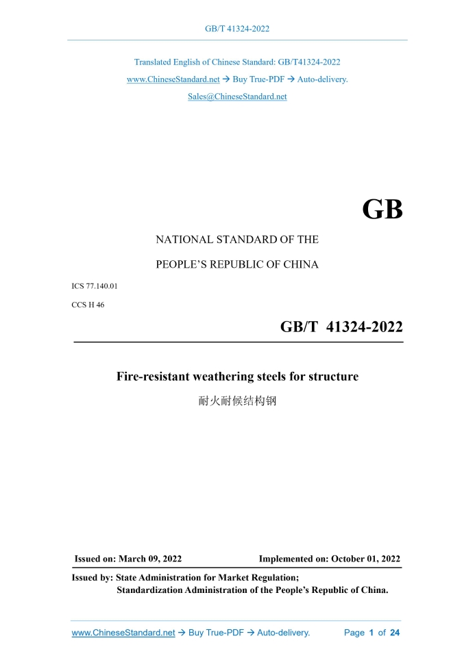GB/T 41324-2022: Fire-resistant weathering steels for structure Delivery: 9 seconds. True-PDF full-copy in English & invoice will be downloaded + auto-delivered via email. See step-by-step procedure Status: Valid