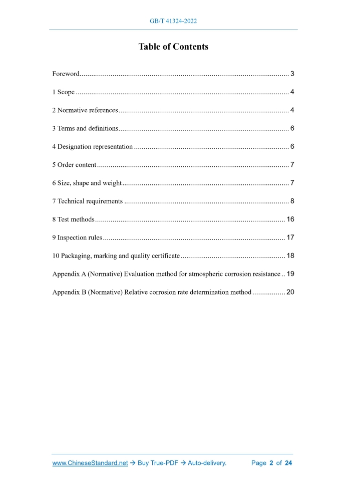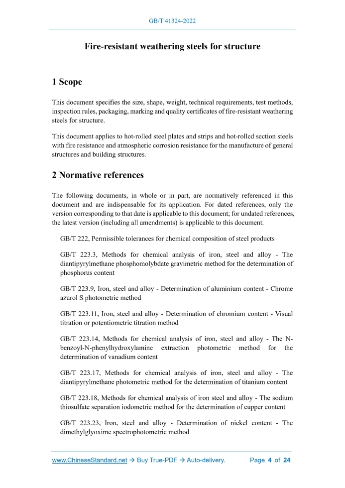 Similar standardsGB/T 41324-2022: Fire-resistant weathering steels for structure---This is an excerpt. Full copy of true-PDF in English version (including equations, symbols, images, flow-chart, tables, and figures etc.), auto-downloaded/delivered in 9 seconds, can be purchased online: https://www.ChineseStandard.net/PDF.aspx/GBT41324-2022NATIONAL STANDARD OF THE PEOPLE’S REPUBLIC OF CHINA ICS 77.140.01 CCS H 46 Fire-resistant weathering steels for structure ISSUED ON: MARCH 09, 2022 IMPLEMENTED ON: OCTOBER 01, 2022 Issued by: State Administration for Market Regulation; Standardization Administration of the People’s Republic of China. Table of ContentsForeword ... 3 1 Scope ... 4 2 Normative references ... 4 3 Terms and definitions... 6 4 Designation representation ... 6 5 Order content ... 7 6 Size, shape and weight ... 7 7 Technical requirements ... 8 8 Test methods ... 16 9 Inspection rules ... 17 10 Packaging, marking and quality certificate ... 18 Appendix A (Normative) Evaluation method for atmospheric corrosion resistance .. 19 Appendix B (Normative) Relative corrosion rate determination method ... 20 Fire-resistant weathering steels for structure1 ScopeThis document specifies the size, shape, weight, technical requirements, test methods, inspection rules, packaging, marking and quality certificates of fire-resistant weathering steels for structure. This document applies to hot-rolled steel plates and strips and hot-rolled section steels with fire resistance and atmospheric corrosion resistance for the manufacture of general structures and building structures.2 Normative referencesThe following documents, in whole or in part, are normatively referenced in this document and are indispensable for its application. For dated references, only the version corresponding to that date is applicable to this document; for undated references, the latest version (including all amendments) is applicable to this document. GB/T 222, Permissible tolerances for chemical composition of steel products GB/T 223.3, Methods for chemical analysis of iron, steel and alloy - The diantipyrylmethane phosphomolybdate gravimetric method for the determination of phosphorus content GB/T 223.9, Iron, steel and alloy - Determination of aluminium content - Chrome azurol S photometric method GB/T 223.11, Iron, steel and alloy - Determination of chromium content - Visual titration or potentiometric titration method GB/T 223.14, Methods for chemical analysis of iron, steel and alloy - The N- benzoyl-N-phenylhydroxylamine extraction photometric method for the determination of vanadium content GB/T 223.17, Methods for chemical analysis of iron, steel and alloy - The diantipyrylmethane photometric method for the determination of titanium content GB/T 223.18, Methods for chemical analysis of iron steel and alloy - The sodium thiosulfate separation iodometric method for the determination of cupper content GB/T 223.23, Iron, steel and alloy - Determination of nickel content - The dimethylglyoxime spectrophotometric method GB/T 223.26, Iron, steel and alloy - Determination of molybdenum content - The thiocyanate spectrophotometric method GB/T 223.40, Iron, steel and alloy - Determination of niobium content by the sulphochlorophenol S spectrophotometric method GB/T 223.60, Methods for chemical analysis of iron, steel and alloy - The perchloric acid dehydration gravimetric method for the determination of silicon content GB/T 223.63, Methods for chemical analysis of iron, steel and alloy - The sodium (potassium) periodate photometric method for the determination of manganese content GB/T 223.68, Methods for chemical analysis of iron, steel and alloy - The potassium iodate titration method after combustion in the pipe furnace for the determination of sulfur content GB/T 223.69, Iron, steel and alloy - Determination of carbon contents - Gas- volumetric method after combustion in the pipe furnace GB/T 223.79, Iron and steel. Determination of multi-element contents. X-ray fluorescence spectrometry (Routine method) GB/T 228.1, Metallic materials - Tensile testing - Part 1: Method of test at room temperature GB/T 228.2, Metallic materials. Tensile testing. Part 2:Method of test at elevated temperature GB/T 229, Metallic materials - Charpy pendulum impact test method GB/T 232, Metallic materials - Bend test GB/T 247, General rule of package, mark and certification for steel plates (sheets) and strips GB/T 706, Hot rolled section steel GB/T 709, Dimension shape weight and tolerances for hot-rolled steel plates and sheets GB/T 2101, General requirement of acceptance, packaging, marking and certification for section steel GB/T 2970, Method for ultrasonic testing of thicker steel plates GB/T 2975, Steel and steel products - Location and preparation of samples and test pieces for mechanical testing GB/T 4336, Carbon and low-alloy steel - Determination of multi-element contents - Spark discharge atomic emission spectrometric method (routine method) GB/T 5313, Steel plate with through-thickness characteristics GB/T 8170, Rules of rounding off for numerical values & expression and judgment of limiting values GB/T 11263, Hot rolled H and cut T section steel GB/T 14977, General requirement for surface condition of hot-rolled steel plates GB/T 17505, Steel and steel products - General technical delivery requirements GB/T 20066, Steel and iron - Sampling and preparation of samples for the determination of chemical composition GB/T 20123, Steel and iron - Determination of total carbon and sulfur content Infrared absorption method after combustion in an induction furnace (routine method) GB/T 20125, Low-alloy steel - Determination of multi-element contents - Inductively coupled plasma atomic emission spectrometric method YB/T 4427, General requirements for surface condition of hot-rolled sections YB/T 4811, Ultrasonic testing of hot rolled H section steel3 Terms and definitionsThe following terms and definitions are applicable to this document.