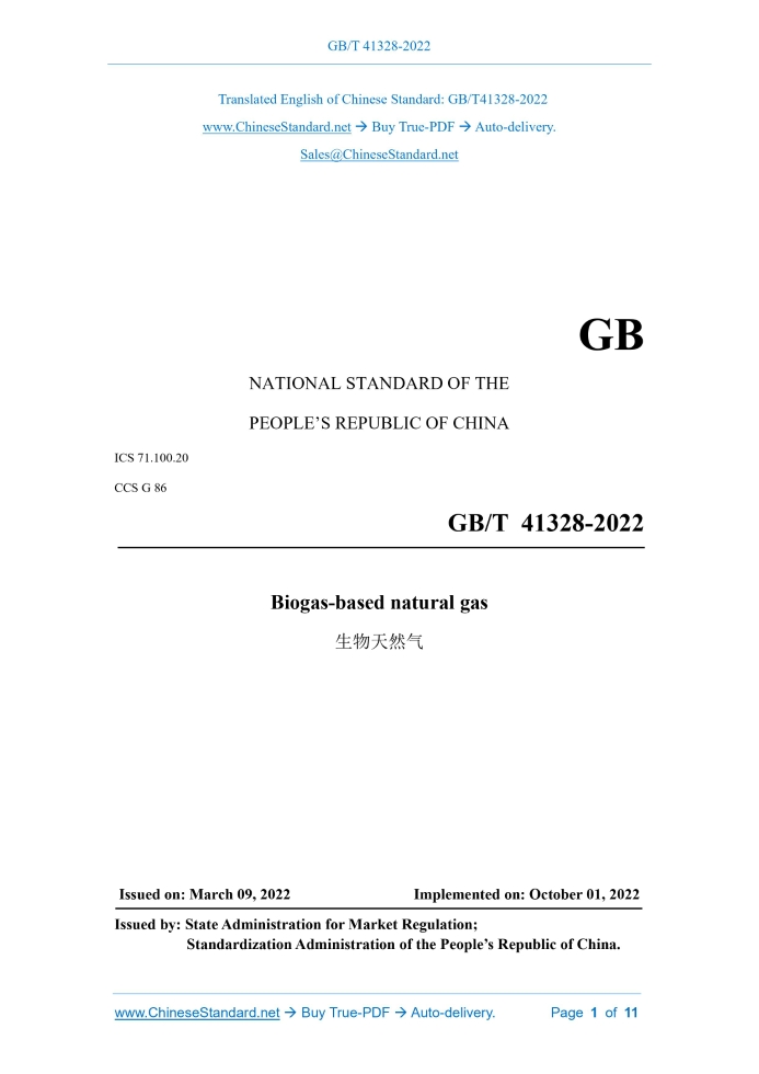 GB/T 41328-2022: Biogas-based natural gas Delivery: 9 seconds. True-PDF full-copy in English & invoice will be downloaded + auto-delivered via email. See step-by-step procedure Status: Valid