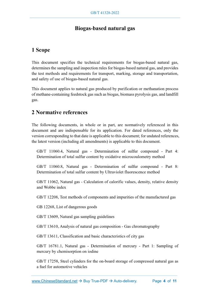 Similar standardsGB/T 41328-2022: Biogas-based natural gas---This is an excerpt. Full copy of true-PDF in English version (including equations, symbols, images, flow-chart, tables, and figures etc.), auto-downloaded/delivered in 9 seconds, can be purchased online: https://www.ChineseStandard.net/PDF.aspx/GBT41328-2022NATIONAL STANDARD OF THE PEOPLE’S REPUBLIC OF CHINA ICS 71.100.20 CCS G 86 Biogas-based natural gas 生物天然气 ISSUED ON: MARCH 09, 2022 IMPLEMENTED ON: OCTOBER 01, 2022 Issued by: State Administration for Market Regulation; Standardization Administration of the People’s Republic of China. Table of ContentsForeword ... 3 1 Scope ... 4 2 Normative references ... 4 3 Terms and definitions... 6 4 Technical requirements ... 6 5 Sampling and inspection rules ... 7 6 Test methods ... 8 7 Transport, marking, storage and transportation and safety of use ... 9 References ... 11 Biogas-based natural gas1 ScopeThis document specifies the technical requirements for biogas-based natural gas, determines the sampling and inspection rules for biogas-based natural gas, and provides the test methods and requirements for transport, marking, storage and transportation, and safety of use of biogas-based natural gas. This document applies to natural gas produced by purification or methanation process of methane-containing feedstock gas such as biogas, biomass pyrolysis gas, and landfill gas.2 Normative referencesThe following documents, in whole or in part, are normatively referenced in this document and are indispensable for its application. For dated references, only the version corresponding to that date is applicable to this document; for undated references, the latest version (including all amendments) is applicable to this document. GB/T 11060.4, Natural gas - Determination of sulfur compound - Part 4: Determination of total sulfur content by oxidative microcoulometry method GB/T 11060.8, Natural gas - Determination of sulfur compound - Part 8: Determination of total sulfur content by Ultraviolet fluorescence method GB/T 11062, Natural gas - Calculation of calorific values, density, relative density and Wobbe index GB/T 12208, Test methods of components and impurities of the manufactured gas GB 12268, List of dangerous goods GB/T 13609, Natural gas sampling guidelines GB/T 13610, Analysis of natural gas composition - Gas chromatography GB/T 13611, Classification and basic characteristics of city gas GB/T 16781.1, Natural gas - Determination of mercury - Part 1: Sampling of mercury by chemisorption on iodine GB/T 17258, Steel cylinders for the on-board storage of compressed natural gas as a fuel for automotive vehicles GB/T 17283, Determination of the water dew point of natural gas - Cooled surface condensation hygrometers GB 18047, Compressed natural gas as vehicle fuel GB/T 19158, Steel cylinders for the storage of compressed natural gas GB/T 22634, Conversion between water content and water dew point of natural gas GB/T 27893, Natural gas. Determination of particles content. Gravimetric method GB/T 28727, Gas analysis - Determination of sulfides - Gas chromatograph with flame photometric detector GB/T 33318, Gas analysis. Determination of sulfide. Gas chromatography with sulfur chemiluminescence GB/Z 33440, General requirements for interchangeability of natural gas entering long-distance pipeline network GB/T 33445-2016, Coal-based synthetic natural gas GB/T 37182, Gas analysis - Gas chromatograph with plasma emission detector GB 50028, Code for design of city gas engineering GB 50251, Design code for gas transmission pipeline engineering GB 50494, Technical Code for City Gas HJ 77.2, Ambient air and waste gas - Determination of polychlorinated dibenzo-p- dioxins (PCDDs) and polychlorinated dibenzofurans (PCDFs) - Isotope dilution HRGC-HRMS HJ 645, Ambient air - Determination of volatile halogenated hydrocarbons - Activated charcoal adsorption and carbon disulfide desorption/gas chromatographic method HJ 801, Ambient air and waste gas - Determination of amide compounds - Liquid chromatography JT/T 617 (all parts), Regulations concerning road transportation of dangerous goods TSG R0005, Supervision Regulation on Safety Technology for Transportable Pressure Vessel TSG 23, Regulation on Safety Technology for Gas Cylinder Compressed biogas-based natural gas shall be inspected in batches, and one operation shift shall inspect at least one batch every day. Take one sample from one batch for inspection. When any item in the inspection results does not meet the technical requirements of the corresponding category in this document, it shall be re-inspected according to the technical requirements of the next category; if it still does not meet the requirements, judge the batch of products to be unqualified. The supplier and the buyer shall negotiate to resolve the synthetic natural gas products that do not meet the indices.6 Test methods6.1 Component determination and calculation of high calorific value Use the methods specified in GB/T 13610, GB/T 33445, GB/T 37182, or other equivalent methods to determine the hydrogen content, oxygen content, nitrogen content, carbon dioxide content, carbon monoxide content, methane content, ethane content, propane content, isobutane content, n-butane content, neopentane content, isopentane content, n-pentane content, hexane content, heptane content and heavier alkane component content, olefinic component content and ammonia content in biogas- based natural gas. When there is any objection to the determination results, use the method specified in GB/T 13610 as the arbitration method. The calculation of the high calorific value of biogas-based natural gas shall be performed according to GB/T 11062. 6.2 Determination of hydrogen sulfide content Use GB/T 33318, GB/T 28727, GB/T 37182 to determine the hydrogen sulfide content in the biogas-based natural gas; use the methods specified in GB/T 33318, GB/T 11060.4, GB/T 11060.8 or other equivalent methods to de
