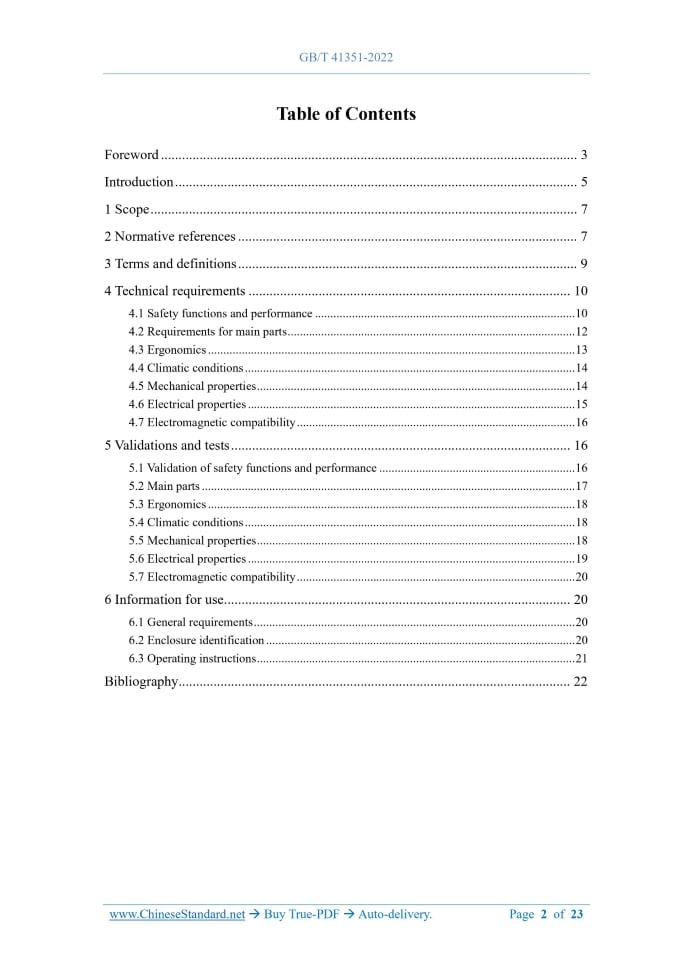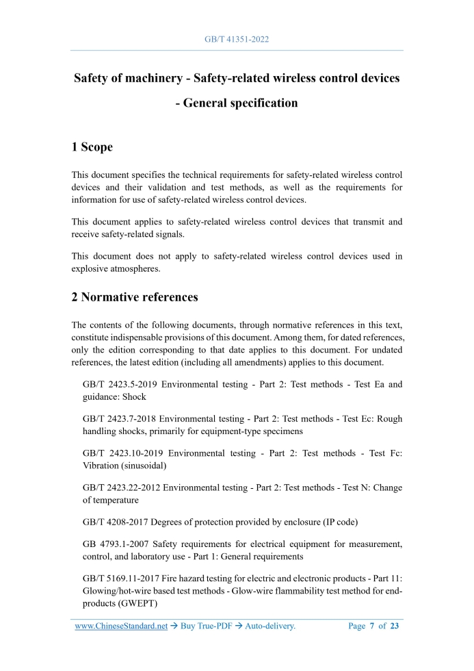 Similar standardsGB/T 41351-2022: Safety of machinery - Safety-related wireless control devices - General specification---This is an excerpt. Full copy of true-PDF in English version (including equations, symbols, images, flow-chart, tables, and figures etc.), auto-downloaded/delivered in 9 seconds, can be purchased online: https://www.ChineseStandard.net/PDF.aspx/GBT41351-2022 NATIONAL STANDARD OF THE PEOPLE’S REPUBLIC OF CHINA ICS 13.110 CCS J 09 Safety of machinery - Safety-related wireless control devices - General specification ISSUED ON: MARCH 09, 2022 IMPLEMENTED ON: OCTOBER 01, 2022 Issued by: State Administration for Market Regulation; Standardization Administration of the PRC. Table of ContentsForeword ... 3 Introduction ... 5 1 Scope ... 7 2 Normative references ... 7 3 Terms and definitions ... 9 4 Technical requirements ... 10 4.1 Safety functions and performance ... 10 4.2 Requirements for main parts ... 12 4.3 Ergonomics ... 13 4.4 Climatic conditions ... 14 4.5 Mechanical properties ... 14 4.6 Electrical properties ... 15 4.7 Electromagnetic compatibility ... 16 5 Validations and tests ... 16 5.1 Validation of safety functions and performance ... 16 5.2 Main parts ... 17 5.3 Ergonomics ... 18 5.4 Climatic conditions ... 18 5.5 Mechanical properties ... 18 5.6 Electrical properties ... 19 5.7 Electromagnetic compatibility ... 20 6 Information for use ... 20 6.1 General requirements ... 20 6.2 Enclosure identification ... 20 6.3 Operating instructions ... 21 Bibliography ... 22 Safety of machinery - Safety-related wireless control devices - General specification1 ScopeThis document specifies the technical requirements for safety-related wireless control devices and their validation and test methods, as well as the requirements for information for use of safety-related wireless control devices. This document applies to safety-related wireless control devices that transmit and receive safety-related signals. This document does not apply to safety-related wireless control devices used in explosive atmospheres.2 Normative referencesThe contents of the following documents, through normative references in this text, constitute indispensable provisions of this document. Among them, for dated references, only the edition corresponding to that date applies to this document. For undated references, the latest edition (including all amendments) applies to this document. GB/T 2423.5-2019 Environmental testing - Part 2: Test methods - Test Ea and guidance: Shock GB/T 2423.7-2018 Environmental testing - Part 2: Test methods - Test Ec: Rough handling shocks, primarily for equipment-type specimens GB/T 2423.10-2019 Environmental testing - Part 2: Test methods - Test Fc: Vibration (sinusoidal) GB/T 2423.22-2012 Environmental testing - Part 2: Test methods - Test N: Change of temperature GB/T 4208-2017 Degrees of protection provided by enclosure (IP code) GB 4793.1-2007 Safety requirements for electrical equipment for measurement, control, and laboratory use - Part 1: General requirements GB/T 5169.11-2017 Fire hazard testing for electric and electronic products - Part 11: Glowing/hot-wire based test methods - Glow-wire flammability test method for end- products (GWEPT) The safety functions, which can be achieved by the safety-related wireless control device, shall be described in the operating instructions. The stop/emergency stop function shall take precedence over the machine start function. Resetting after an emergency stop shall not be dangerous. 4.1.2 Performance level (PL) or safety integrity level (SIL) The manufacturer shall provide at least the following main safety-related parameters: - Performance level (PL) or safety integrity level (SIL); - Category (Cat.); - Mean hourly probability of dangerous failure (PFHD). When necessary, the manufacturer shall also provide the following compliance verification information: - Mean time to dangerous failure per channel (MTTFD); - Diagnostic coverage (DC); - Mean cycles to dangerous failure (B10D); - Common cause failure (CCF). Note: See GB/T 30175-2013 for the relationship between PL and SIL. 4.1.3 Response time Under normal and/or fault conditions (for example, component failure or transmission signal interference), the time between the command issued by the control unit and the control signal output by the receiver shall not exceed the range given by the manufacturer. During the working period, it shall repeatedly send the data frame. The interval between two data frames shall be within the range given by the manufacturer. If out of range, the receiver shall bring the equipment into a safe state. 4.1.4 Prevent misuse It shall take measures (e.g., passwords or special keys) to prevent unauthorized personnel from operating the safety-related wireless control device. Each control unit shall be able to identify its corresponding machine. When the machine is controlled by a local control device (control device other than the control unit), measures shall be taken to prevent the machine from being out of control due to the misuse of the control unit. Parameters, such as transmission frequency and address assignment of wireless security control devices, shall only be set and managed by authorized professionals. 4.1.5 Power supply safety Changes in the supply voltage shall not be dangerous. When performing one or more potentially dangerous movements, if the supply voltage exceeds the allowable range, the control unit shall generate an audio-visual alarm signal. If the cell voltage of the control unit drops to a level where reliable signal transmission cannot be guaranteed, the control unit shall issue a stop command; then issue a command to no longer send data, until the control unit is turned on again. 4.1.6 Multiple control units and multiple machines When multiple control units correspond to the same receiver, measures shall be taken to ensure that only one control unit works at the same time. If it is necessary to transfer control from one 