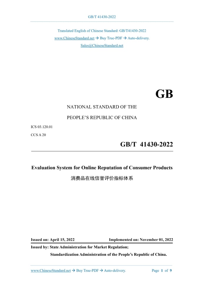 GB/T 41430-2022: Evaluation system for online reputation of consumer products Delivery: 9 seconds. True-PDF full-copy in English & invoice will be downloaded + auto-delivered via email. See step-by-step procedure Status: Valid