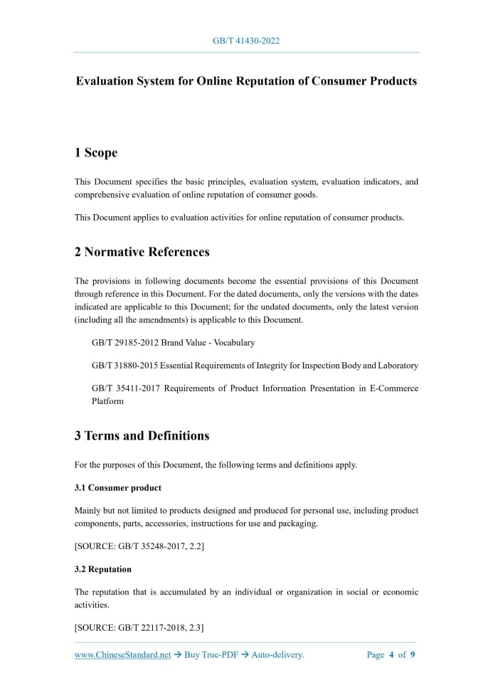 Similar standardsGB/T 41430-2022: Evaluation system for online reputation of consumer products---This is an excerpt. Full copy of true-PDF in English version (including equations, symbols, images, flow-chart, tables, and figures etc.), auto-downloaded/delivered in 9 seconds, can be purchased online: https://www.ChineseStandard.net/PDF.aspx/GBT41430-2022NATIONAL STANDARD OF THE PEOPLE’S REPUBLIC OF CHINA ICS 03.120.01 CCS A 20 Evaluation System for Online Reputation of Consumer Products ISSUED ON: APRIL 15, 2022 IMPLEMENTED ON: NOVEMBER 01, 2022 Issued by: State Administration for Market Regulation; Standardization Administration of the People’s Republic of China. Table of ContentsForeword ... 3 1 Scope ... 4 2 Normative References ... 4 3 Terms and Definitions ... 4 4 Basic Principles ... 5 5 Evaluation Index System ... 6 6 Evaluation Index ... 6 7 Comprehensive Evaluation of Online Reputation of Consumer Products ... 8 Bibliography ... 9 Evaluation System for Online Reputation of Consumer Products1 ScopeThis Document specifies the basic principles, evaluation system, evaluation indicators, and comprehensive evaluation of online reputation of consumer goods. This Document applies to evaluation activities for online reputation of consumer products.2 Normative ReferencesThe provisions in following documents become the essential provisions of this Document through reference in this Document. For the dated documents, only the versions with the dates indicated are applicable to this Document; for the undated documents, only the latest version (including all the amendments) is applicable to this Document. GB/T 29185-2012 Brand Value - Vocabulary GB/T 31880-2015 Essential Requirements of Integrity for Inspection Body and Laboratory GB/T 35411-2017 Requirements of Product Information Presentation in E-Commerce Platform3 Terms and DefinitionsFor the purposes of this Document, the following terms and definitions apply. 3.1 Consumer product Mainly but not limited to products designed and produced for personal use, including product components, parts, accessories, instructions for use and packaging. [SOURCE: GB/T 35248-2017, 2.2] 3.2 Reputation The reputation that is accumulated by an individual or organization in social or economic activities. [SOURCE: GB/T 22117-2018, 2.3] 3.3 Online reputation A reputation that is formed through network transmission and existing in the minds of the network public. NOTE: Also known as online word-of-mouth. 3.4 Evaluation index system An overall system that is composed of elements such as index system and evaluation method for the purpose of evaluating things. [SOURCE: GB/T 27922-2011, 3.5] 3.5 Integrity The honest and trustworthy behavior and norms of individuals and/or organizations, including the consistency of commitment and behavior in their business activities. [SOURCE: GB/T 31880-2015, 3.2]4 Basic Principles4.1 The online reputation evaluation index system of consumer products shall consider relevant indicators that affect the quality of online consumer products and user experience from multiple dimensions and all aspects; and consider the hierarchical distribution and weight distribution of different indicators to ensure the scientificalness of the evaluation index system. 4.2 The online reputation of consumer products is different from the reputation of consumer products under the traditional sales model. The evaluation of its online reputation directly determines the willingness of consumers to buy. The online reputation of a consumer product is the recognition of an online consumer product. The online reputation evaluation index system of consumer products shall comprehensively consider the factors related to the reputation of online consumer products, highlighting the characteristics of online sales. 4.3 The online reputation index system of consumer products needs to consider factors such as consumer products themselves, sales platforms, and related parties, as well as factors such as after-sales evaluation, customer complaints, consumer product recalls, injury accidents, etc. The evaluation index system shall not only be perfect, but also take into account its operability. 4.4 The online classification of consumer products shall consider the inspection and testing reports issued by inspection and testing agencies with higher integrity levels. The basic requirements for the integrity of the inspection and testing agencies shall comply with the provisions of GB/T 31880-2015. The degree to which the actual use function and functional durability of the consumer products meet the relevant requirements, and the degree to which it conforms to the online consumer product description. 6.1.4 Added value of consumer products On the basis that the function and safety indexes of consumer products meet the relevant requirements, it reflects the added value of consumer products, such as technology level, science-tech content, and humanized design, etc. 6.2 Enterprise reputation 6.2.1 Description compliance of consumer products The product information displayed on the e-commerce trading platform shall be consistent with the product actually received by the buyer and the information on the product. When using more than two languages, their contents shall be consistent. The description compliance shall comply with the provisions in GB/T 35411-2017. 6.2.2 Sales volume of consumer products It mainly includes information such as monthly sales and annual sales, which are the core indexes that affect consumers' choice of products. 6.2.3 After-sales service of consumer products The after-sales service of online consumer products includes after-sales service of the manufacturer of consumer products, return and exchange services of consumer products, logistics and distribution, and services such as information assistance from sellers or spare parts support and maintenance when consumer products fail. 6.3 Sales platform reputation 6.3.1 Platform popularity The degree to whi