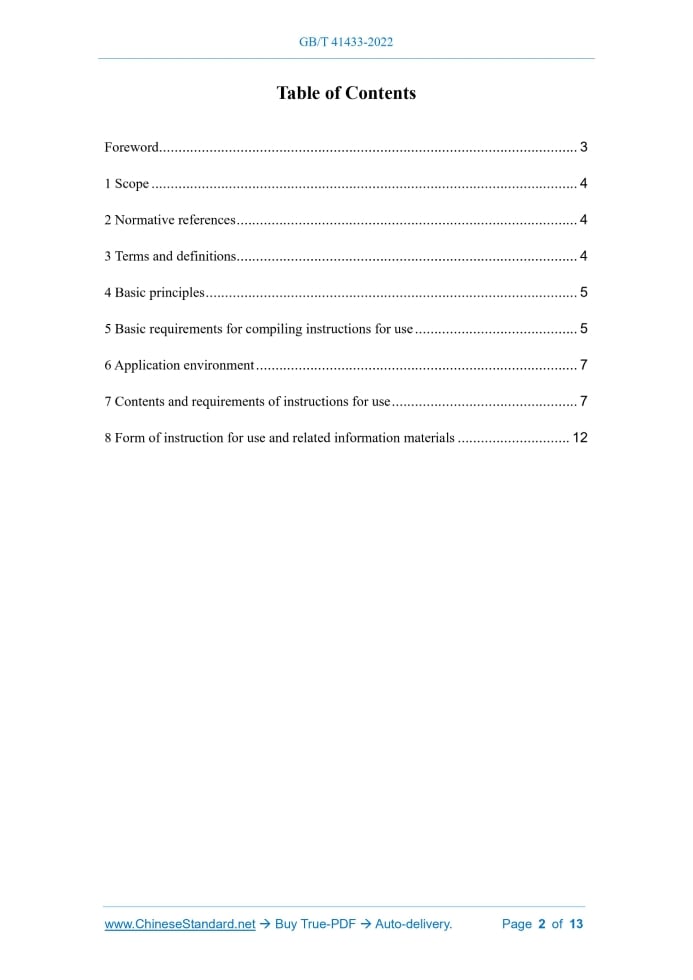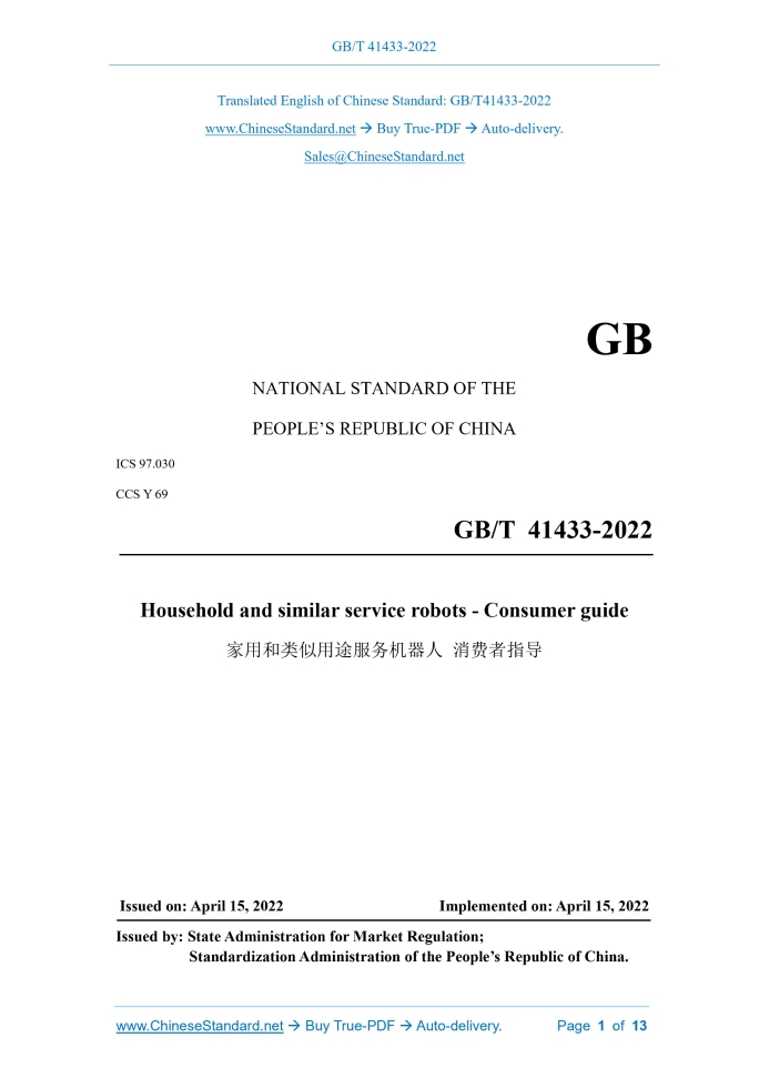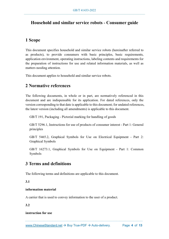Similar standardsGB/T 41433-2022: Household and similar service robots - Consumer guide---This is an excerpt. Full copy of true-PDF in English version (including equations, symbols, images, flow-chart, tables, and figures etc.), auto-downloaded/delivered in 9 seconds, can be purchased online: https://www.ChineseStandard.net/PDF.aspx/GBT41433-2022NATIONAL STANDARD OF THE PEOPLE’S REPUBLIC OF CHINA ICS 97.030 CCS Y 69 Household and similar service robots - Consumer guide ISSUED ON: APRIL 15, 2022 IMPLEMENTED ON: APRIL 15, 2022 Issued by: State Administration for Market Regulation; Standardization Administration of the People’s Republic of China. Table of ContentsForeword ... 3 1 Scope ... 4 2 Normative references ... 4 3 Terms and definitions... 4 4 Basic principles ... 5 5 Basic requirements for compiling instructions for use ... 5 6 Application environment ... 7 7 Contents and requirements of instructions for use ... 7 8 Form of instruction for use and related information materials ... 12 Household and similar service robots - Consumer guide1 ScopeThis document specifies household and similar service robots (hereinafter referred to as products), to provide consumers with basic principles, basic requirements, application environment, operating instructions, labeling contents and requirements for the preparation of instructions for use and related information materials, as well as matters needing attention. This document applies to household and similar service robots.2 Normative referencesThe following documents, in whole or in part, are normatively referenced in this document and are indispensable for its application. For dated references, only the version corresponding to that date is applicable to this document; for undated references, the latest version (including all amendments) is applicable to this document. GB/T 191, Packaging - Pictorial marking for handling of goods GB/T 5296.1, Instructions for use of products of consumer interest - Part 1: General principles GB/T 5465.2, Graphical Symbols for Use on Electrical Equipment - Part 2: Graphical Symbols GB/T 16273.1, Graphical Symbols for Use on Equipment - Part 1: Common Symbols3 Terms and definitionsThe following terms and definitions are applicable to this document. 3.1 information material A carrier that is used to convey information to the user of a product. 3.2 instruction for use Information that is used to communicate with users on how to use the product correctly and safely, as well as its related product functions, basic performance, and characteristics. Note: Instructions for use are usually expressed in the form of operating manuals, labels, nameplates, and interactive interfaces. Instructions for use can be represented by documents, words, signs, symbols, charts, diagrams, and auditory or visual information, either individually or in combination. Instructions for use can be used on products [including: instructions on equipment manipulators (keys, buttons), electronic display instructions in equipment operation], on packaging, or be delivered as accompanying documents or materials (such as loose-leaf materials, manuals, CD-ROMs, etc.), or be obtained remotely (such as a website, mobile application, etc.).4 Basic principles4.1 In order to help users use the product more safely and conveniently, the manufacturer shall provide clear, specific and effective information materials to guide the user to understand the use or operation method of the product in a more detailed and intuitive manner. 4.2 Information material shall be provided in a compatible manner to ensure simplicity, accuracy, intelligibility and accessibility.5 Basic requirements for compiling instructions for use5.1 General 5.1.1 Indivisibility As an integral part of the delivered product, the basic content and general requirements of the instruction for use shall comply with the provisions of GB/T 5296.1. 5.1.2 Authenticity The instruction for use shall truthfully introduce the product, with neither exaggeration nor falsehood, and shall not cover up defects in product design by the instruction for use. 5.1.3 Simplicity The content of the instruction for use shall be concise, accurate, and easy to read and understand. 5.1.4 Correct use and maintenance 5.2.4.1 When the instruction for use exceeds one page, each page shall have a page number; when there are many chapters and articles in the instruction for use, a table of contents shall be written. 5.2.4.2 The headings in the table of contents shall be the same as those used in the body text. 5.3 Durability requirements 5.3.1 The text, signs and graphic symbols of the instruction for use shall always be clear and conspicuous during the service life of the product. 5.3.2 The instruction for use marked on the product shall always be firm and not easy to fall off during the service life of the product. 5.3.3 The instruction for use shall be guaranteed to be frequently read by users without damage during the service life of the product. 5.3.4 The information in the instruction for use that can only be obtained by remote means shall be guaranteed to be available to the user at any time during the service life of the product.6 Application environment6.1 The application environment of the product, such as voltage, temperature and humidity, air pressure and other environmental requirements, and other requirements such as load, shall be clearly stated in the instruction for use. If the product may encounter special scenes or drastic changes in the environment during normal use, the user shall be reminded of the dangers that may arise in this situation in the instruction for use. 6.2 Considering the diversity of users, not all users can read, use and understand the instruction for use; therefore, the compilation of the instruction for use shall take into account the characteristics and needs of specific application situations and consumer groups, such as the elderly, children, etc. Under foreseeable circumstances, the