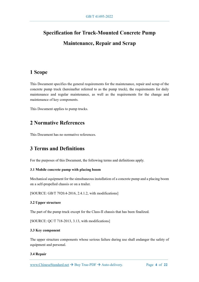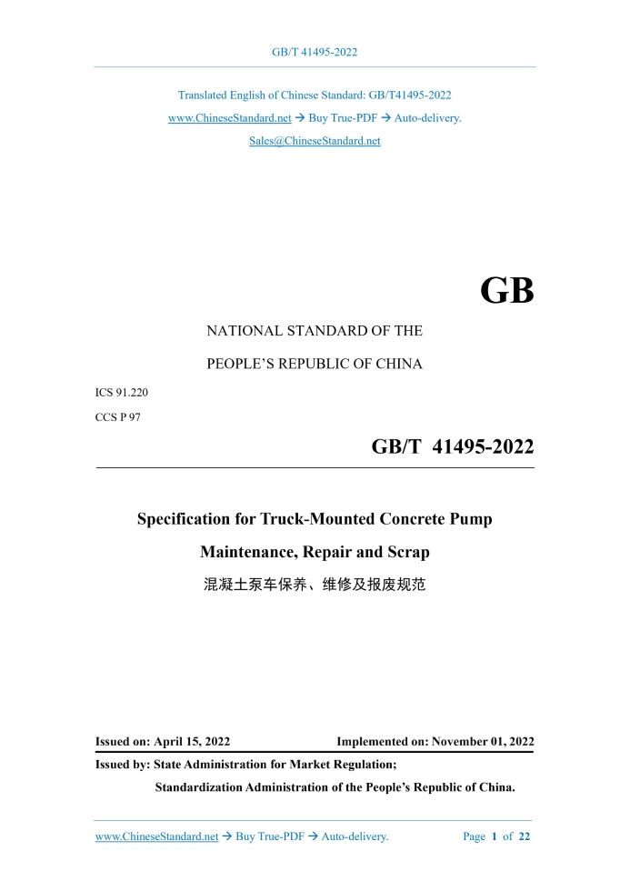 GB/T 41495-2022: Specification for truck-mounted concrete pump maintenance, repair and scrap Delivery: 9 seconds. True-PDF full-copy in English & invoice will be downloaded + auto-delivered via email. See step-by-step procedure Status: Valid