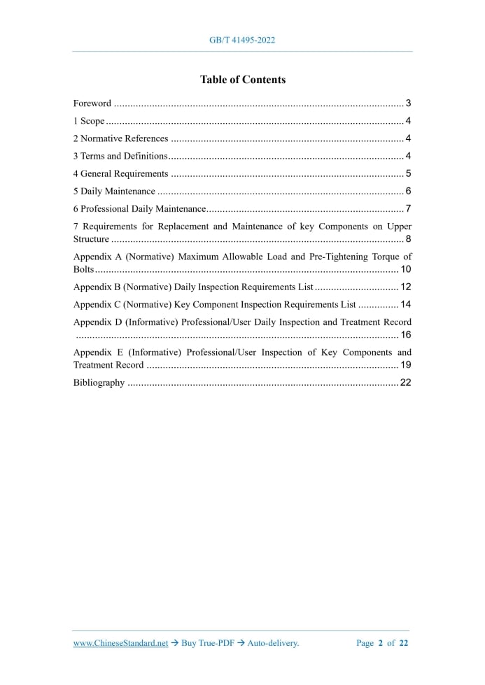 Similar standardsGB/T 41495-2022: Specification for truck-mounted concrete pump maintenance, repair and scrap---This is an excerpt. Full copy of true-PDF in English version (including equations, symbols, images, flow-chart, tables, and figures etc.), auto-downloaded/delivered in 9 seconds, can be purchased online: https://www.ChineseStandard.net/PDF.aspx/GBT41495-2022NATIONAL STANDARD OF THE PEOPLE’S REPUBLIC OF CHINA ICS 91.220 CCS P 97 Specification for Truck-Mounted Concrete Pump Maintenance, Repair and Scrap ISSUED ON: APRIL 15, 2022 IMPLEMENTED ON: NOVEMBER 01, 2022 Issued by: State Administration for Market Regulation; Standardization Administration of the People’s Republic of China. Table of ContentsForeword ... 3 1 Scope ... 4 2 Normative References ... 4 3 Terms and Definitions ... 4 4 General Requirements ... 5 5 Daily Maintenance ... 6 6 Professional Daily Maintenance ... 7 7 Requirements for Replacement and Maintenance of key Components on Upper Structure ... 8 Appendix A (Normative) Maximum Allowable Load and Pre-Tightening Torque of Bolts ... 10 Appendix B (Normative) Daily Inspection Requirements List ... 12 Appendix C (Normative) Key Component Inspection Requirements List ... 14 Appendix D (Informative) Professional/User Daily Inspection and Treatment Record ... 16 Appendix E (Informative) Professional/User Inspection of Key Components and Treatment Record ... 19 Bibliography ... 22 Specification for Truck-Mounted Concrete Pump Maintenance, Repair and Scrap1 ScopeThis Document specifies the general requirements for the maintenance, repair and scrap of the concrete pump truck (hereinafter referred to as the pump truck), the requirements for daily maintenance and regular maintenance, as well as the requirements for the change and maintenance of key components. This Document applies to pump trucks.2 Normative ReferencesThis Document has no normative references.3 Terms and DefinitionsFor the purposes of this Document, the following terms and definitions apply. 3.1 Mobile concrete pump with placing boom Mechanical equipment for the simultaneous installation of a concrete pump and a placing boom on a self-propelled chassis or on a trailer. [SOURCE: GB/T 7920.4-2016, 2.4.1.2, with modifications] 3.2 Upper structure The part of the pump truck except for the Class-II chassis that has been finalized. [SOURCE: QC/T 718-2013, 3.13, with modifications] 3.3 Key component The upper structure components whose serious failure during use shall endanger the safety of equipment and personal. 3.4 Repair maintenance of the pump truck shall be carried out according to the requirements of the pump truck manufacturer; and the chassis shall be maintained according to the requirements of the chassis manufacturer. 4.2 The pump truck that has been out of use for more than one month shall be maintained once before being reused. 4.3 On-site safety protection measures shall be implemented during on-site maintenance operations to ensure operational safety. On-site professional maintenance personnel shall be no less than 2; and special operators with certification requirements shall be certified to work. 4.4 If the high-strength bolts used for connection are loosened or reassembled, they shall be tightened with a torque wrench. The tightening torque of each type of connection thread shall meet the requirements of Appendix A. High-strength connecting bolts and nuts disassembled for structural maintenance shall not be used again; and new connecting bolts and nuts of the same grade shall be used for reassembly. 4.5 When the key component fails, it shall be shut down immediately for repair or replacement; after repair or replacement, it shall be operated according to the relevant provisions of the manufacturer, and check whether the equipment is running normally. 4.6 The key components such as boom, connecting rod, bottom frame and outrigger shall be welded by qualified personnel appointed by the equipment manufacturer. 4.7 The welding consumables for welding maintenance, materials replacement and maintenance procedures shall be approved in written by the manufacturer or professional maintenance personnel. 4.8 The maintenance of structural welds shall be recorded in the equipment file; and the equipment operator shall check it before starting each shift to confirm that there is no abnormality. The same weld repair shall not exceed 3 times, otherwise its components shall be scrapped. 4.9 The electrical wiring on the equipment shall not be modified without permission. 4.10 Solid waste generated during maintenance shall be collected and stored centrally; the remaining or discarded lubricating oil (grease) and hydraulic oil shall be placed in containers and properly disposed of.5 Daily Maintenance5.1 Daily inspection shall be carried out in accordance with Appendix B for each shift; and parts and components shall be visually inspected for cracks or damage according to Appendix C. The remaining parts and components shall be subject to daily maintenance according to the Maintenance Manual provided by the manufacturer. In order to ensure the inspection effect, the following actions shall be ensured before inspection: a) Clean up the rubbish, snow and other obstacles on the pump truck; b) Clean up oil stains and sundries on each working mechanism. 5.2 Any found abnormality shall be dealt with in time; so that the pump truck can reach the normal operation state. 5.3 The inspection and processing results are recorded in Appendix D.6 Professional Daily Maintenance6.1 In order to ensure the strict implementation of daily maintenance of the pump truck, the user of the pump truck should establish a maintenance ledger (including but not limited to data such as pumping time and pumping volume). Users shall not modify the pumping data of the pump truck equipment without permission. 6.2 The interval of professional daily maintenance is determined by the service life of the equipment, the cumulative pumping time, and the cu