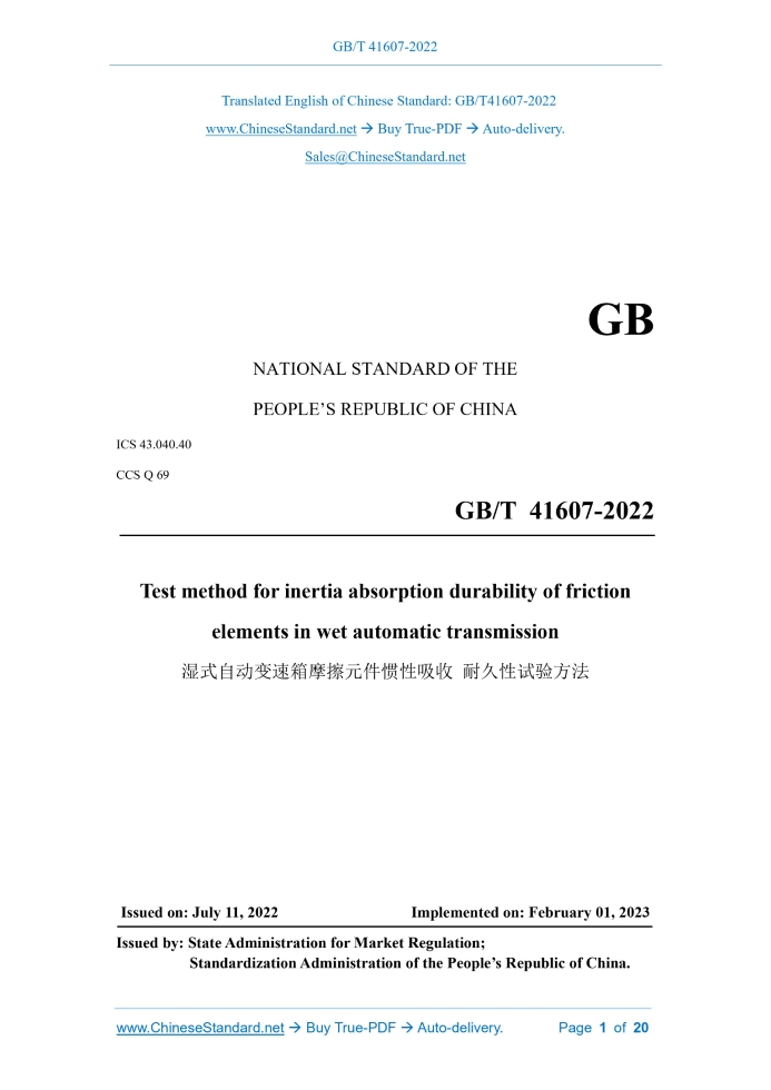 GB/T 41607-2022: Test method for inertia absorption durability of friction elements in wet automatic transmission Delivery: 9 seconds. True-PDF full-copy in English & invoice will be downloaded + auto-delivered via email. See step-by-step procedure Status: Valid