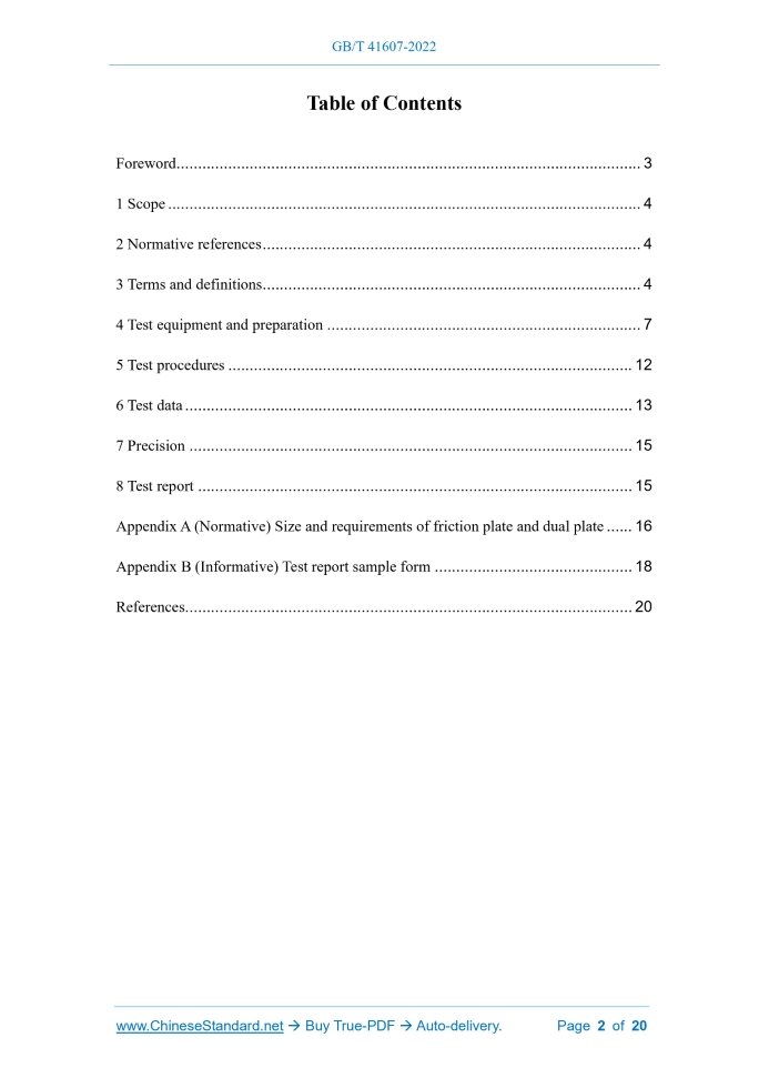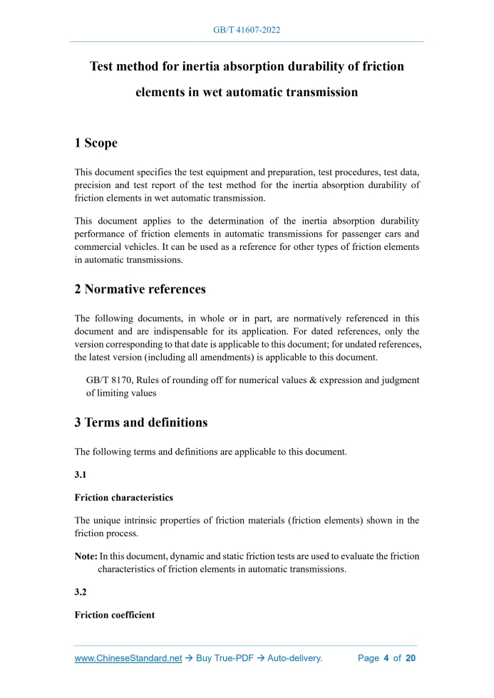 Similar standardsGB/T 41607-2022: Test method for inertia absorption durability of friction elements in wet automatic transmission---This is an excerpt. Full copy of true-PDF in English version (including equations, symbols, images, flow-chart, tables, and figures etc.), auto-downloaded/delivered in 9 seconds, can be purchased online: https://www.ChineseStandard.net/PDF.aspx/GBT41607-2022 NATIONAL STANDARD OF THE PEOPLE’S REPUBLIC OF CHINA ICS 43.040.40 CCS Q 69 Test method for inertia absorption durability of friction elements in wet automatic transmission ISSUED ON: JULY 11, 2022 IMPLEMENTED ON: FEBRUARY 01, 2023 Issued by: State Administration for Market Regulation; Standardization Administration of the People’s Republic of China. Table of ContentsForeword ... 3 1 Scope ... 4 2 Normative references ... 4 3 Terms and definitions... 4 4 Test equipment and preparation ... 7 5 Test procedures ... 12 6 Test data ... 13 7 Precision ... 15 8 Test report ... 15 Appendix A (Normative) Size and requirements of friction plate and dual plate ... 16 Appendix B (Informative) Test report sample form ... 18 References ... 20 Test method for inertia absorption durability of friction elements in wet automatic transmission1 ScopeThis document specifies the test equipment and preparation, test procedures, test data, precision and test report of the test method for the inertia absorption durability of friction elements in wet automatic transmission. This document applies to the determination of the inertia absorption durability performance of friction elements in automatic transmissions for passenger cars and commercial vehicles. It can be used as a reference for other types of friction elements in automatic transmissions.2 Normative referencesThe following documents, in whole or in part, are normatively referenced in this document and are indispensable for its application. For dated references, only the version corresponding to that date is applicable to this document; for undated references, the latest version (including all amendments) is applicable to this document. GB/T 8170, Rules of rounding off for numerical values & expression and judgment of limiting values3 Terms and definitionsThe following terms and definitions are applicable to this document. 3.1 Friction characteristics The unique intrinsic properties of friction materials (friction elements) shown in the friction process. Note: In this document, dynamic and static friction tests are used to evaluate the friction characteristics of friction elements in automatic transmissions. 3.2 Friction coefficient The ratio of the friction force generated TO the force exerted on the friction element when there is relative movement or relative movement tendency between the friction plate and the dual plate. Note 1: The friction coefficient is divided into dynamic friction coefficient and static friction coefficient. Note 2: The dynamic friction coefficient and static friction coefficient shall be calculated according to Formula (1), and the results shall be rounded off to 3 decimal places according to GB/T 8170. Where: μ – friction coefficient; T – friction torque, in Newton meter (N·m); n – number of friction plates (n=3); r – average effective friction radius, in millimeters (mm), which shall be 57.4 mm; p – the surface pressure loaded on the friction surface of the friction plate, in kilopascals (kPa), which shall be 785 kPa; A – the friction area of the friction plate, in square millimeters (mm2), which shall be 4 434 mm2. 3.3 Dynamic friction coefficient The ratio BETWEEN the friction force generated by the relative motion between the friction plate and the dual plate AND the positive pressure, when there is relative motion between the friction plate and the dual plate, Note: The dynamic friction coefficient (μd, μ0) is calculated according to Formula (2) and Formula (3). Where: 4.2 Test preparation 4.2.1 Friction plate preparation The size of the friction plate shall meet the requirements of A.1 in Appendix A. Soak the friction plate which is stored in the desiccator in the test oil for more than 2 h; take it out and wipe the test oil. Then, use a micrometer to measure the thickness of the friction plate at four points every 90°, accurate to 0.001 mm. Mark test points on surfaces that are not rubbed. 4.2.2 Dual plate preparation The size of the dual plate shall meet the requirements of A.2. The dual plate used shall be cleaned of oil on the surface using ultrasonic waves in a solvent such as hexane, wiped with lint-free paper, and dried at room temperature. 4.2.3 Testing machine preparation After each test, the test oil chamber and each oil pipe shall be thoroughly cleaned and dried with a solvent such as hexane. When measuring the oil temperature, the thermocouple shall be fixed at a position 2 mm from the end face and horizontal to the test oil chamber. 4.2.4 Installation of friction components Install the friction plate and the dual plate one by one; pay attention to adjusting the friction gap at the position of 0.8 mm ± 0.2 mm. The dual plate and friction plate shall be installed as shown in Figure 5; pay attention to the installation direction (A, B and A’, B’ in Figure 5); the clearance between the friction components is calculated according to Formula (6) and adjusted to 0.8 mm ± 0.2 mm. As shown in Figure 5, the total thickness of the friction components shall be measured when the pressure is loaded. Where: CL – clearance, in millimeters (mm); Ls – total length of the test oil tank, in millimeters (mm); Ld – total thickness of friction components, in millimeters (mm). 6.2.1 Friction plate After 5 000 times of braking, observe the 6 faces of the friction plate, observe and record the following conditions: a) Wear and tear of the friction plate; b) Discoloration or ablation on the surface of the friction plate; c) Whether there is material peeling on the friction surface; d) Whether there is blocking on the su