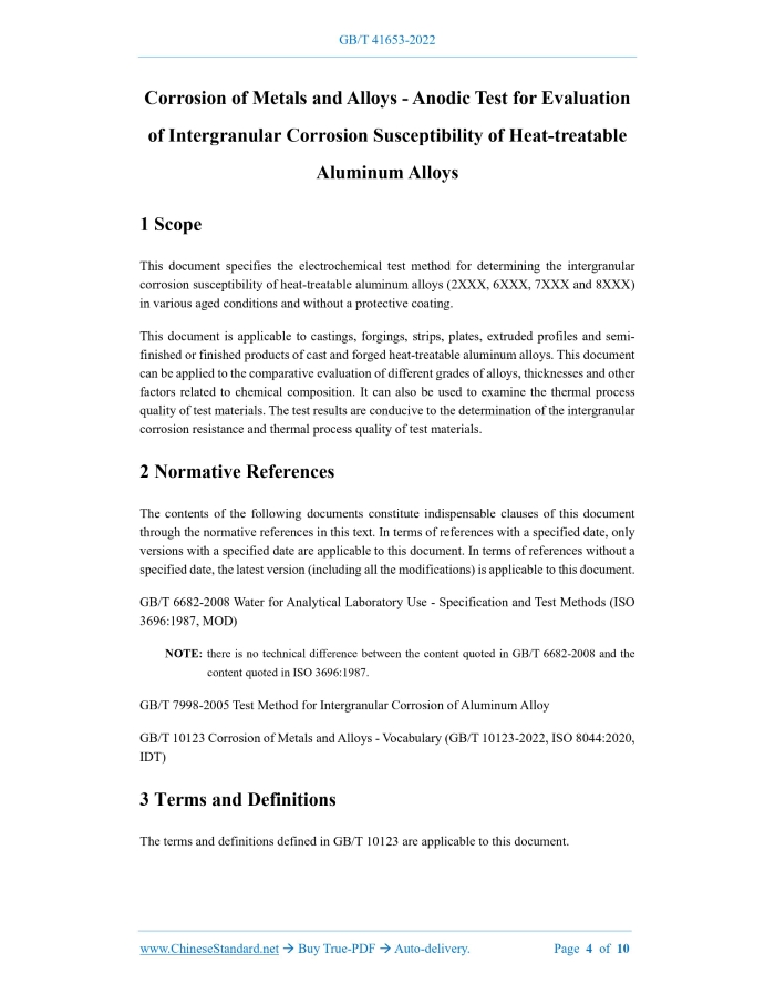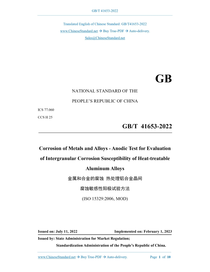 GB/T 41653-2022: Corrosion of metals and alloys - Anodic test for evaluation of intergranular corrosion susceptibility of heat-treatable aluminium alloys Delivery: 9 seconds. True-PDF full-copy in English & invoice will be downloaded + auto-delivered via email. See step-by-step procedure Status: Valid
