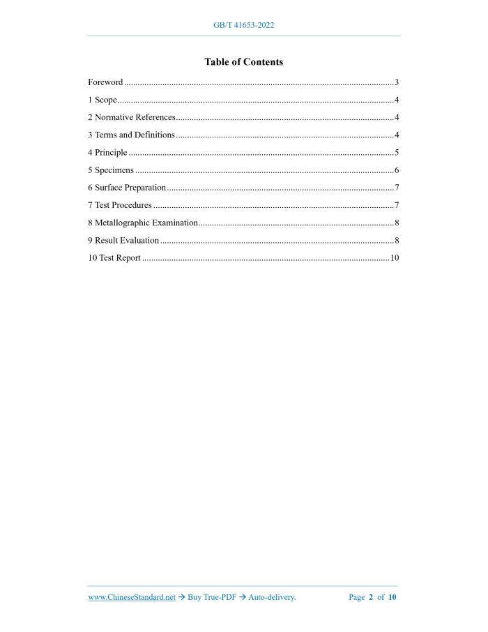 Similar standardsGB/T 41653-2022: Corrosion of metals and alloys - Anodic test for evaluation of intergranular corrosion susceptibility of heat-treatable aluminium alloys---This is an excerpt. Full copy of true-PDF in English version (including equations, symbols, images, flow-chart, tables, and figures etc.), auto-downloaded/delivered in 9 seconds, can be purchased online: https://www.ChineseStandard.net/PDF.aspx/GBT41653-2022 GB NATIONAL STANDARD OF THE PEOPLE’S REPUBLIC OF CHINA ICS 77.060 CCS H 25 Corrosion of Metals and Alloys - Anodic Test for Evaluation of Intergranular Corrosion Susceptibility of Heat-treatable Aluminum Alloys (ISO 15329:2006, MOD) ISSUED ON: JULY 11, 2022 IMPLEMENTED ON: FEBRUARY 1, 2023 Issued by: State Administration for Market Regulation; Standardization Administration of the People’s Republic of China. Table of ContentsForeword ... 3 1 Scope ... 4 2 Normative References ... 4 3 Terms and Definitions ... 4 4 Principle ... 5 5 Specimens ... 6 6 Surface Preparation ... 7 7 Test Procedures ... 7 8 Metallographic Examination ... 8 9 Result Evaluation ... 8 10 Test Report ... 10 Corrosion of Metals and Alloys - Anodic Test for Evaluation of Intergranular Corrosion Susceptibility of Heat-treatable Aluminum Alloys1 ScopeThis document specifies the electrochemical test method for determining the intergranular corrosion susceptibility of heat-treatable aluminum alloys (2XXX, 6XXX, 7XXX and 8XXX) in various aged conditions and without a protective coating. This document is applicable to castings, forgings, strips, plates, extruded profiles and semi- finished or finished products of cast and forged heat-treatable aluminum alloys. This document can be applied to the comparative evaluation of different grades of alloys, thicknesses and other factors related to chemical composition. It can also be used to examine the thermal process quality of test materials. The test results are conducive to the determination of the intergranular corrosion resistance and thermal process quality of test materials.2 Normative ReferencesThe contents of the following documents constitute indispensable clauses of this document through the normative references in this text. In terms of references with a specified date, only versions with a specified date are applicable to this document. In terms of references without a specified date, the latest version (including all the modifications) is applicable to this document. GB/T 6682-2008 Water for Analytical Laboratory Use - Specification and Test Methods (ISO 3696:1987, MOD) NOTE: there is no technical difference between the content quoted in GB/T 6682-2008 and the content quoted in ISO 3696:1987. GB/T 7998-2005 Test Method for Intergranular Corrosion of Aluminum Alloy GB/T 10123 Corrosion of Metals and Alloys - Vocabulary (GB/T 10123-2022, ISO 8044:2020, IDT)3 Terms and DefinitionsThe terms and definitions defined in GB/T 10123 are applicable to this document.4 Principle4.1 This test method is based on the following principle: if aluminum alloys are susceptible to intergranular corrosion, the susceptibility is manifested in the rupture of the surface oxide film when it is anodic polarized in a solution containing chloride ions. 4.2 The intergranular corrosion susceptibility of solution-heat-treatable aluminum alloys depends on the alloy composition, manufacturing method, solution heat treatment, quench treatment and artificial precipitation hardening (ageing) treatment. 4.3 In the naturally aged condition, the intergranular corrosion susceptibility of solution-heat- treatable aluminum alloys mainly depends on the cooling rate in the critical temperature range during quenching. 4.4 Regardless of the type of pitting initiation and extended zones (intergranular or transgranular), depassivation (destruction of the passive state of the metal) occurs at the pitting initiation potential (Epi). At a potential slightly positive than the initiation potential of pitting corrosion, the development of intergranular corrosion frequently occurs. 4.5 Historically, the acceleration methods for intergranular corrosion testing have tended towards arbitrary, possibly extreme conditions, including either externally applied current (galvanostatic) or externally applied potential (potentiostatic). This type of tests can be improved by selecting electrochemical effects, considering the following factors associated with the anodic properties of the material: a) The relative cathodic phase of the material; b) The chemical composition of the test medium. 4.6 The test method begins with the anodic polarization of the specimen, so as to determine the subsequent externally applied potential. As with other accelerated tests, the test results must be correlated with the service properties of the material being tested. 4.7 Metallographic examination is required to determine localized corrosion patterns. 4.8 The principle involves anodic polarization of the specimen in aqueous solution of sodium chloride (NaCl) to a potential (Eic) that exhibits intergranular corrosion susceptibility and exposure at this potential (see Figure 1). 5.2.2 Specimens with surface defects (metallurgical or mechanical) should not be used for testing. 5.2.3 Not less than three parallel specimens of the same shape, dimension and surface condition should be used for the test.6 Surface Preparation6.1 Before the test, the specimen should be mechanically ground. Use a soft brush and an organic solvent (hydrocarbon solvent with a boiling point of 60 C ~ 120 C) to degrease it, or perform ultrasonic cleaning in a container full of solvent. After cleaning, the specimen should be rinsed with fresh solvent, dried and stored in a desiccator for 1 h before testing. 6.2 In accordance with GB/T 7998-2005, perform the pre-treatment.7 Test Procedures7.1 Naturally aged alloys are tested 24 h after quenching. Artificially aged alloys can be tested in accordance with this method at any time. 7.2 Before the test, use dist