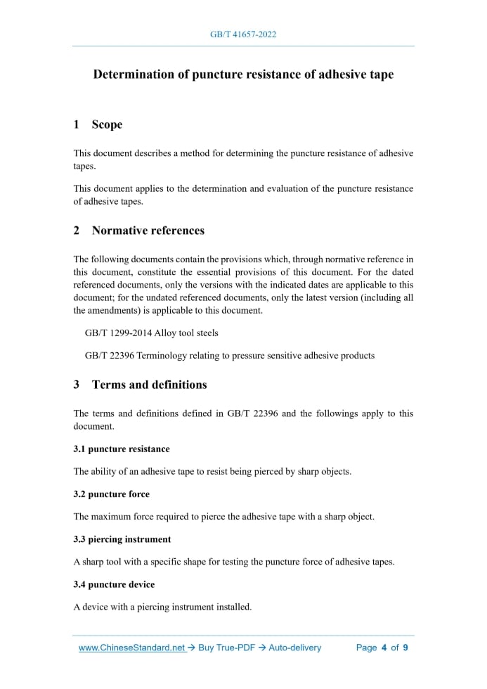 Similar standardsGB/T 41657-2022: Determination of puncture resistance of adhesive tape---This is an excerpt. Full copy of true-PDF in English version (including equations, symbols, images, flow-chart, tables, and figures etc.), auto-downloaded/delivered in 9 seconds, can be purchased online: https://www.ChineseStandard.net/PDF.aspx/GBT41657-2022NATIONAL STANDARD OF THE PEOPLE’S REPUBLIC OF CHINA ICS 83.180 CCS G 38 Determination of puncture resistance of adhesive tape ISSUED ON: JULY 11, 2022 IMPLEMENTED ON: FEBRUARY 1, 2023 Issued by: State Administration for Market Regulation; Standardization Administration of PRC. Table of ContentsForeword ... 3 1 Scope ... 4 2 Normative references ... 4 3 Terms and definitions ... 4 4 Principles ... 5 5 Instruments and equipment ... 5 6 Samples and specimens ... 7 7 Test steps ... 7 8 Test results ... 8 9 Test report ... 8 Determination of puncture resistance of adhesive tape1 ScopeThis document describes a method for determining the puncture resistance of adhesive tapes. This document applies to the determination and evaluation of the puncture resistance of adhesive tapes.2 Normative referencesThe following documents contain the provisions which, through normative reference in this document, constitute the essential provisions of this document. For the dated referenced documents, only the versions with the indicated dates are applicable to this document; for the undated referenced documents, only the latest version (including all the amendments) is applicable to this document. GB/T 1299-2014 Alloy tool steels GB/T 22396 Terminology relating to pressure sensitive adhesive products3 Terms and definitionsThe terms and definitions defined in GB/T 22396 and the followings apply to this document. 3.1 puncture resistance The ability of an adhesive tape to resist being pierced by sharp objects. 3.2 puncture force The maximum force required to pierce the adhesive tape with a sharp object. 3.3 piercing instrument A sharp tool with a specific shape for testing the puncture force of adhesive tapes. 3.4 puncture device A device with a piercing instrument installed.6 Samples and specimens6.1 Adjustment of the state Keep the whole roll of adhesive tape sample, the specimen holding device and the puncture device under the conditions of temperature (23±1) ℃ and relative humidity (50±5) % for more than 24 h. If the test condition cannot be maintained, try to be close to the condition and note it in the report. 6.2 Sample selection Before preparing the sample, tear off the outermost 3 layers of adhesive tape from the sample roll. Unwind the sample from the sample roll to be tested at a rate of 500 mm/s~750 mm/s. When the unwinding force required by the adhesive tape is large and the sample cannot be unwound at the specified speed, it shall be unwound at a speed close to 500 mm/s. The tested area of the sample shall not be folded or wrinkled, and the edge position of the adhesive tape shall be avoided. 6.3 Specimen size and quantity The sample shall be a disc with a diameter of (28±2) mm, and samples of other sizes may also be used under special circumstances. The number of samples shall not be less than 3 pieces. If the non-uniformity of the test results is large, the number of samples can be increased.7 Test steps7.1 Test standard conditions The standard test environment temperature is (23±1) ℃, and the relative humidity is (50±5) %. 7.2 Installation of the devices Install the specimen holding device on the lower clamper of the constant-rate-of- extension tensile testing machine, and install the puncture device on the upper clamper of the constant-rate-of-extension tensile testing machine, so that the center of the piercing instrument aligns downward with the center of the round hole of the specimen holding device. 7.3 Clamping of the specimen Under the condition of no tension and wrinkles, place the sample flat on the sample placing platform of the specimen holding device with the adhesive side facing down, cover the cover plate, and fasten the fastening screws to ensure that the sample will not slip horizontally during the test. If the sample is a double-sided adhesive tape, the adhesive side that is in contact with the puncture device and the adhesive side that is not in contact with the puncture device shall be marked. 7.4 Determination of the puncture force Turn on the constant-rate-of-extension tensile testing machine, and set the puncture rate to 50 mm/min. If the puncture rate is set to other values, it shall be indicated in the test report. Before each test, reset the force value to zero and then turn on the puncture device to start the test. The maximum force generated during the test is the puncture force. After the test, remove the cover plate of the specimen holding device and observe whether the sample is punctured and whether a horizontal slip occurs. If the sample slips in the horizontal direction, the data shall be judged as invalid. If the sample slips in the horizontal direction during the process of determination, an annular disc can be added to the sample placing platform of the specimen holding device, to improve the horizontal friction force of the specimen holding device during the sample is being punctured and avoid the horizontal slip of the sample. The annular disc shall be made of a double-sided adhesive tape or a gasket, with an outer diameter of (28±2) mm and an inner diameter of (10.0±0.5) mm.8 Test resultsThe number of samples in each group shall be not less than 3; the test result is expressed by the arithmetic mean of the puncture force and accurate to 0.1 N; the minimum and maximum values shall be recorded at the same time. If the sample is not punctured, record the test result and the measuring range of the testing machine.9 Test reportThe test report shall contain the following information: a) The number of this document; b) Sample information; ......Source: Above contents are excerpted from the full-copy PDF -- tran