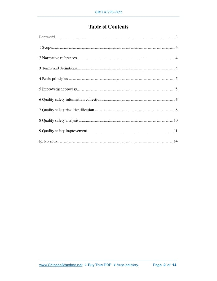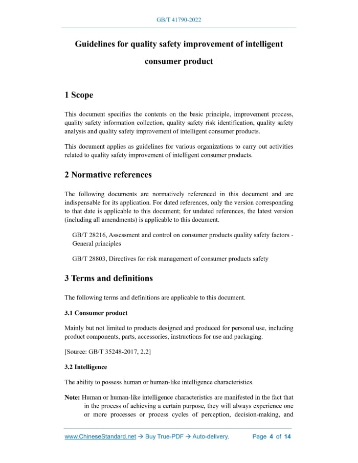 Similar standardsGB/T 41790-2022: Guidelines for quality safety improvement of intelligent consumer product---This is an excerpt. Full copy of true-PDF in English version (including equations, symbols, images, flow-chart, tables, and figures etc.), auto-downloaded/delivered in 9 seconds, can be purchased online: https://www.ChineseStandard.net/PDF.aspx/GBT41790-2022GB NATIONAL STANDARD OF THE PEOPLE’S REPUBLIC OF CHINA ICS 03.120.99 CCS A 00 Guidelines for quality safety improvement of intelligent consumer product ISSUED ON: OCTOBER 12, 2022 IMPLEMENTED ON: OCTOBER 12, 2022 Issued by: State Administration for Market Regulation; Standardization Administration of the People’s Republic of China. Table of ContentsForeword ... 3 1 Scope ... 4 2 Normative references ... 4 3 Terms and definitions ... 4 4 Basic principles ... 5 5 Improvement process ... 5 6 Quality safety information collection ... 6 7 Quality safety risk identification ... 8 8 Quality safety analysis ... 10 9 Quality safety improvement ... 11 References ... 14 Guidelines for quality safety improvement of intelligent consumer product1 ScopeThis document specifies the contents on the basic principle, improvement process, quality safety information collection, quality safety risk identification, quality safety analysis and quality safety improvement of intelligent consumer products. This document applies as guidelines for various organizations to carry out activities related to quality safety improvement of intelligent consumer products.2 Normative referencesThe following documents are normatively referenced in this document and are indispensable for its application. For dated references, only the version corresponding to that date is applicable to this document; for undated references, the latest version (including all amendments) is applicable to this document. GB/T 28216, Assessment and control on consumer products quality safety factors - General principles GB/T 28803, Directives for risk management of consumer products safety3 Terms and definitionsThe following terms and definitions are applicable to this document. 3.1 Consumer product Mainly but not limited to products designed and produced for personal use, including product components, parts, accessories, instructions for use and packaging. [Source: GB/T 35248-2017, 2.2] 3.2 Intelligence The ability to possess human or human-like intelligence characteristics. Note: Human or human-like intelligence characteristics are manifested in the fact that in the process of achieving a certain purpose, they will always experience one or more processes or process cycles of perception, decision-making, and execution, and improve their ability to achieve goals and the efficiency and effectiveness to achieve goals. It is believed in this document that, in embodying the human or human-like intelligence characteristics, the abilities and processes of perception, decision-making, execution and learning therein are indispensable. [Source: GB/T 28219-2018, 3.1] 3.3 Quality safety improvement In view of the quality safety risks of products, improve the process of product design, production, storage, transportation, sales, and use to reduce product quality safety risks.4 Basic principlesGuarantee consumers’ informed consent before collecting, analyzing, and using data in the process of user use, and do not violate personal privacy. The quality and safety improvement of intelligent consumer products is a long-term process. By continuously focusing on the quality safety of intelligent consumer products, continuously analyzing relevant data, discovering quality safety risks, and improving the design, production, storage, transportation, sales, and use of intelligent consumer products, continuously improve the quality safety. Conduct a comprehensive analysis of the entire system, starting from the entire life cycle of intelligent consumer products, discover quality safety risks, formulate improvement plans, and comprehensively improve the quality safety of intelligent consumer products.5 Improvement processThe quality safety improvement of intelligent consumer products is based on effective information. Effectively utilize the convenience of information collection in the process of design, production, storage, transportation, sales, and use of intelligent consumer products, use information technology to connect the internal and external processes of the enterprise to realize the data collection and processing of the entire life cycle of intelligent consumer products, accurately identify the quality safety risks of intelligent consumer products, and analyze the causes of the risks, so as to formulate effective measures to improve the quality safety of intelligent consumer products. The quality safety risk management of intelligent consumer products should comply with the provisions in GB/T 28803. The quality safety improvement of intelligent consumer products shall be carried out in four cycles, namely, quality safety information collection, quality safety risk -- place of use; -- ambient temperature of the environment; -- air humidity of the environment; -- indoor or outdoor; -- other use environment data. Own state data may include: -- various indicators of the intelligent consumer product in the event of quality safety accidents; -- use; -- use duration and frequency; -- other own state data. Other data may include: -- supervision and spot check data; -- online public opinion monitoring data; -- complaint reporting data; -- recall notification data, etc.7 Quality safety risk identificationAccording to the data collected in the whole life cycle of intelligent consumer products, clarify the existence of quality safety risks of intelligent consumer products; judge and sort out the faced and potential risks; identify the nature of the risks. On the basis of following the principles of information integrity and intelligence, comprehensively identify the quality safety risks of components such as 