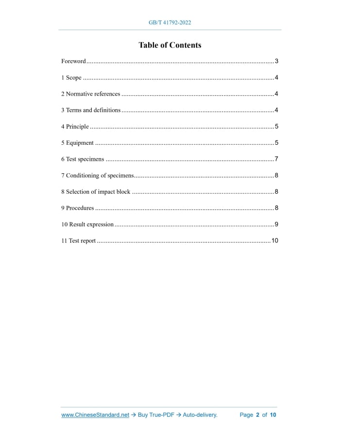 Similar standardsGB/T 41792-2022: Plastics - Film and sheeting - Determination of cold-crack temperature---This is an excerpt. Full copy of true-PDF in English version (including equations, symbols, images, flow-chart, tables, and figures etc.), auto-downloaded/delivered in 9 seconds, can be purchased online: https://www.ChineseStandard.net/PDF.aspx/GBT41792-2022GB NATIONAL STANDARD OF THE PEOPLE’S REPUBLIC OF CHINA ICS 83.140.10 CCS G 33 GB/T 41792-2022 / ISO 8570:1991 Plastics - Film and sheeting - Determination of cold-crack temperature (ISO 8570:1991, IDT) ISSUED ON: OCTOBER 12, 2022 IMPLEMENTED ON: MAY 01, 2023 Issued by: State Administration for Market Regulation; Standardization Administration of the People’s Republic of China. Table of ContentsForeword ... 3 1 Scope ... 4 2 Normative references ... 4 3 Terms and definitions ... 4 4 Principle ... 5 5 Equipment ... 5 6 Test specimens ... 7 7 Conditioning of specimens ... 8 8 Selection of impact block ... 8 9 Procedures ... 8 10 Result expression ... 9 11 Test report ... 10 Plastics - Film and sheeting - Determination of cold-crack temperature1 ScopeThis document describes a method for evaluating the brittleness of plastic films and sheeting at low temperature. The cold-crack temperature is usually used to compare the low temperature performance of plastic film and sheeting, which is used a reference for evaluation in this document. This document applies to the characterization of finished products of a given thickness and pattern, regardless of the composition of their raw materials. Data derived from this document may not be transferred without limitation to any other type of application or condition.2 Normative referencesThe following documents are normatively referenced in this document and are indispensable for its application. For dated references, only the version corresponding to that date is applicable to this document; for undated references, the latest version (including all amendments) is applicable to this document. ISO 291, Plastics - Standard atmospheres for conditioning and testing Note: GB/T 2918-2018, Plastics - Standard atmospheres for conditioning and testing (ISO 291:2008, MOD) ISO 4593, Plastics - Film and sheeting - Determination of thickness by mechanical scanning Note: GB/T 6672-2001, Plastics film and sheeting - Determination of thickness by mechanical scanning (ISO 4593:1993, IDT)3 Terms and definitionsThe following terms and definitions are applicable to this document. 3.1 Cold-crack temperature The temperature at which 50% of the test specimens rupture or show damage when tested according to the method specified in this document.4 PrinciplePlace the test specimen bent into a ring in the cooling chamber to make it withstand the instantaneous folding caused by the impact of the free fall of the impact block. Repeat the test at temperatures in steps of 5 °C, starting when no test specimens are ruptured or damaged, and ending when all test specimens are ruptured or damaged.5 EquipmentFigure 1 is a schematic diagram of a typical test setup. Other devices of the same physical principles can also be used. Figure 2 shows a schematic diagram of another applicable design scheme. 5.1 Impact device 5.1.1 Specimen holder Fasten one or more test specimens on the specimen table through clamps (such as leaf springs); clamp each test specimen along its entire width (15 mm) and ensure that each end of the specimen ring is clamped for a length of 10 mm (see Figure 1), so that the specimen ring bears the folded portion of the length of 40 mm. The specimen table may be equipped with a device (such as revolving type) so that each specimen can be accurately rotated to the test position located under the impact block guide sleeve. Another possibility is to install the test device with guide sleeves each provided with its own impact block. The guide tubes can be arranged in a row or in a circle, depending on the space permitting of the cooling chamber. 5.1.2 Rigid anvil Rigid anvils may be attached to, or form part of, the specimen table on which the specimen is in the test position. 5.1.3 Two impact blocks The masses of the two impact blocks are 200 g and 500 g, respectively. The impact block is a metal cylinder with a diameter of 18 mm ~ 29 mm, and the edge of the lower surface is slightly curved. The test specimens shall be composed of strips with a size of 60 mm × 15 mm. The edge of test specimens shall be free from cuts, scratches and other defects. The thickness shall be measured according to ISO 4593. 6.2 Sampling For each temperature, take 10 test specimens whose long side (60 mm) is parallel to the longitudinal direction of the sample and 10 test specimens whose long side is parallel to the transverse direction of the sample. All specimens shall be taken at least 150 mm from the edge and more than 1 m from the beginning and end of the roll.7 Conditioning of specimensBow the test specimens into a ring shape and install them on the specimen holder. If the specimen film or sheeting is printed or textured on one side, this side shall be on the outside of the ring. The installed test specimens shall be conditioned for at least 3 hours in an environment specified in ISO 291.8 Selection of impact blockWhere the impact block is not pre-agreed, if an impact block of 200 g is sufficient to effectively fold the specimen, start the test with this impact block, otherwise, use an impact block of 500 g. The following specification can be used to verify effective folding. Bend a paper strip (approximately 70 g/m2) of the same size as the test specimen into a ring and place it in the specimen ring. According to the steps in Chapter 9, use a 200 g impact block to test the plastic/paper composite specimen, and use a temperature slightly higher than the cold-crack temperature to prevent the specimen from cracking. Check the paper strip, a sharp crease at the top of the ring indicates an effective folding.9 Procedures9.1 Align the gui
