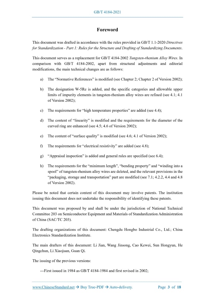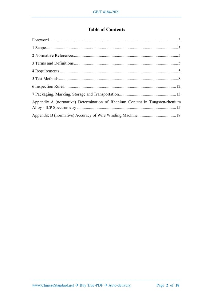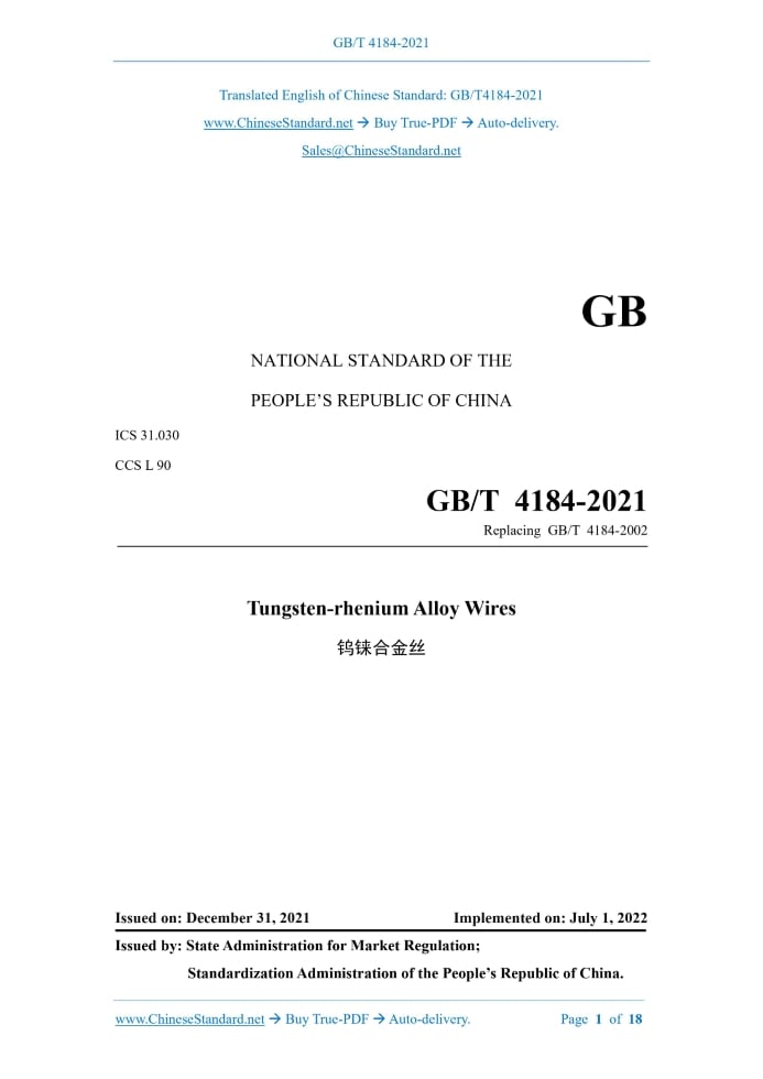 Similar standardsGB/T 4184-2021: Tungsten-rhenium alloy wires---This is an excerpt. Full copy of true-PDF in English version (including equations, symbols, images, flow-chart, tables, and figures etc.), auto-downloaded/delivered in 9 seconds, can be purchased online: https://www.ChineseStandard.net/PDF.aspx/GBT4184-2021GB NATIONAL STANDARD OF THE PEOPLE’S REPUBLIC OF CHINA ICS 31.030 CCS L 90 Replacing GB/T 4184-2002 Tungsten-rhenium Alloy Wires Issued on: DECEMBER 31, 2021 Implemented on: JULY 1, 2022 Issued by. State Administration for Market Regulation; Standardization Administration of the People’s Republic of China. Table of ContentsForeword... 3 1 Scope... 5 2 Normative References... 5 3 Terms and Definitions... 5 4 Requirements... 5 5 Test Methods... 8 6 Inspection Rules... 12 7 Packaging, Marking, Storage and Transportation... 13 Appendix A (normative) Determination of Rhenium Content in Tungsten-rhenium Alloy - ICP Spectrometry... 15 Appendix B (normative) Accuracy of Wire Winding Machine... 18ForewordThis document was drafted in accordance with the rules provided in GB/T 1.1-2020 Directives for Standardization - Part 1.Rules for the Structure and Drafting of Standardizing Documents. This document serves as a replacement for GB/T 4184-2002 Tungsten-rhenium Alloy Wires. In comparison with GB/T 4184-2002, apart from structural adjustments and editorial modifications, the main technical changes are as follows. a) The “Normative References” is modified (see Chapter 2; Chapter 2 of Version 2002); b) The designation W-5Re is added, and the specific categories and allowable upper limits of impurity elements in tungsten-rhenium alloy wires are refined (see 4.1; 4.1 of Version 2002); c) The requirements for “high temperature properties” are added (see 4.4); d) The content of “linearity” is modified and the requirements for the diameter of the curved ring are enhanced (see 4.5; 4.6 of Version 2002); e) The content of “surface quality” is modified (see 4.6; 4.1 of Version 2002); f) The requirements for “electrical resistivity” are added (see 4.8); g) “Appraisal inspection” is added and general rules are specified (see 6.4); h) The requirements for the “minimum length”, “bending property” and “winding into a spool” of tungsten-rhenium alloy wires are deleted, and the relevant provisions in the “packaging, storage and transportation” part are modified (see 7.1; 4.2.2, 4.4 and 4.8 of Version 2002). Please be noted that certain content of this document may involve patents. The institution issuing this document does not undertake the responsibility of identifying these patents. This document was proposed by and shall be under the jurisdiction of National Technical Committee 203 on Semiconductor Equipment and Materials of Standardization Administration of China (SAC/TC 203). The drafting organizations of this document. Chengdu Hongbo Industrial Co., Ltd.; China Electronics Standardization Institute. The main drafters of this document. Li Jian, Wang Jinsong, Cao Kewei, Sun Hongyun, He Qingchun, Li Xiaojuan, Guan Qi. The issuing of the previous versions. ---First issued in 1984 as GB/T 4184-1984 and first revised in 2002; Tungsten-rhenium Alloy Wires1 ScopeThis document specifies the designations, requirements, test methods, inspection rules, packaging, marking, transportation and storage of tungsten-rhenium alloy wires. This document is applicable to the production of tungsten-rhenium alloy wires for electric light source filaments, vacuum electron device hot wires, grid electrodes and supports.2 Normative ReferencesThe contents of the following documents constitute indispensable clauses of this document through the normative references in the text. In terms of references with a specified date, only versions with a specified date are applicable to this document. In terms of references without a specified date, the latest version (including all the modifications) is applicable to this document. GB/T 228.1 Metallic Materials - Tensile Testing - Part 1.Method of Test at Room Temperature GB/T 4324 (all parts) Methods for Chemical Analysis of Tungsten YS/T 502 Determination of Rhenium in Tungsten-Rhenium Alloy - Diacetyl Oxime Colorimetric Method3 Terms and DefinitionsThis document does not have terms and definitions that need to be defined.4 Requirements4.1 Chemical Composition In accordance with chemical composition, tungsten-rhenium alloy wires are divided into three designations. W-1Re, W-3Re and W-5Re. The chemical composition of tungsten-rhenium alloy wires shall comply with the provisions in Table 1. Electrical resistivity 4.8 5.8 6.4.3 Disqualification judgment If the sample under test passes the inspection of all items listed in Table 10, then, it is judged as qualified. If it fails in the inspection of one or more items, then, it is judged as disqualified. 6.5 Quality Conformity Inspection 6.5.1 Inspection items The quality conformity inspection items shall be carried out in accordance with Table 10. 6.5.2 Inspection batch Products of the same designation, same raw materials, same process, same production batch number and same production period are one inspection batch. 6.5.3 Sampling and qualification judgment Group A and Group B are subject to 100% inspection and disqualified products are eliminated. Group C inspection is carried out on one specimen randomly taken from each inspection batch. If one or more results fail to comply with the requirements, double sampling shall be performed in the inspection batch and the disqualified items shall be inspected. If one or more results still fail to comply with the requirements, then, the batch will be judged as disqualified. 6.6 Re-inspection The demand-side shall conduct re-inspection in accordance with this document within three months from the date of receipt of the product. If the inspection result is inconsistent with the product certificate or product quality certificate, an appraisal or inspectio