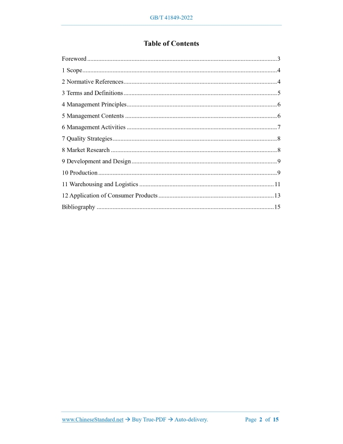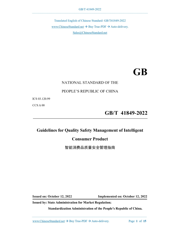 Similar standardsGB/T 41849-2022: Guidelines for quality safety management of intelligent consumer product---This is an excerpt. Full copy of true-PDF in English version (including equations, symbols, images, flow-chart, tables, and figures etc.), auto-downloaded/delivered in 9 seconds, can be purchased online: https://www.ChineseStandard.net/PDF.aspx/GBT41849-2022GB NATIONAL STANDARD OF THE PEOPLE’S REPUBLIC OF CHINA ICS 03.120.99 CCS A 00 Guidelines for Quality Safety Management of Intelligent Consumer Product ISSUED ON: OCTOBER 12, 2022 IMPLEMENTED ON: OCTOBER 12, 2022 Issued by: State Administration for Market Regulation; Standardization Administration of the People’s Republic of China. Table of ContentsForeword ... 3 1 Scope ... 4 2 Normative References ... 4 3 Terms and Definitions ... 5 4 Management Principles ... 6 5 Management Contents ... 6 6 Management Activities ... 7 7 Quality Strategies ... 8 8 Market Research ... 8 9 Development and Design ... 9 10 Production ... 9 11 Warehousing and Logistics ... 11 12 Application of Consumer Products ... 13 Bibliography ... 15 Guidelines for Quality Safety Management of Intelligent Consumer Product1 ScopeThis document provides the principles, contents, management activities, quality strategies, market research, development and design, production, warehousing and logistics, and consumer product applications of quality safety management of intelligent consumer product. This document is applicable to various quality safety management activities of intelligent consumer product carried out by organizations.2 Normative ReferencesThe contents of the following documents constitute indispensable clauses of this document through the normative references in the text. In terms of references with a specified date, only versions with a specified date are applicable to this document. In terms of references without a specified date, the latest version (including all the modifications) is applicable to this document. GB/T 20002.4 Drafting for Special Aspects in Standards - Part 4: Safety Aspects for Their Inclusion in Standards GB/T 20269 Information Security Technology - Information System Security Management Requirements GB/T 22239 Information Security Technology - Baseline for Classified Protection of Cybersecurity GB/T 22760 Consumer Product Safety - General Principles for Risk Assessment GB/T 25321 Guidelines for Manufacture Management of Safer Consumer Products GB/T 28216 Assessment and Control on Consumer Products Quality Safety Factors - General Principles GB/T 28219 General Technology Requirements for Intelligent Household Appliances GB/T 34400 Consumer Product Recall - Guidelines for Manufacturers GB/T 35248-2017 Consumer Product Safety - Guidelines for Suppliers GB/T 35253 Dividing Principles of Risk Warning on Product Quality Safety d) Functional safety, including emergency functions, authorized function terminals, storage and query functions, information storage function, and prevention of illegal operation and mis-operation, etc.6 Management Activities6.1 Overview 6.1.1 The manufacturer of intelligent consumer products should establish a consumer product safety management system that complies with the requirements of GB/T 25321. 6.1.2 The responsibilities and functions of quality safety management should be solidified into the information system that supports the various links: production, management and service. In addition, the quality management system shall comprehensively control the quality, and information sharing shall be realized in the production, management and service links of intelligent consumer products. 6.1.3 Among the manufacturers, consumers, quality inspection personnel and other interested parties of intelligent consumer products, quality information should be transmitted throughout the supply chain in a specific mode. 6.2 Information-oriented Integration 6.2.1 It is advisable to establish a quality information platform to promote information exchange and sharing in quality management, and realize information integration. The manufacturer of intelligent consumer products takes the public database as the essential storage system, the market environment, demands and after-sales feedback information as the input information, and the design, manufacturing and sales sub-modules as the control objects to perform distributed information control on the execution units. 6.2.2 Information-oriented integration control should carry out information integration in accordance with the formation process of the quality of intelligent consumer products. 6.3 Process-oriented Integration 6.3.1 In the face of the whole life cycle of intelligent consumer products, it is advisable to establish a process-oriented integrated management system to perform quality prediction and diagnosis. The process-oriented integration includes two aspects: a) Longitudinal integration covering the whole life cycle operation process of intelligent consumer products; b) Transverse integration supporting parallel collaborative design and manufacturing of intelligent consumer products. 6.3.2 Process-oriented integration should be realized through technology integration, functional integration and organizational integration: a) Technology integration is the integration that utilizes technologies like data mining, artificial intelligence and large-scale database to improve the response and adaptability to the production process; b) Functional integration is a technology of integration formed by organically integrating various functions and methods, such as: design, production management, quality management and sales management, etc.; c) Organizational integration is the integration of technological innovation bodies that integrate personnel from different departments, such as: design, process and manufacturing, etc. 6.4 Network-oriented Integration The manufacturer of intelligent consumer products should comprehensively utilize methods and technologies, such as: a