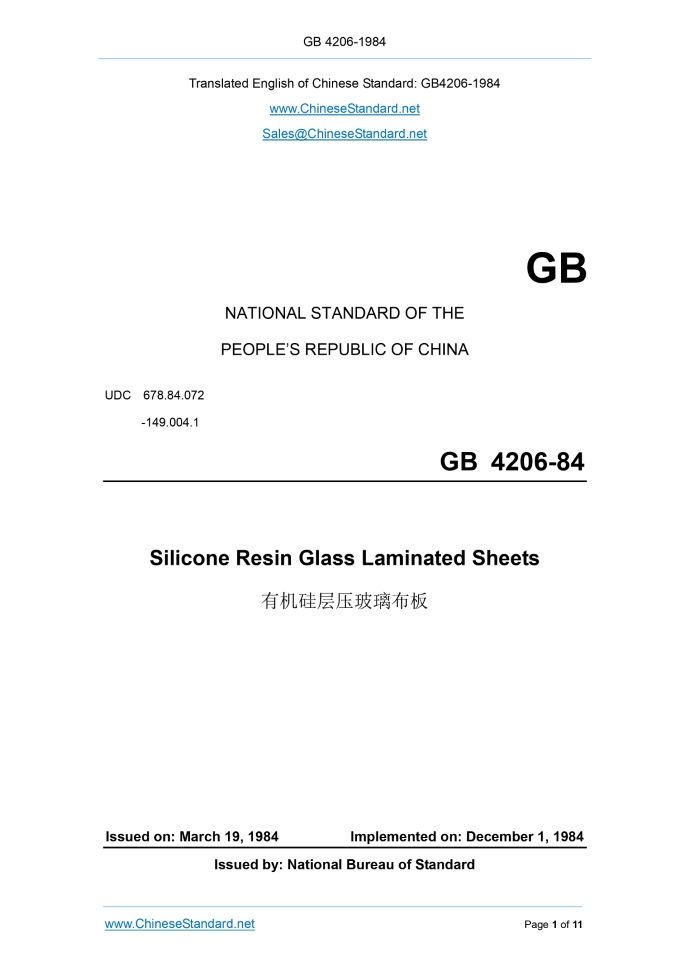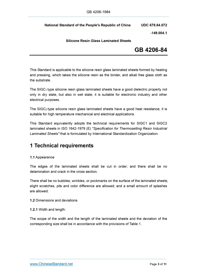 Similar standardsGB/T 4206-1984: Silicone resin glass laminated sheets---This is an excerpt. Full copy of true-PDF in English version (including equations, symbols, images, flow-chart, tables, and figures etc.), auto-downloaded/delivered in 9 seconds, can be purchased online: https://www.ChineseStandard.net/PDF.aspx/GBT4206-1984GB NATIONAL STANDARD OF THE PEOPLE’S REPUBLIC OF CHINA UDC 678.84.072 -149.004.1 GB 4206-84 Silicone Resin Glass Laminated Sheets Issued on: MARCH 19, 1984 Implemented on: DECEMBER 1, 1984 Issued by. National Bureau of Standard Table of Contents1 Technical requirements... 3 2 Test methods... 6 3 Inspection rules... 11 4 Marking, packaging, transportation, storage... 11 Additional Explanation... 11 National Standard of the People's Republic of China UDC 678.84.072 -149.004.1 Silicone Resin Glass Laminated Sheets GB 4206-84 This Standard is applicable to the silicone resin glass laminated sheets formed by heating and pressing, which takes the silicone resin as the binder, and alkali free glass cloth as the substrate. The SIGC1 type silicone resin glass laminated sheets have a good dielectric property not only in dry state, but also in wet state; it is suitable for electronic industry and other electrical purposes. The SIGC2 type silicone resin glass laminated sheets have a good heat resistance; it is suitable for high temperature mechanical and electrical applications. This Standard equivalently adopts the technical requirements for SIGC1 and SIGC2 laminated sheets in ISO 1642-1979 (E) "Specification for Thermosetting Resin Industrial Laminated Sheets" that is formulated by International Standardization Organization.1 Technical requirements1.1 Appearance The edges of the laminated sheets shall be cut in order; and there shall be no delamination and crack in the cross section. There shall be no bubbles, wrinkles, or pockmarks on the surface of the laminated sheets; slight scratches, pits and color difference are allowed; and a small amount of splashes are allowed. 1.2 Dimensions and deviations 1.2.1 Width and length. The scope of the width and the length of the laminated sheets and the deviation of the corresponding size shall be in accordance with the provisions of Table 1. 2.2 Appearance The appearance shall be evaluated by eye observation. 2.3 Machining The machining shall be carried out through negotiation by the supplier and the buyer. 2.4 Determination of bending strength of vertical sheet The bending strength of vertical sheet shall be tested according to the test method for bending strength in GB 1304-77 "General Test Method for Electrical Insulation and Thermosetting Laminated Products". The samples shall be cut from the test sheet, 5 samples longitudinally and 5 samples transversely. If the thickness of the test sheet h is more than 10mm, the samples shall be processed to be 10 ± 0.5mm from one side of the sheet. The size of the samples shall be. Length. L = 20hmm 2 (h shall be accurate to 0.02mm) Width. b = 1.5 ± 0.5mm Adjust the support span (L1), to make the L1 = 16hmm, and measure the span to be accurate to be within 0.5%. Place the samples under the conditions of 23 ± 2°C and 45%~55% relative humidity for at least 24 hours; start the test within 3 minutes after taking the samples out of the environment. Apply load to the vertical sheet. Calculate the average values of the longitudinal and transverse directions respectively; take the smaller value as the test result. 2.5 Determination of impact strength (Charpy) The impact strength shall be tested according to the test method for impact strength in GB 1304-77. However, the samples shall be notched. The samples shall be cut from the test sheet, 5 samples longitudinally and 5 samples transversely; the bottom of the notch shall be perpendicular to the sheet; the radius of the circular arc at the bottom edge shall be less than 0.2mm. When cutting samples from the 5~10mm thickness sheets, the thickness of the samples shall be the same as that of the sheets. When cutting samples from the sheet of which the thickness is more than 10mm, the samples shall be cut into 10 ± 0.5mm evenly from both sides; the sizes of the notched samples are as shown in the figure. When the sample thickness is less than 10mm, steel washers shall be placed at the rear of the impact test support, to make the thickness of the samples and the washers to be 10 ± 0.5mm, and the support span to be 70mm. The hammer angle of the testing 2 When the sheet thickness h ≤ 5mm, L = 16h + 20mm. Method for Solid Electrical Insulation Materials". The samples length shall be 100mm; the width shall be 25 ± 0.2mm; and the thickness shall be the same as the test sheet. Take three samples; cut the two long sides of the samples into two parallel planes perpendicular to the surface of the material. Place the samples between two parallel metal plate electrodes; apply voltage to the 25mm wide samples between the two electrodes. For thin material, two samples can be properly placed (that is, to form a proper angle with their long sides) to support the electrodes. The electrodes shall be sufficiently large in size, so as to cover at least 15mm of each side of the samples. The samples shall be treated under the conditions of 50 ± 2°C and relative humidity less than 20% for 24 hours; after the samples cool to room temperature, immerse the samples into the 90 ± 2°C transformer oil for 0.5~1 hour; then carry out the voltage resistance test immediately in the oil for 1 minute. The test result is qualified only when none of the three samples is broken down, expressed in kV. 2.7 Determination of insulation resistance in parallel after immersion The insulation resistance in parallel after immersion shall be tested according to GB 1410-78 "Test Method for Insulation Resistance, Volume Resistance and Surface Resistance Coefficient of Solid Electrical Insulation Materials". The samples length shall be ; the width shall be ; and the thickness shall be the sa