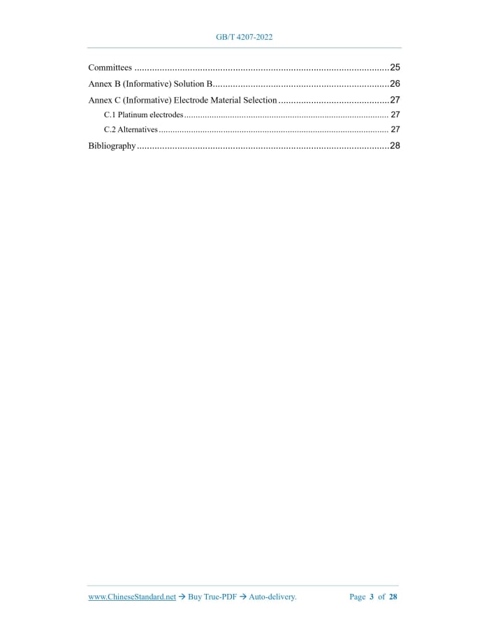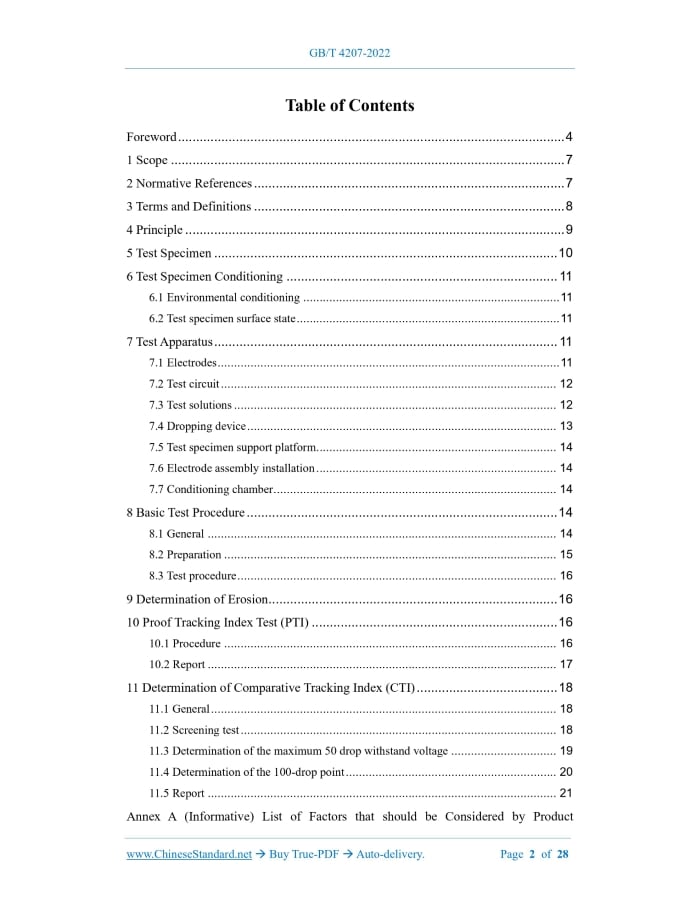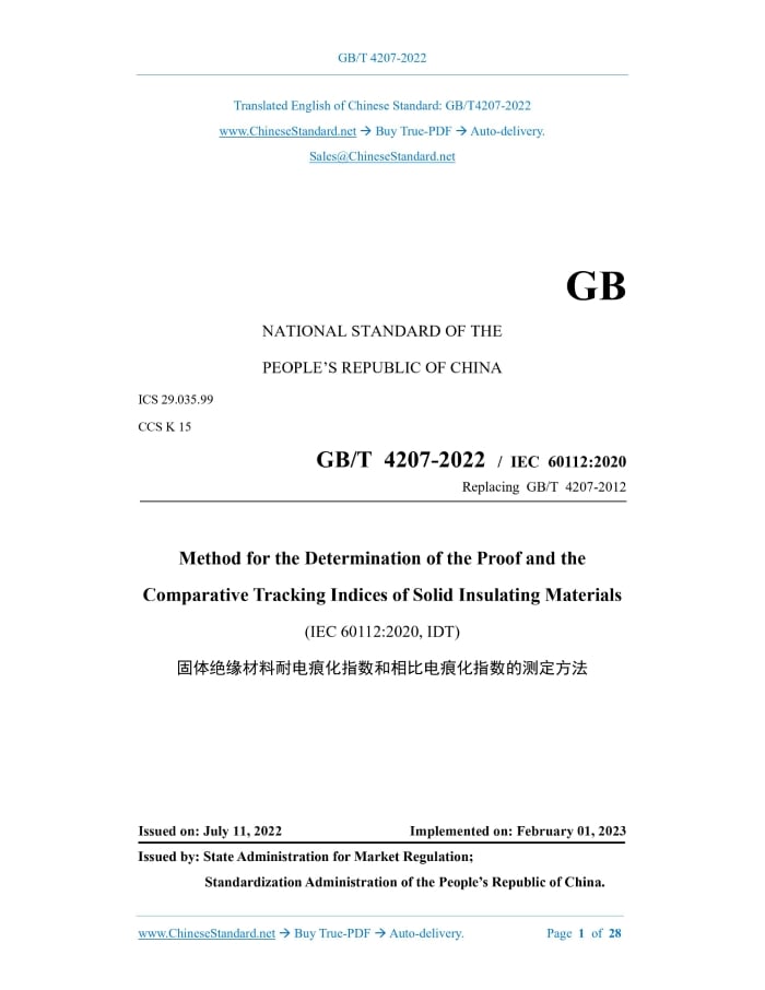 Similar standardsGB/T 4207-2022: Method for the determination of the proof and the comparative tracking indices of solid insulating materials---This is an excerpt. Full copy of true-PDF in English version (including equations, symbols, images, flow-chart, tables, and figures etc.), auto-downloaded/delivered in 9 seconds, can be purchased online: https://www.ChineseStandard.net/PDF.aspx/GBT4207-2022 GB NATIONAL STANDARD OF THE PEOPLE’S REPUBLIC OF CHINA ICS 29.035.99 CCS K 15 GB/T 4207-2022 / IEC 60112.2020 Replacing GB/T 4207-2012 Method for the Determination of the Proof and the Comparative Tracking Indices of Solid Insulating Materials (IEC 60112.2020, IDT) Issued on. JULY 11, 2022 Implemented on. FEBRUARY 01, 2023 Issued by. State Administration for Market Regulation; Standardization Administration of the People’s Republic of China. Table of ContentsForeword... 4 1 Scope... 7 2 Normative References... 7 3 Terms and Definitions... 8 4 Principle... 9 5 Test Specimen... 10 6 Test Specimen Conditioning... 11 6.1 Environmental conditioning... 11 6.2 Test specimen surface state... 11 7 Test Apparatus... 11 7.1 Electrodes... 11 7.2 Test circuit... 12 7.3 Test solutions... 12 7.4 Dropping device... 13 7.5 Test specimen support platform... 14 7.6 Electrode assembly installation... 14 7.7 Conditioning chamber... 14 8 Basic Test Procedure... 14 8.1 General... 14 8.2 Preparation... 15 8.3 Test procedure... 16 9 Determination of Erosion... 16 10 Proof Tracking Index Test (PTI)... 16 10.1 Procedure... 16 10.2 Report... 17 11 Determination of Comparative Tracking Index (CTI)... 18 11.1 General... 18 11.2 Screening test... 18 11.3 Determination of the maximum 50 drop withstand voltage... 19 11.4 Determination of the 100-drop point... 20 11.5 Report... 21 Annex A (Informative) List of Factors that should be Considered by Product Committees... 25 Annex B (Informative) Solution B... 26 Annex C (Informative) Electrode Material Selection... 27 C.1 Platinum electrodes... 27 C.2 Alternatives... 27 Bibliography... 28ForewordThis Document was drafted as per the rules specified in GB/T 1.1-2020 Directives for Standardization – Part 1.Rules for the Structure and Drafting of Standardizing Documents. This Document replaced GB/T 4207-2012 Method for the Determination of the Proof and the Comparative Tracking Indices of Solid Insulating Materials. Compared with GB/T 4207-2012, the major technical changes of this Document are as follows besides the structural adjustment and editorial modifications. a) Add "Description of influence of material composition and surface condition on measurement results" (see Clause 1 of this Edition); b) Add normative reference of "ISO 4287" (see Clause 2 of this Edition); c) Delete the five normative references of "GB/T 17037.1-1997, GB/T 17037.3-2003, IEC 104, ISO 293.1986 and ISO 295.1991" (see Clause 2 of the 2012 Edition); d) Change the notes on the definition of the term "electrical tracking failure" (see 3.2 of this Edition; 3.2 of the 2012 Edition); e) Change the notes on the definition of the term "comparative tracking index"; and add Notes 1 and 4 (see 3.5 of this Edition; 3.5 of the 2012 Edition); f) Add the term and definition of "deionized water" (see 3.8 of this Edition); g) Change the content of the "principle" note (see Clause 4 of this Editon; Clause 4 of the 2012 Edition); h) Change the documents that can be referred to for the sample processing technology in "Specimen"; and add the technical content of Notes 6 and 7 (see Clause 5 of this Edition; Clause 5 of the 2012 Edition); i) Change the definition of ambient temperature in "Environmental Conditions", from "23°C±5 °C" to "(23±2) °C"; and add the requirement to start the test time (see 6.1 of this Edition; see 6.1 of the 2012 Edition); j) Change the description of "Solution A"; delete the requirement for the conductivity of deionized water used to configure the solution; and add Note 2 (see 7.3 of this Edition; 7.3 of the 2012 Edition); k) Change the description of "Solution B" to "See Annex B" (see 7.3 of this Edition; 7.3 of the 2012 Edition); l) Add The composition and ratio requirements, resistivity requirements and surface tension requirements of Solution C (see 7.3 of this Edition; 7.3 of the 2012 Edition); m) Change the technical content of the "drip device"; add the requirement for the target time between drops; and add the content of "Note 2" (see 7.4 of this Edition; 7.4 of the 2012 Edition); n) Add the technical content of "conditioning room" (see 7.7 of this Edition); o) Delete the "requirements for the specified number of specimens" (see 10.1 of the 2012 Edition); p) Change the description of "report of electric tracking index test results" (see 10.2 of this Edition; 10.2 of the 2012 Edition); q) Change the requirements of "Overview" to determine the comparative tracking index; and delete Notes 1 and 2 (see 11.1 of this Edition; 11.1 of the 2012 Edition); r) Add "screening test" (see 11.2 of this Edition); s) Change the technical content of Note 1 in "Measurement of 100 drops of liquid" (see 11.4 of this Edition; 11.2 of the 2012 Edition); t) Change the technical content of "Annex B"; change "Solution B" to recommended "Solution C"; delete the conductivity requirement of deionized water in the technical content of "Solution B"; add "Solution B can be used to replace Solution C to achieve compatibility of test results" (see Annex B of this Edition; 7.3 of the 2012 Edition); u) Change the content of "Selection of electrode material" (see Annex C of this Edition; Annex B of the 2012 Edition). This Document equivalently adopts IEC 60112.2020 Method for the Determination of the Proof and the Comparative Tracking Indices of Solid Insulating Materials. This Document made the minimum editorial modifications as follows. --- Due to editorial errors in the original text, change "(23±5) ℃" in 6.1 to "(23±2) ℃". Please note some contents of this Document may involve patents. The issuing agency of th
