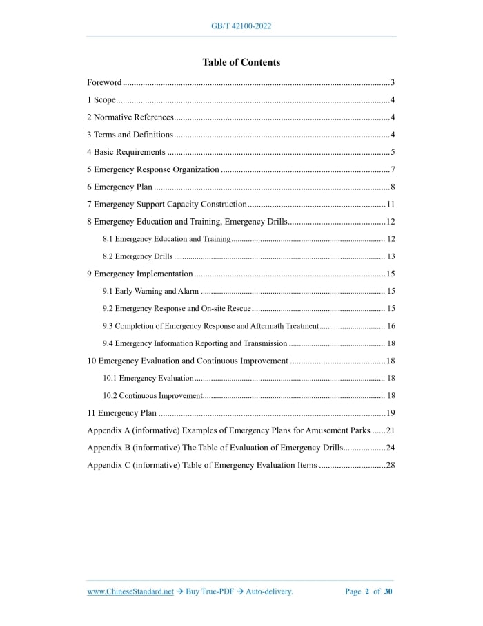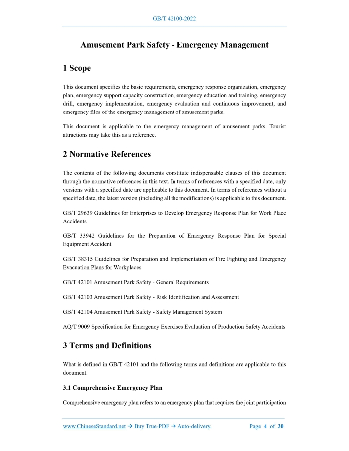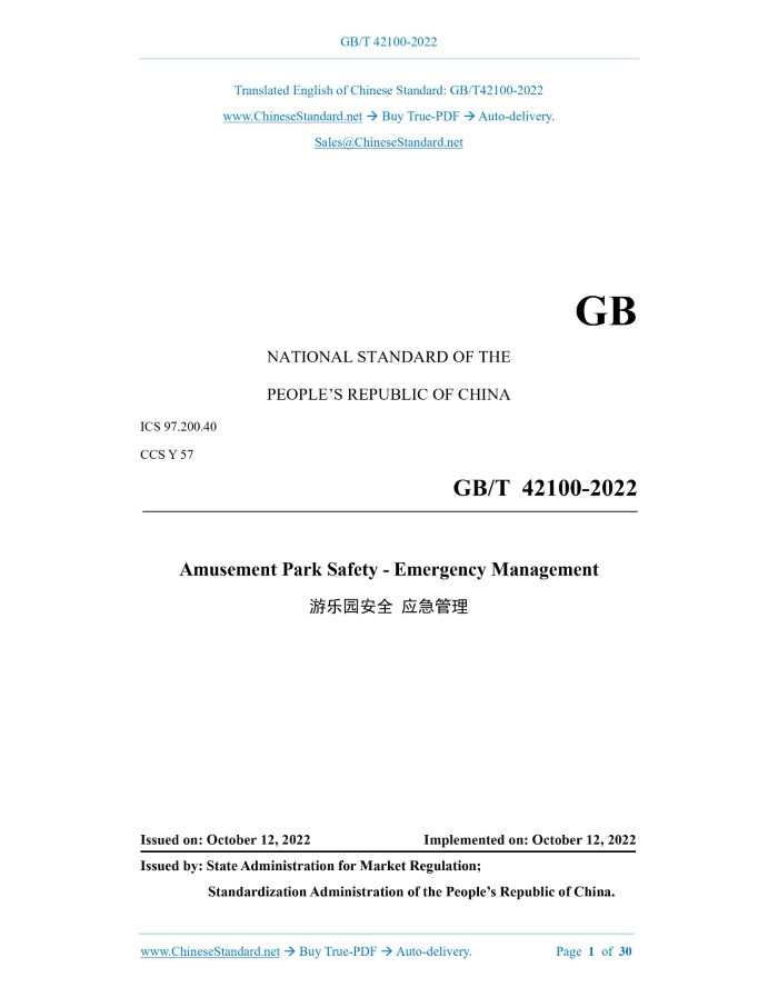 Similar standardsGB/T 42100-2022: Amusement park safety - Emergency management---This is an excerpt. Full copy of true-PDF in English version (including equations, symbols, images, flow-chart, tables, and figures etc.), auto-downloaded/delivered in 9 seconds, can be purchased online: https://www.ChineseStandard.net/PDF.aspx/GBT42100-2022GB NATIONAL STANDARD OF THE PEOPLE’S REPUBLIC OF CHINA ICS 97.200.40 CCS Y 57 Amusement Park Safety - Emergency Management ISSUED ON: OCTOBER 12, 2022 IMPLEMENTED ON: OCTOBER 12, 2022 Issued by: State Administration for Market Regulation; Standardization Administration of the People’s Republic of China. Table of ContentsForeword ... 3 1 Scope ... 4 2 Normative References ... 4 3 Terms and Definitions ... 4 4 Basic Requirements ... 5 5 Emergency Response Organization ... 7 6 Emergency Plan ... 8 7 Emergency Support Capacity Construction ... 11 8 Emergency Education and Training, Emergency Drills ... 12 8.1 Emergency Education and Training ... 12 8.2 Emergency Drills ... 13 9 Emergency Implementation ... 15 9.1 Early Warning and Alarm ... 15 9.2 Emergency Response and On-site Rescue ... 15 9.3 Completion of Emergency Response and Aftermath Treatment ... 16 9.4 Emergency Information Reporting and Transmission ... 18 10 Emergency Evaluation and Continuous Improvement ... 18 10.1 Emergency Evaluation ... 18 10.2 Continuous Improvement... 18 11 Emergency Plan ... 19 Appendix A (informative) Examples of Emergency Plans for Amusement Parks ... 21 Appendix B (informative) The Table of Evaluation of Emergency Drills ... 24 Appendix C (informative) Table of Emergency Evaluation Items ... 28 Amusement Park Safety - Emergency Management1 ScopeThis document specifies the basic requirements, emergency response organization, emergency plan, emergency support capacity construction, emergency education and training, emergency drill, emergency implementation, emergency evaluation and continuous improvement, and emergency files of the emergency management of amusement parks. This document is applicable to the emergency management of amusement parks. Tourist attractions may take this as a reference.2 Normative ReferencesThe contents of the following documents constitute indispensable clauses of this document through the normative references in this text. In terms of references with a specified date, only versions with a specified date are applicable to this document. In terms of references without a specified date, the latest version (including all the modifications) is applicable to this document. GB/T 29639 Guidelines for Enterprises to Develop Emergency Response Plan for Work Place Accidents GB/T 33942 Guidelines for the Preparation of Emergency Response Plan for Special Equipment Accident GB/T 38315 Guidelines for Preparation and Implementation of Fire Fighting and Emergency Evacuation Plans for Workplaces GB/T 42101 Amusement Park Safety - General Requirements GB/T 42103 Amusement Park Safety - Risk Identification and Assessment GB/T 42104 Amusement Park Safety - Safety Management System AQ/T 9009 Specification for Emergency Exercises Evaluation of Production Safety Accidents3 Terms and DefinitionsWhat is defined in GB/T 42101 and the following terms and definitions are applicable to this document. 3.1 Comprehensive Emergency Plan Comprehensive emergency plan refers to an emergency plan that requires the joint participation r) emergency plan and emergency response project. NOTE: the comprehensive emergency plan that has been formulated in accordance with GB/T 29639 is considered as the emergency management program document. 4.5 The amusement parks shall improve the monitoring and early warning of emergencies, and establish an information early warning mechanism based on the actual situation of the organization and the monitoring institutions of relevant government departments. For safety risks that are not monitored by relevant government departments, it is advisable to strength the construction and improvement of the self-monitoring capability. 4.6 The amusement parks shall improve the information release system of “categorized management and graded early warning” to achieve timely early warning and alarm-answering; establish an effective information communication and linkage mechanism with the government emergency management departments and professional emergency rescue teams.5 Emergency Response Organization5.1 The emergency response organization of the amusement parks include the emergency leading group, daily emergency management institution (hereinafter referred to as emergency management institution) and emergency implementation team, whose responsibilities of emergency response shall be respectively clarified. 5.2 The emergency leading group shall be composed of the main person in charge of the organization, the person in charge of the business, the person in charge of special safety and the person in charge of the main department. The emergency management institution should be established by the comprehensive functional department of the amusement park, and composed of personnel in charge of administrative affairs, operations, security, safety management and engineering equipment, etc. The emergency implementation team shall include the emergency command institution, overall emergency command, on-site emergency command and each emergency functional group. 5.3 The leader of the overall emergency command, the on-site emergency command and each emergency functional group in the emergency implementation team shall set up Commander A and Commander B, so as to prevent that the on-site rescue cannot be timely implemented or the rescue cannot be effectively implemented due to lack of personnel in case of emergency. 5.4 The main person in charge of the amusement park shall formally appoint the emergency commanders-in-chief A and B of organizations at all levels, and the on-site emergency commanders A and B, and establish clarified regulations on the following sit