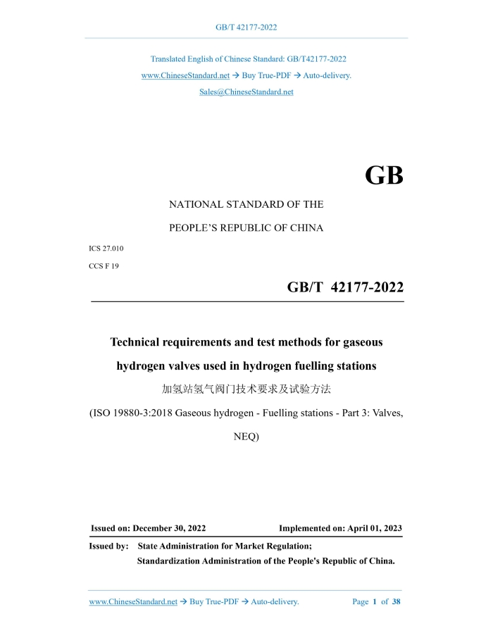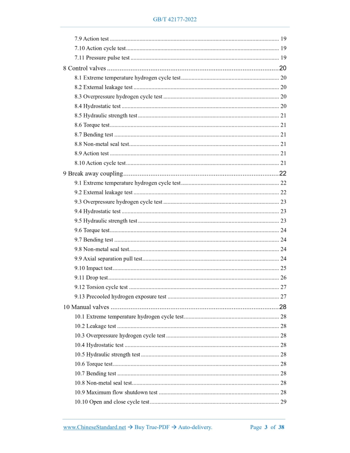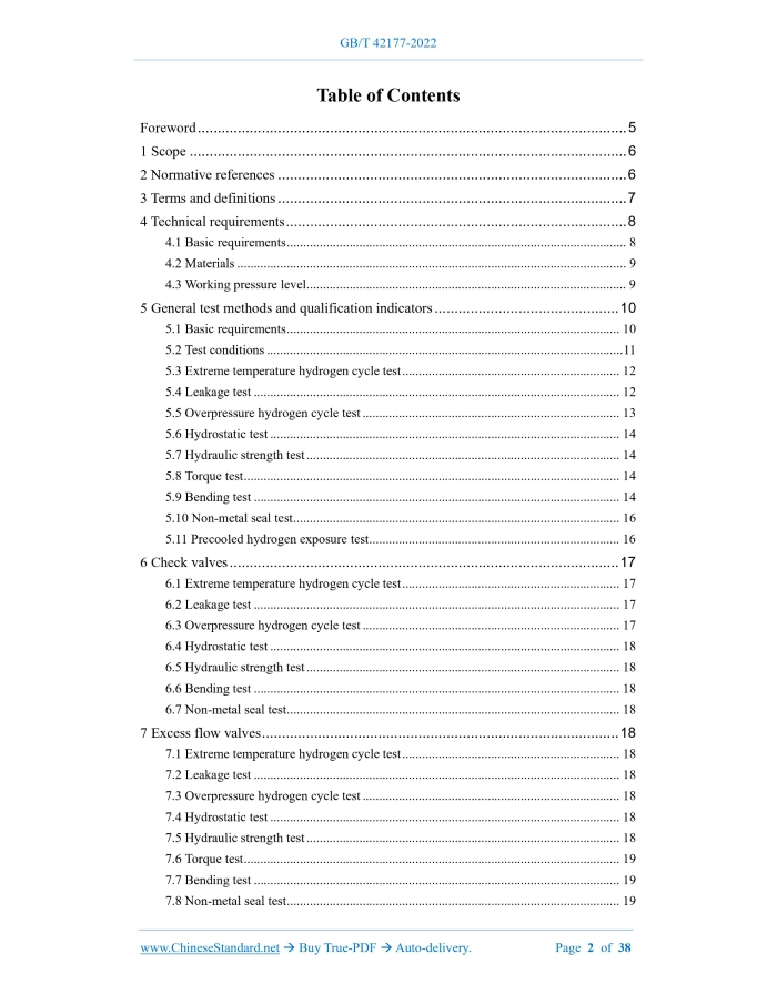 Similar standardsGB/T 42177-2022: Technical requirements and test methods for gaseous hydrogen valves used in hydrogen fuelling stations---This is an excerpt. Full copy of true-PDF in English version (including equations, symbols, images, flow-chart, tables, and figures etc.), auto-downloaded/delivered in 9 seconds, can be purchased online: https://www.ChineseStandard.net/PDF.aspx/GBT42177-2022 GB NATIONAL STANDARD OF THE PEOPLE’S REPUBLIC OF CHINA ICS 27.010 CCS F 19 Technical requirements and test methods for gaseous hydrogen valves used in hydrogen fuelling stations (ISO 19880-3:2018 Gaseous hydrogen - Fuelling stations - Part 3: Valves, NEQ) ISSUED ON: DECEMBER 30, 2022 IMPLEMENTED ON: APRIL 01, 2023 Issued by: State Administration for Market Regulation; Standardization Administration of the People's Republic of China. Table of ContentsForeword ... 5 1 Scope ... 6 2 Normative references ... 6 3 Terms and definitions ... 7 4 Technical requirements ... 8 4.1 Basic requirements ... 8 4.2 Materials ... 9 4.3 Working pressure level ... 9 5 General test methods and qualification indicators ... 10 5.1 Basic requirements ... 10 5.2 Test conditions ... 11 5.3 Extreme temperature hydrogen cycle test ... 12 5.4 Leakage test ... 12 5.5 Overpressure hydrogen cycle test ... 13 5.6 Hydrostatic test ... 14 5.7 Hydraulic strength test ... 14 5.8 Torque test ... 14 5.9 Bending test ... 14 5.10 Non-metal seal test ... 16 5.11 Precooled hydrogen exposure test ... 16 6 Check valves ... 17 6.1 Extreme temperature hydrogen cycle test ... 17 6.2 Leakage test ... 17 6.3 Overpressure hydrogen cycle test ... 17 6.4 Hydrostatic test ... 18 6.5 Hydraulic strength test ... 18 6.6 Bending test ... 18 6.7 Non-metal seal test ... 18 7 Excess flow valves ... 18 7.1 Extreme temperature hydrogen cycle test ... 18 7.2 Leakage test ... 18 7.3 Overpressure hydrogen cycle test ... 18 7.4 Hydrostatic test ... 18 7.5 Hydraulic strength test ... 18 7.6 Torque test ... 19 7.7 Bending test ... 19 7.8 Non-metal seal test ... 19 7.9 Action test ... 19 7.10 Action cycle test ... 19 7.11 Pressure pulse test ... 19 8 Control valves ... 20 8.1 Extreme temperature hydrogen cycle test ... 20 8.2 External leakage test ... 20 8.3 Overpressure hydrogen cycle test ... 20 8.4 Hydrostatic test ... 20 8.5 Hydraulic strength test ... 21 8.6 Torque test ... 21 8.7 Bending test ... 21 8.8 Non-metal seal test ... 21 8.9 Action test ... 21 8.10 Action cycle test ... 21 9 Break away coupling ... 22 9.1 Extreme temperature hydrogen cycle test ... 22 9.2 External leakage test ... 22 9.3 Overpressure hydrogen cycle test ... 23 9.4 Hydrostatic test ... 23 9.5 Hydraulic strength test ... 23 9.6 Torque test ... 24 9.7 Bending test ... 24 9.8 Non-metal seal test ... 24 9.9 Axial separation pull test ... 24 9.10 Impact test ... 25 9.11 Drop test ... 26 9.12 Torsion cycle test ... 27 9.13 Precooled hydrogen exposure test ... 27 10 Manual valves ... 28 10.1 Extreme temperature hydrogen cycle test ... 28 10.2 Leakage test ... 28 10.3 Overpressure hydrogen cycle test ... 28 10.4 Hydrostatic test ... 28 10.5 Hydraulic strength test ... 28 10.6 Torque test ... 28 10.7 Bending test ... 28 10.8 Non-metal seal test ... 28 10.9 Maximum flow shutdown test ... 28 10.10 Open and close cycle test ... 29 10.11 Torque cycle test ... 29 11 Filters ... 30 11.1 Extreme temperature hydrogen cycle test ... 30 11.2 Structural integrity and initial bubble point test ... 30 11.3 Filtration characteristic test of filter element ... 30 11.4 Pressure drop flow characteristic test ... 30 11.5 Flow fatigue characteristics test ... 31 11.6 Rated axial load test ... 31 11.7 Anti-rupture property test ... 31 12 Safety valves ... 31 12.1 Extreme temperature hydrogen cycle test ... 31 12.2 Leakage test ... 32 12.3 Overpressure hydrogen cycle test ... 32 12.4 Hydrostatic test ... 32 12.5 Torque test ... 33 12.6 Bending test ... 33 12.7 Non-metal seal test ... 33 12.8 Action test ... 33 13 Globe valve ... 34 13.1 Extreme temperature hydrogen cycle test ... 34 13.2 Leakage test ... 34 13.3 Overpressure hydrogen cycle test ... 34 13.4 Hydrostatic test ... 34 13.5 Hydraulic strength test ... 34 13.6 Torque test ... 34 13.7 Bending test ... 34 13.8 Non-metal seal test ... 35 13.9 Open and close cycle test ... 35 13.10 Maximum flow shutdown test ... 35 13.11 Precooled hydrogen exposure test ... 35 14 Marks ... 36 14.1 Mark information ... 36 14.2 Marking method ... 37 Bibliography ... 38 Technical requirements and test methods for gaseous hydrogen valves used in hydrogen fuelling stations1 ScopeThis document specifies the technical requirements, test methods, marks and other requirements for gaseous hydrogen valves used in hydrogen fuelling stations (hereinafter referred to as "valves"). This document applies to gaseous hydrogen valves used in hydrogen fuelling stations that meet the following conditions: a) The ambient temperature is -40℃~60℃; b) The hydrogen charging pressure does not exceed 70 MPa at 15°C.2 Normative referencesThe following referenced documents are indispensable for the application of this document. For dated references, only the edition cited applies. For undated references, the latest edition of the referenced document (including any amendments) applies. GB/T 528, Rubber, vulcanized or thermoplastic -- Determination of tensile stress- strain properties GB/T 4213, Pneumatic industrial process control valves GB/T 12220, Industrial valves -- Marking GB/T 12241, Safety valves -- General requirements GB/T 14041.1, Hydraulic fluid power -- Filter elements -- Part 1: Verification of fabrication integrity and determination of the first bubble point GB/T 14041.3, Hydraulic fluid power -- Filter elements -- Part 3: Verification of collapse/burst pressure rating GB/T 14041.4, Hydraulic fluid power -- Filter elements -- Part 4: Method for rated end load test GB/T 17486, Hydraulic fluid power -- Filters -- Evaluation of differential pressure versus flow characteristics GB/T 17488,