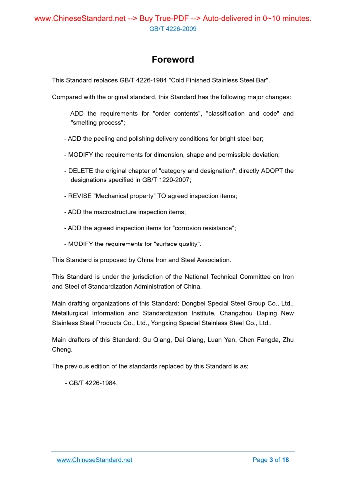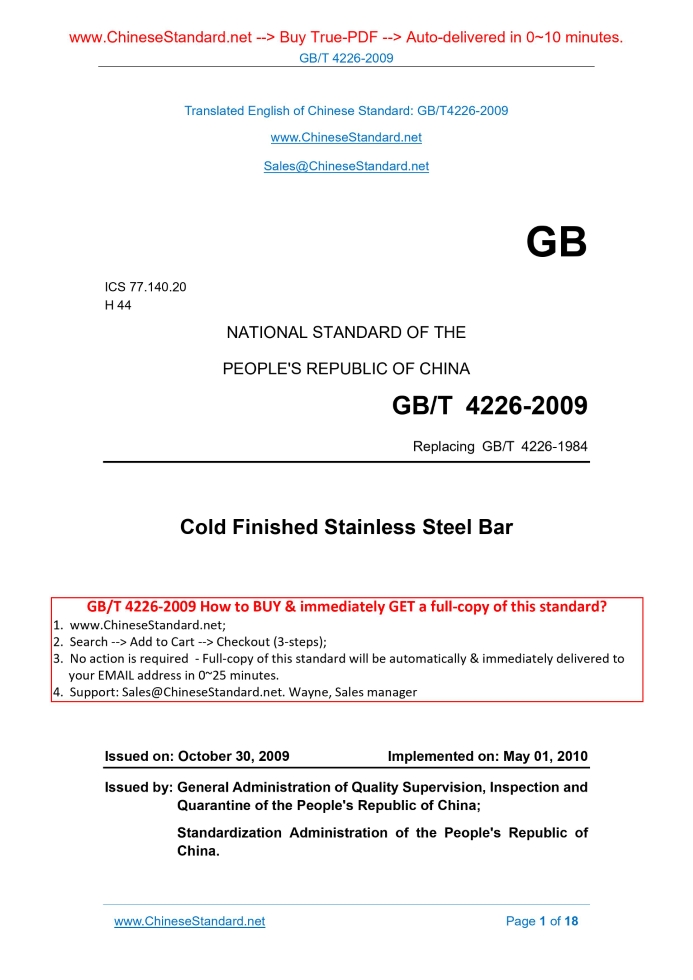 GB/T 4226-2009: Cold finished stainless steel bar Delivery: 9 seconds. True-PDF full-copy in English & invoice will be downloaded + auto-delivered via email. See step-by-step procedure Status: Valid GB/T 4226: Historical versions