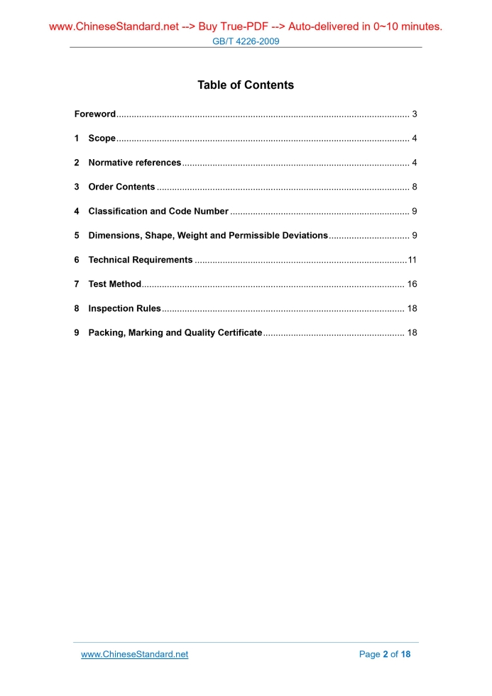 GB/T 4226-2009: Cold finished stainless steel bar---This is an excerpt. Full copy of true-PDF in English version (including equations, symbols, images, flow-chart, tables, and figures etc.), auto-downloaded/delivered in 9 seconds, can be purchased online: https://www.ChineseStandard.net/PDF.aspx/GBT4226-2009GB ICS 77.140.20 H 44 NATIONAL STANDARD OF THE PEOPLE'S REPUBLIC OF CHINA Replacing GB/T 4226-1984 Cold Finished Stainless Steel Bar Issued on. OCTOBER 30, 2009 Implemented on. MAY 01, 2010 Issued by. General Administration of Quality Supervision, Inspection and Quarantine of the People's Republic of China; Standardization Administration of the People's Republic of China. Table of ContentsForeword... 3 1 Scope... 4 2 Normative references... 4 3 Order Contents... 8 4 Classification and Code Number... 9 5 Dimensions, Shape, Weight and Permissible Deviations... 9 6 Technical Requirements... 11 7 Test Method... 16 8 Inspection Rules... 18 9 Packing, Marking and Quality Certificate... 18ForewordThis Standard replaces GB/T 4226-1984 "Cold Finished Stainless Steel Bar". Compared with the original standard, this Standard has the following major changes. - ADD the requirements for "order contents", "classification and code" and "smelting process"; - ADD the peeling and polishing delivery conditions for bright steel bar; - MODIFY the requirements for dimension, shape and permissible deviation; - DELETE the original chapter of "category and designation"; directly ADOPT the designations specified in GB/T 1220-2007; - REVISE "Mechanical property" TO agreed inspection items; - ADD the macrostructure inspection items; - ADD the agreed inspection items for "corrosion resistance"; - MODIFY the requirements for "surface quality". This Standard is proposed by China Iron and Steel Association. This Standard is under the jurisdiction of the National Technical Committee on Iron and Steel of Standardization Administration of China. Main drafting organizations of this Standard. Dongbei Special Steel Group Co., Ltd., Metallurgical Information and Standardization Institute, Changzhou Daping New Stainless Steel Products Co., Ltd., Yongxing Special Stainless Steel Co., Ltd.. Main drafters of this Standard. Gu Qiang, Dai Qiang, Luan Yan, Chen Fangda, Zhu Cheng. The previous edition of the standards replaced by this Standard is as. - GB/T 4226-1984. Cold Finished Stainless Steel Bar1 ScopeThis Standard specifies the order contents, classification and code, dimensions, shape, weight and permissible deviation, technical requirements, test methods, inspection rules, packing, marking and quality certificate for the cold finished stainless steel bar (general term of round steel, square steel, hexagonal steel and flat steel, hereinafter referred to as steel bar). This Standard is applicable to the cold-rolled or cold-drawn round steel, square steel, hexagonal steel, flat steel and bright round steel (peeling, burnishing and polishing) whose dimensions (diameter, side length, distance or width of opposite side, hereinafter referred to as dimension) are not greater than 100mm.2 Normative referencesThe provisions in following documents become the provisions of this Standard through reference in this Standard. For dated references, the subsequent amendments (excluding corrigendum) or revisions do not apply to this Standard, however, parties who reach an agreement based on this Standard are encouraged to study if the latest versions of these documents are applicable. For undated references, the latest edition of the referenced document applies. GB/T 222 Permissible Tolerances for Chemical Composition of Steel Products GB/T 223.3 Methods for Chemical Analysis of Iron, Steel and Alloy - The Diantipyrylmethane Phosphomolybdate Gravimetric Method for the Determination of Phosphorus Content GB/T 223.4 Alloyed Steel - Determination of Manganese Content - Potentiometric or Visual Titration Method GB/T 223.5 Steel and Iron - Determination of Acid-soluble Silicon and Total Silicon Content - Reduced Molybdosilicate Spectrophotometric Method GB/T 223.8 Methods for Chemical Analysis of Iron, Steel and Alloy - The Sodium Fluoride Separation - EDTA Titration Method for the Determination of Aluminium Content GB/T 223.9 Methods for Chemical Analysis of Iron, Steel and Alloy - The Chrom Azurol S Photometric Method for the Determination of Aluminium Content GB/T 223.11 Methods for Chemical Analysis of Iron, Steel and Alloy - The Ammonium Persulfate Oxidation Volumetric Method for the Determination of Chromium Content3 Order ContentsThe contract or order ordering according to this standard shall cover.4 Classification and Code Number4.1 Steels shall be classified into the following two types according to the different application and processing methods. The application and processing method of steel bars shall be noted in the contract and the unnoted one shall be supplied as the steels used for machining. 4.2 The steel bar is classified into the following three types according to the manufacturing operation method.5 Dimensions, Shape, Weight and Permissible Deviations5.1 Nominal dimension of steel bar 5.1.1 Nominal dimension of round steel, square steel and hexagonal steel is according to those specified in Table 1. 5.2 Dimension, shape and permissible deviation of round, square and hexagonal steel 5.2.1 Dimension and permissible deviation of round, square and hexagonal steel shall meet requirements of GB/T 905-1994.The part with nominal dimension greater than 80mm~100mm is according to those specified in Table 3. 5.3 Dimension, shape and permissible deviation of flat steel 5.3.1 Dimension and permissible deviation of flat steel shall meet the requirements of GB/T 905-1994.Dimension and permissible deviation if flat steel with the nominal dimension beyond those specified in GB/T 905-1994 shall meet those specified in Table 3. 5.3.2 The flat steel shall be free from obvious torsion; the circle arc radius or diagonal 5.5 Dimension, shape and per