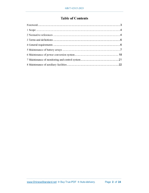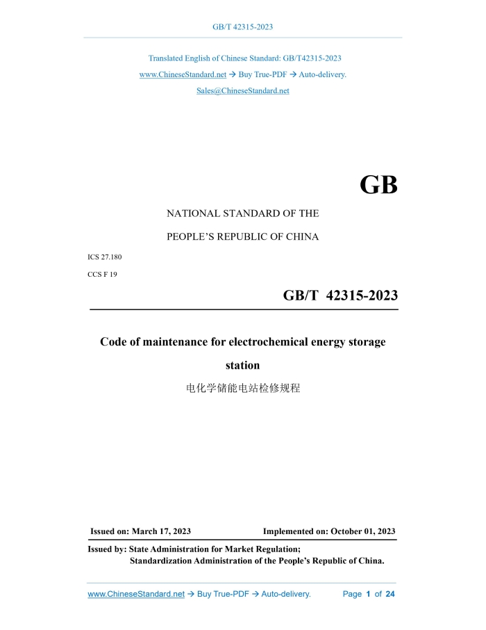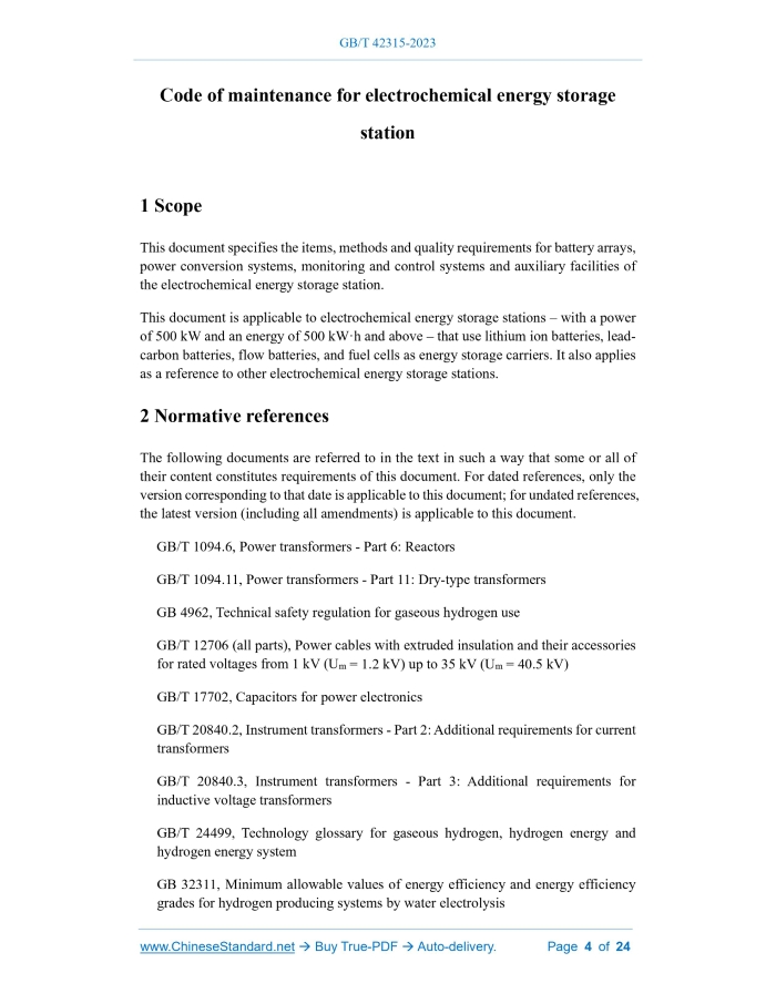 Similar standardsGB/T 42315-2023: Code of maintenance for electrochemical energy storage station---This is an excerpt. Full copy of true-PDF in English version (including equations, symbols, images, flow-chart, tables, and figures etc.), auto-downloaded/delivered in 9 seconds, can be purchased online: https://www.ChineseStandard.net/PDF.aspx/GBT42315-2023GB NATIONAL STANDARD OF THE PEOPLE’S REPUBLIC OF CHINA ICS 27.180 CCS F 19 Code of maintenance for electrochemical energy storage station ISSUED ON: MARCH 17, 2023 IMPLEMENTED ON: OCTOBER 01, 2023 Issued by: State Administration for Market Regulation; Standardization Administration of the People’s Republic of China. Table of ContentsForeword ... 3 1 Scope ... 4 2 Normative references ... 4 3 Terms and definitions ... 6 4 General requirements ... 6 5 Maintenance of battery arrays ... 7 6 Maintenance of power conversion system ... 18 7 Maintenance of monitoring and control system ... 21 8 Maintenance of auxiliary facilities ... 22 Code of maintenance for electrochemical energy storage station1 ScopeThis document specifies the items, methods and quality requirements for battery arrays, power conversion systems, monitoring and control systems and auxiliary facilities of the electrochemical energy storage station. This document is applicable to electrochemical energy storage stations – with a power of 500 kW and an energy of 500 kW·h and above – that use lithium ion batteries, lead- carbon batteries, flow batteries, and fuel cells as energy storage carriers. It also applies as a reference to other electrochemical energy storage stations.2 Normative referencesThe following documents are referred to in the text in such a way that some or all of their content constitutes requirements of this document. For dated references, only the version corresponding to that date is applicable to this document; for undated references, the latest version (including all amendments) is applicable to this document. GB/T 1094.6, Power transformers - Part 6: Reactors GB/T 1094.11, Power transformers - Part 11: Dry-type transformers GB 4962, Technical safety regulation for gaseous hydrogen use GB/T 12706 (all parts), Power cables with extruded insulation and their accessories for rated voltages from 1 kV (Um = 1.2 kV) up to 35 kV (Um = 40.5 kV) GB/T 17702, Capacitors for power electronics GB/T 20840.2, Instrument transformers - Part 2: Additional requirements for current transformers GB/T 20840.3, Instrument transformers - Part 3: Additional requirements for inductive voltage transformers GB/T 24499, Technology glossary for gaseous hydrogen, hydrogen energy and hydrogen energy system GB 32311, Minimum allowable values of energy efficiency and energy efficiency grades for hydrogen producing systems by water electrolysis3 Terms and definitionsTerms and definitions determined by DL/T 2528 and GB/T 24499 are applicable to this document.4 General requirements4.1 Before the maintenance of the electrochemical energy storage station, a maintenance schedule shall be formulated; also, a maintenance plan and an emergency plan shall be compiled. 4.2 The maintenance of the electrochemical energy storage station includes scheduled maintenance and troubleshooting; also, a condition-based maintenance should be carried out according to the operation of the equipment. The cycle of scheduled maintenance – which should be 1 year – can be adjusted according to the assessment results. The condition-based maintenance should be determined according to the comprehensive assessment results of equipment operating status, fault location, fault type and severity based on operating data. 4.3 The maintenance operation shall be carried out in the aspects of appearance inspection, inspection test, repair, post-repair test, etc. in combining with equipment status. An overall performance test of the energy storage system shall be carried out after the replacement of main components such as battery arrays, power conversion systems, and monitoring and control systems. 4.4 The maintenance of primary equipment such as voltage transformers, switches, surge arresters, and transformers shall be carried out in accordance with the provisions of DL/T 573, DL/T 727, DL/T 1686, DL/T 1689, DL/T 1700, and DL/T 1702; the maintenance of secondary equipment such as AC-DC system for station, relay protection and automation, and metering shall be carried out in accordance with the regulations of DL/T 724, DL/T 995, and DL/T 1664. 4.5 Maintenance personnel shall be trained regularly to be familiar with the design requirements, running conditions and equipment technical requirements of the power station, and to master the maintenance skills and quality requirements of the power station equipment. 4.6 Maintenance tools and appliances shall be inspected and calibrated regularly, and used within the inspection and calibration date. 4.7 Maintenance personnel shall prepare spare parts in advance according to the maintenance schedule and order cycle time. 4.8 The maintenance safety of the electrochemical energy storage station shall meet the requirements of GB/T 42288. 4.9 The electrochemical energy storage station shall formulate environmental protection measures during the maintenance process. Waste batteries and electrolytes shall be recycled. 4.10 After the maintenance is completed, a maintenance assessment of the energy storage station shall be carried out, and a maintenance report shall be compiled.5 Maintenance of battery arrays5.1 General provisions 5.1.1 Before the maintenance of battery arrays, the primary circuit AC/DC circuit breaker and isolating switch shall be disconnected, a grounding wire shall be installed on the AC side of the power conversion system, and a safety warning sign shall be hung. 5.1.2 During battery maintenance, the positive and negative poles of battery cells, battery modules, battery clusters, and stacks shall not be short-circuited or reversed. 5.1.3 After the maintenance of lith